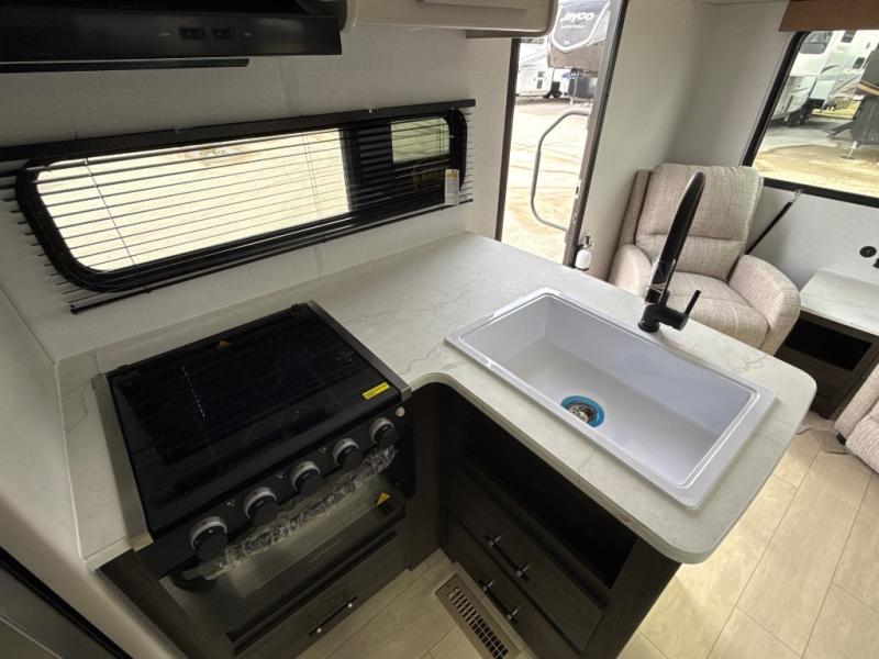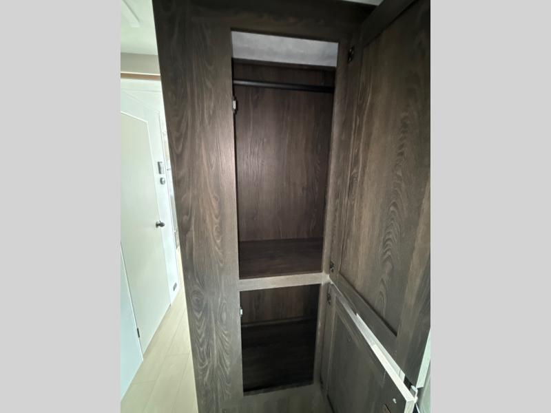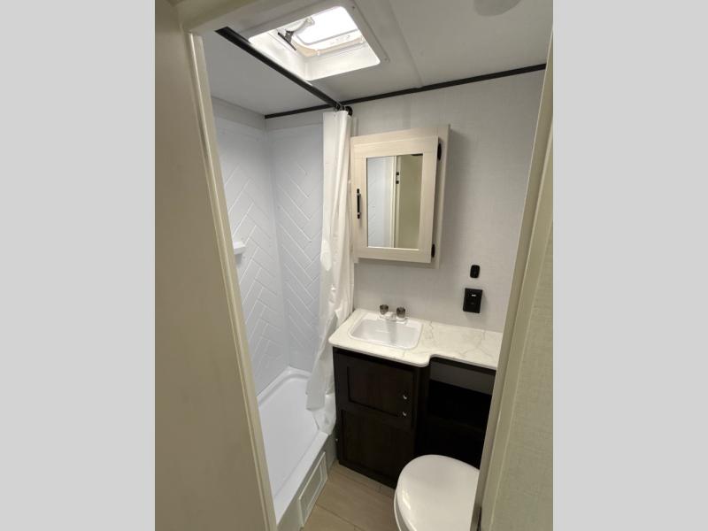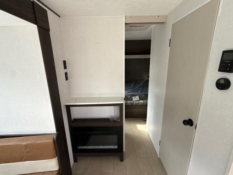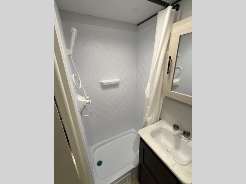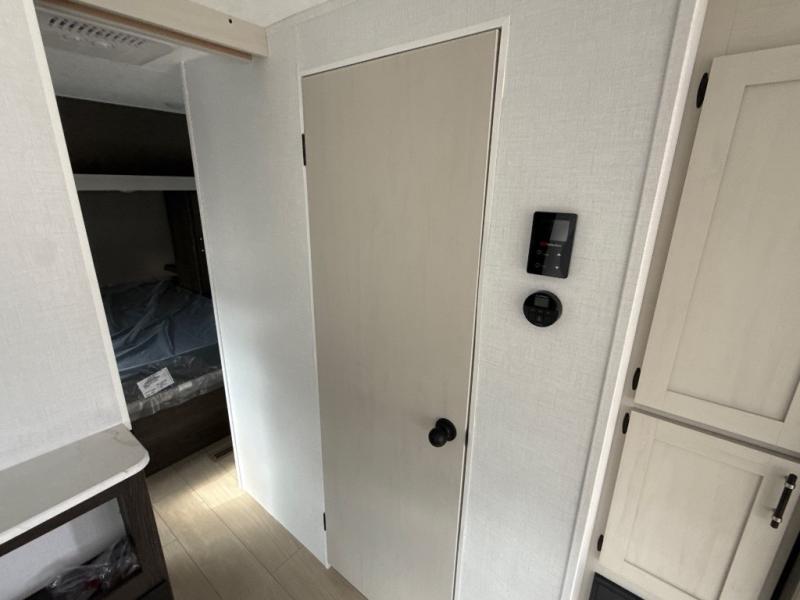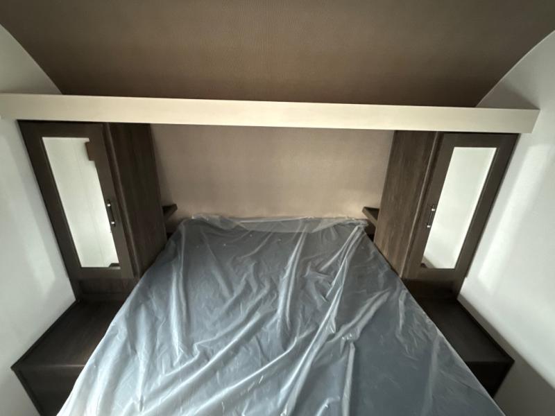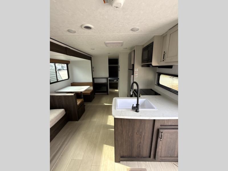 Comfort comes easy in this spacious travel trailer! There is a large slide out in the main living area that houses the booth dinette and jackknife sofa, and there are dual lounge chairs in the back for even more comfort! The chef of your group can whip up their best meals in the full kitchen, and the pantry will let them store snacks, dry goods and more! You'll appreciate having a full bath onboard so you don't have to leave the camper in the middle of the night, and having a front bedroom with a queen bed will make it feel more like home! One of the dual entry doors is even found here so you can slip out in the morning for an early jog!