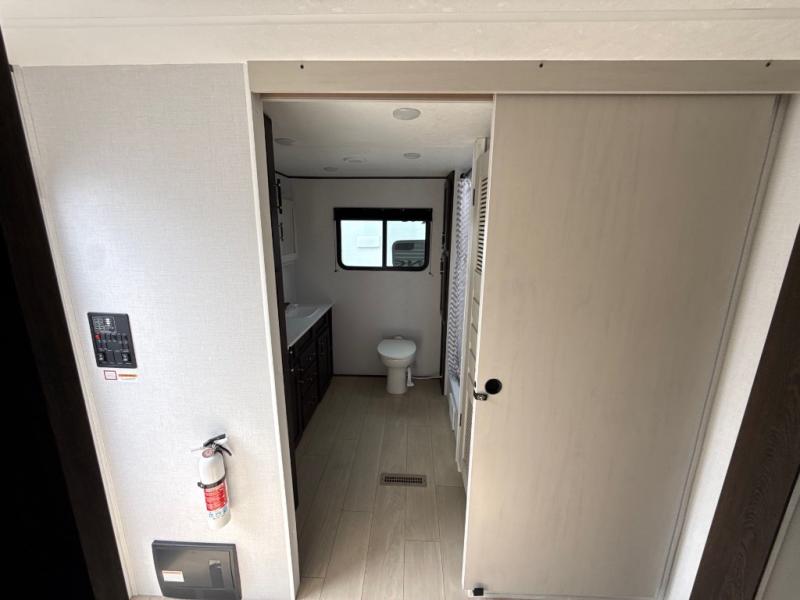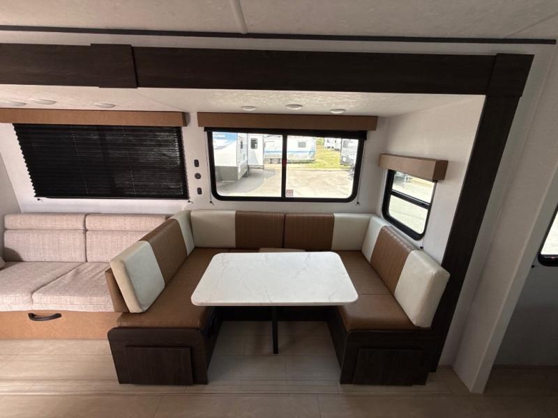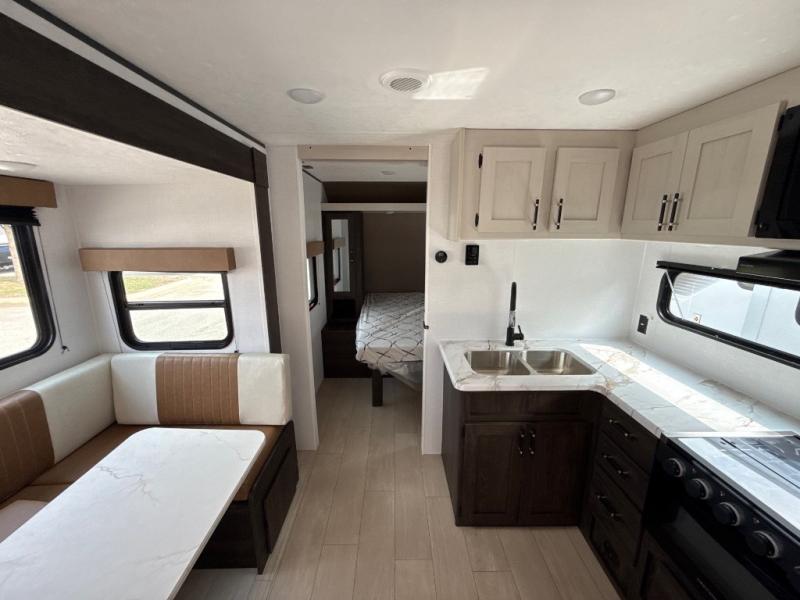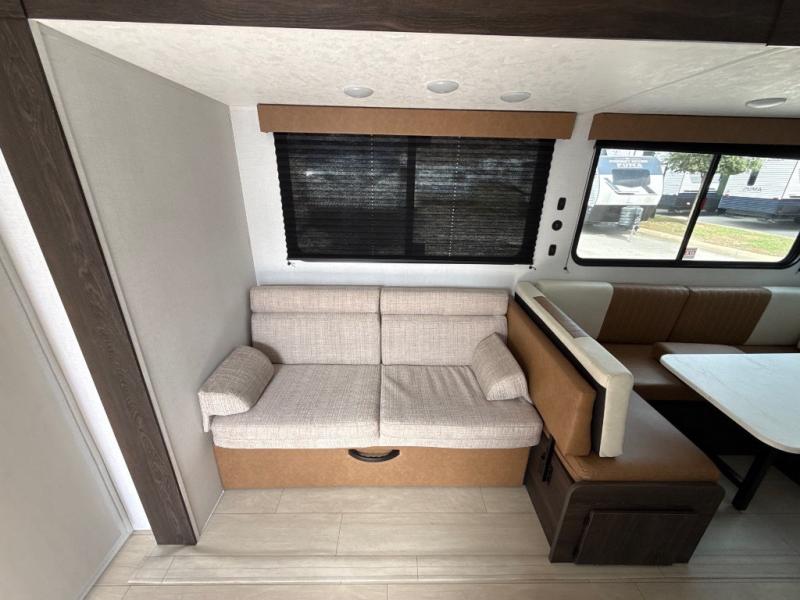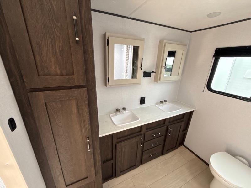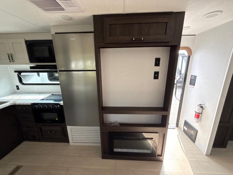 You need this award-winning travel trailer for your next weekend getaway! The full rear bathroom is decked out in features you're going to love like the dual-sink vanity for two to get ready at once, the linen closet next to the 30" x 36" shower and the second linen closet across from the closet with washer and dryer prep. After a fun-filled day outdoors, you can head inside and relax on either the 60" jackknife sofa and enjoy the entertainment center with a fireplace or grab a snack from the 10-cu. ft. refrigerator and play a few card games at the U-shaped dinette. The front private bedroom features a 60" x 74" RV queen bed with shirt closets on either side of it to keep your clothes looking nice!