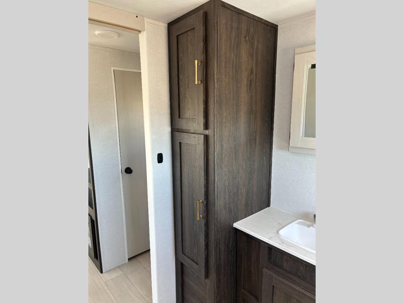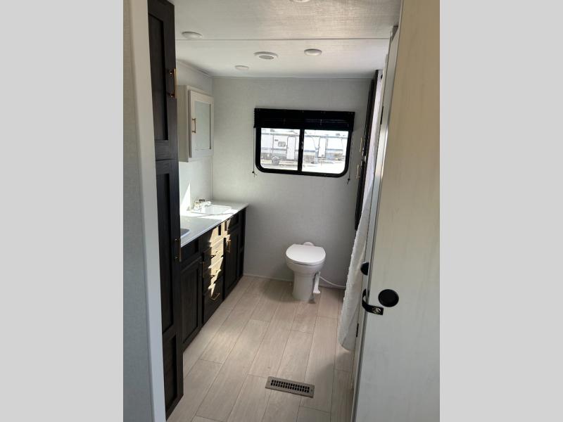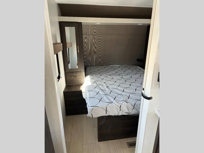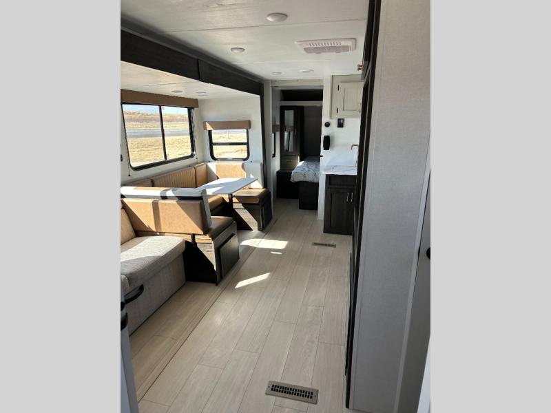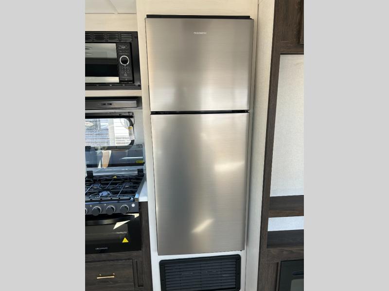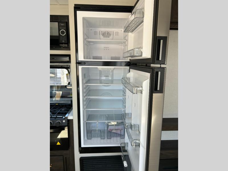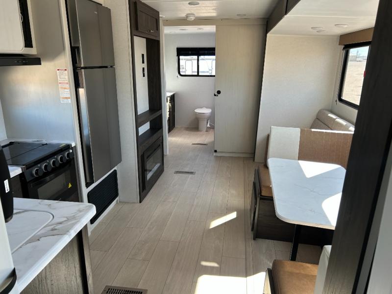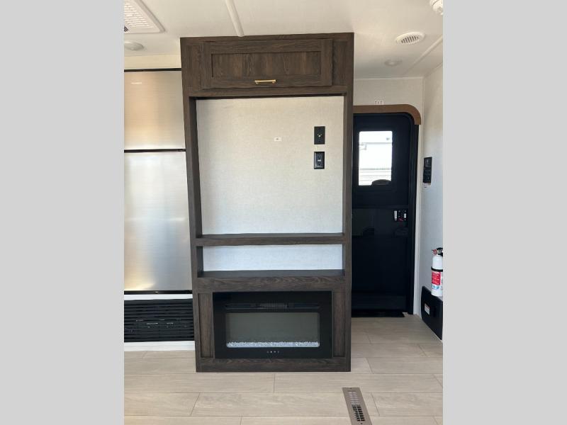 You need this award-winning travel trailer for your next weekend getaway! The full rear bathroom is decked out in features you're going to love like the dual-sink vanity for two to get ready at once, the linen closet next to the 30" x 36" shower and the second linen closet across from the closet with washer and dryer prep. After a fun-filled day outdoors, you can head inside and relax on either the 60" jackknife sofa and enjoy the entertainment center with a fireplace or grab a snack from the 10-cu. ft. refrigerator and play a few card games at the U-shaped dinette. The front private bedroom features a 60" x 74" RV queen bed with shirt closets on either side of it to keep your clothes looking nice!