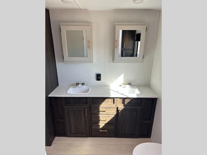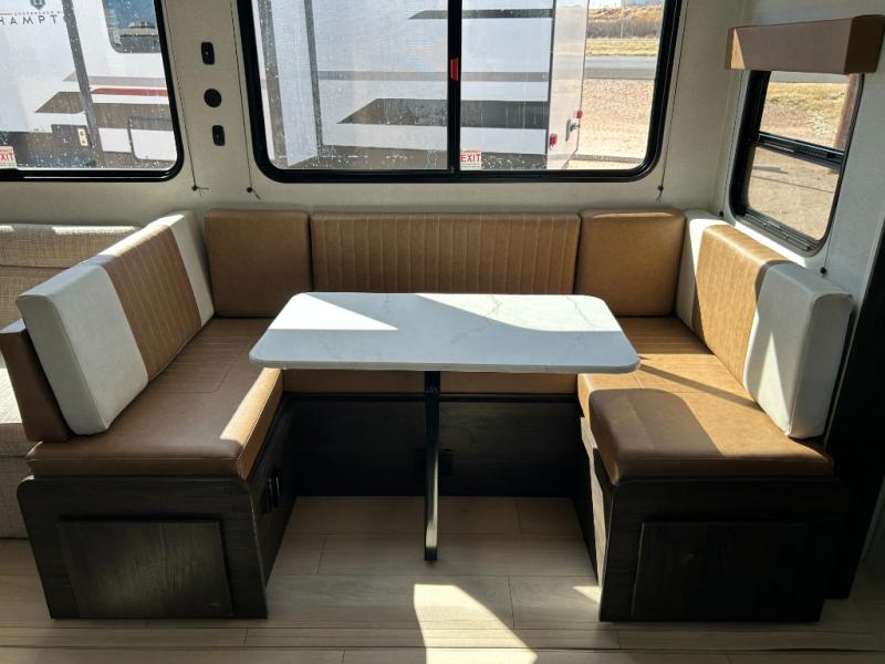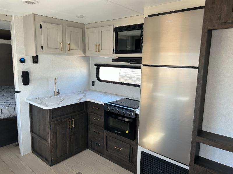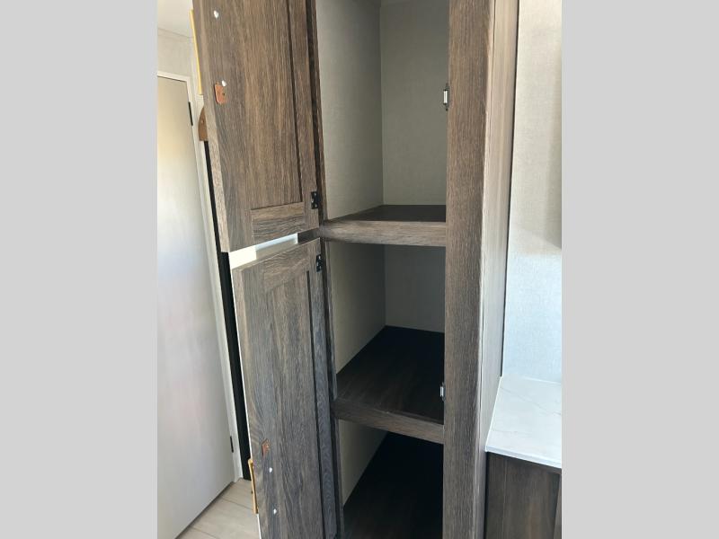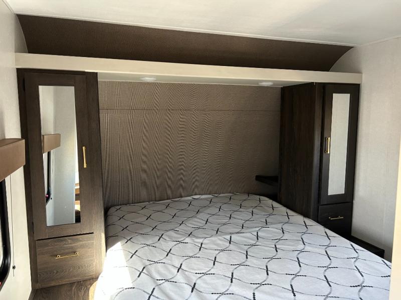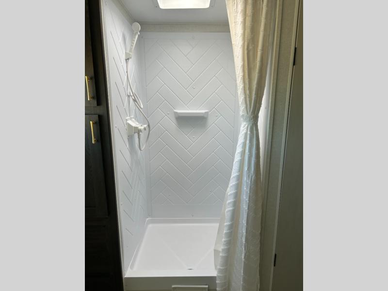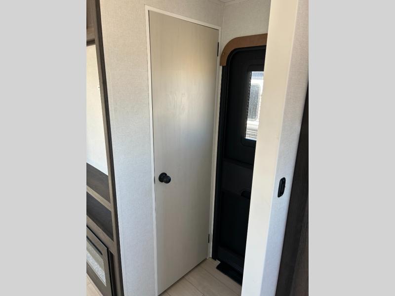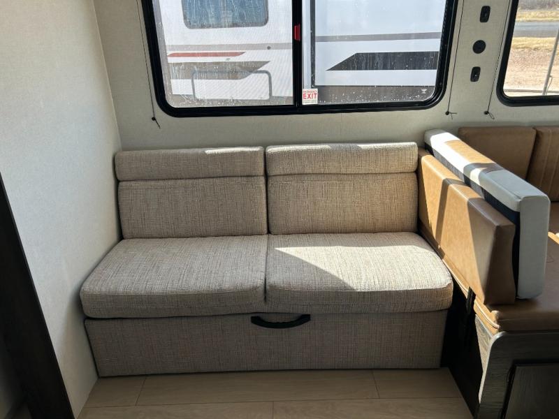 You need this award-winning travel trailer for your next weekend getaway! The full rear bathroom is decked out in features you're going to love like the dual-sink vanity for two to get ready at once, the linen closet next to the 30" x 36" shower and the second linen closet across from the closet with washer and dryer prep. After a fun-filled day outdoors, you can head inside and relax on either the 60" jackknife sofa and enjoy the entertainment center with a fireplace or grab a snack from the 10-cu. ft. refrigerator and play a few card games at the U-shaped dinette. The front private bedroom features a 60" x 74" RV queen bed with shirt closets on either side of it to keep your clothes looking nice!