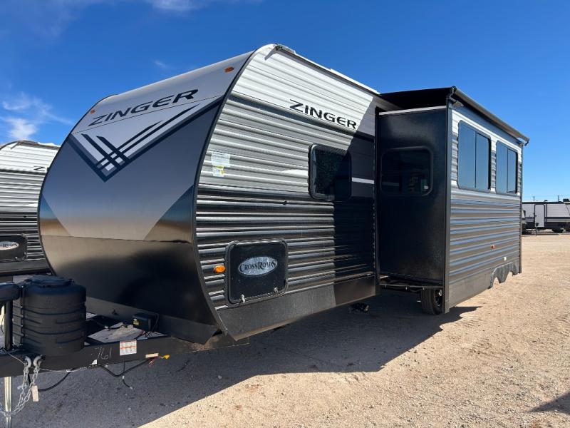 Lead your family to a great vacation getaway in any one of these CrossRoads RV Zinger travel trailers! They feature an aerodynamic front end, Keyed-Alike door locks, Secure Stance entry steps, and exterior speakers with LED accents. The interior of each model includes kitchen backsplash and pressed countertops, along with generous storage, designer valances, and LED lighting to keep your space well lit. You will also appreciate USB ports to keep your electronics charged up, and there is an AM/FM stereo with a Bluetooth soundbar to keep the party going!