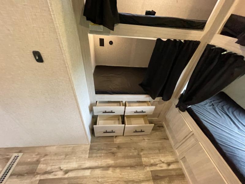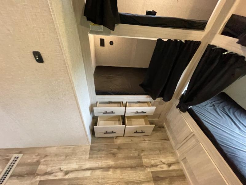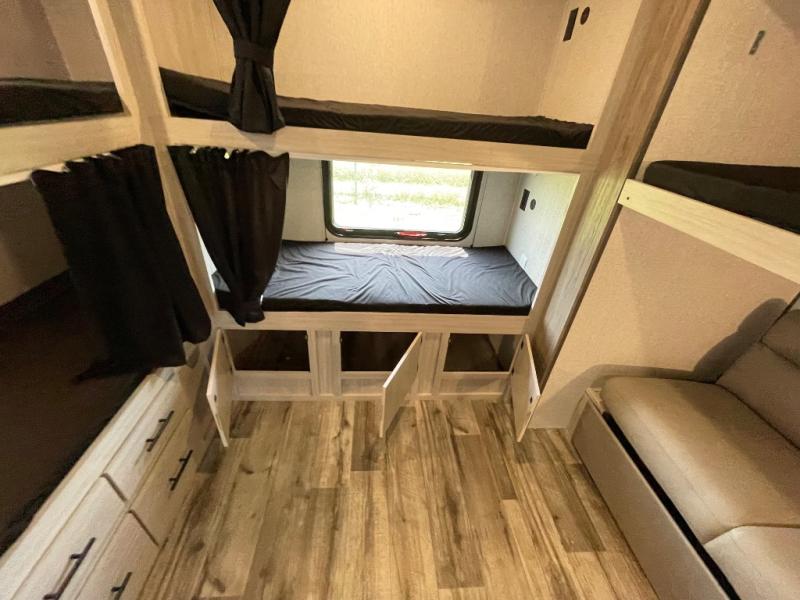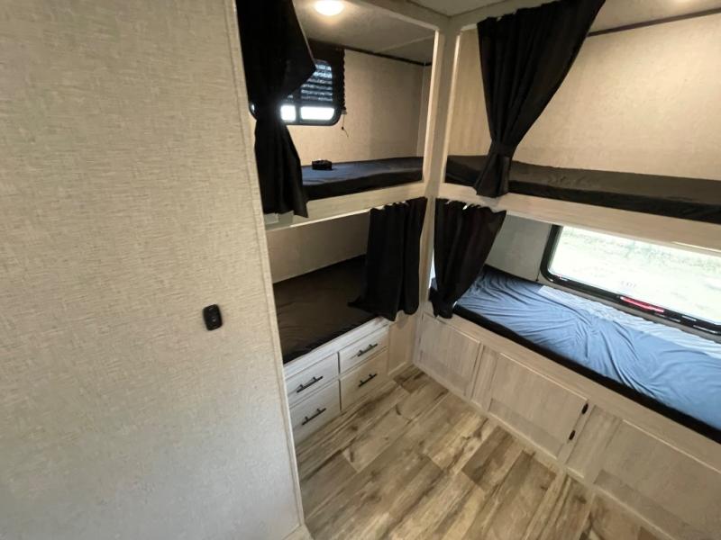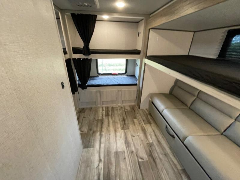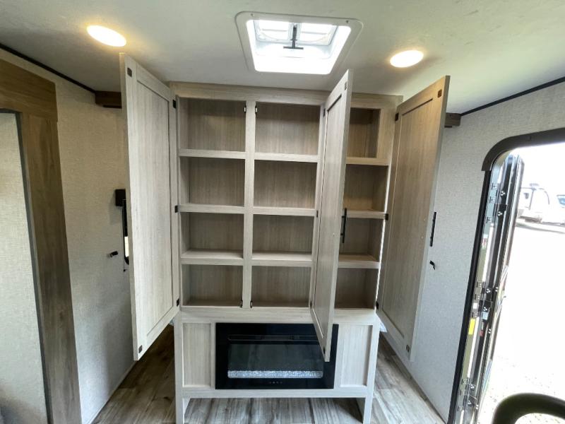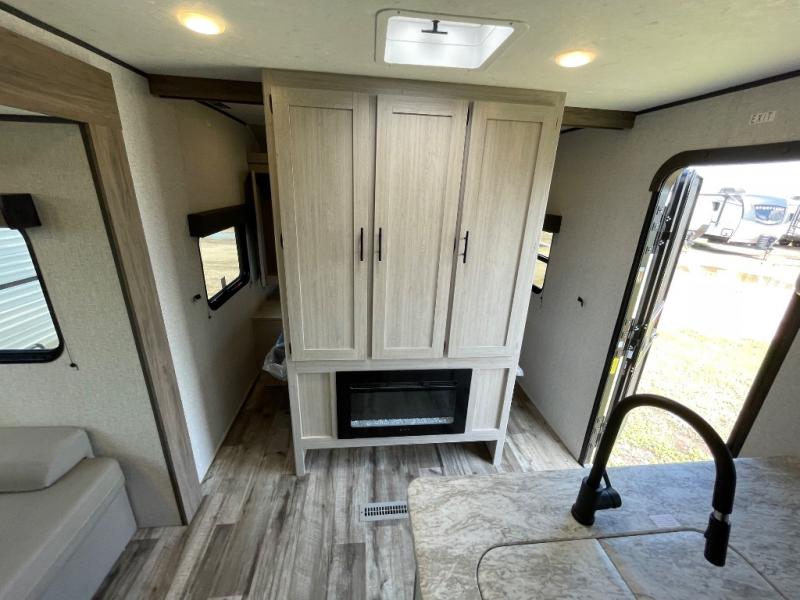 With dual entry doors, you will experience a smooth flow of traffic in and out of this travel trailer! The rear private bunkhouse includes two sets of bunk beds plus a fifth bunk over a jack knife sofa, so your kids can invite a few friends to come along. Across from the full bathroom is a linen closet to keep your towels close by and a U-shaped dinette to enjoy your meals at, play games, and even transform into an extra sleeping space. At night you can either relax on the 60" jackknife sofa by the fireplace or head to the front private bedroom and lie down on the 60" x 74" RV queen bed with closets on either side to keep your clothes looking their best!