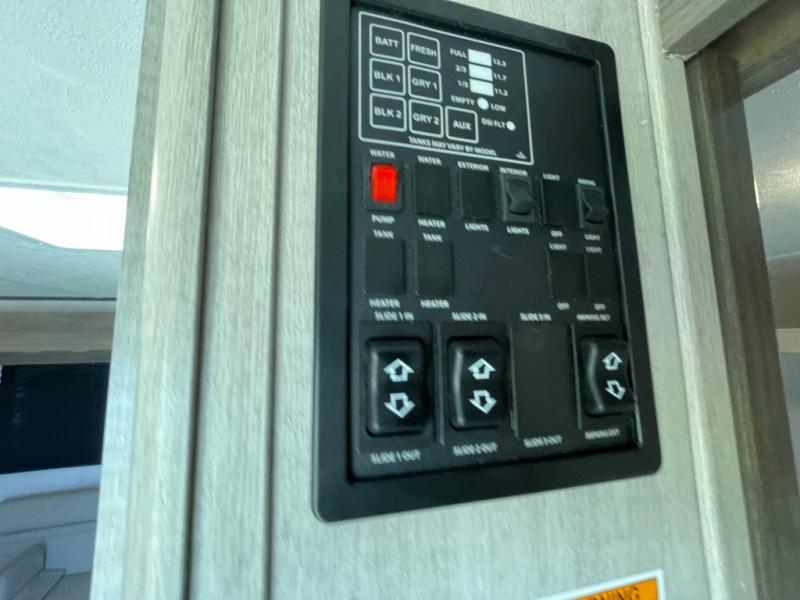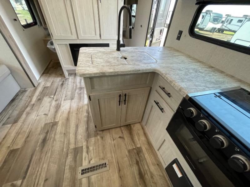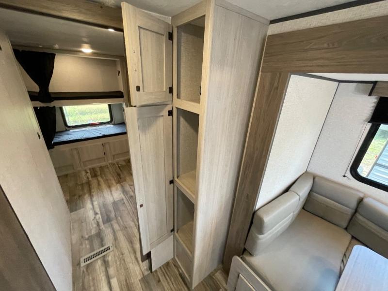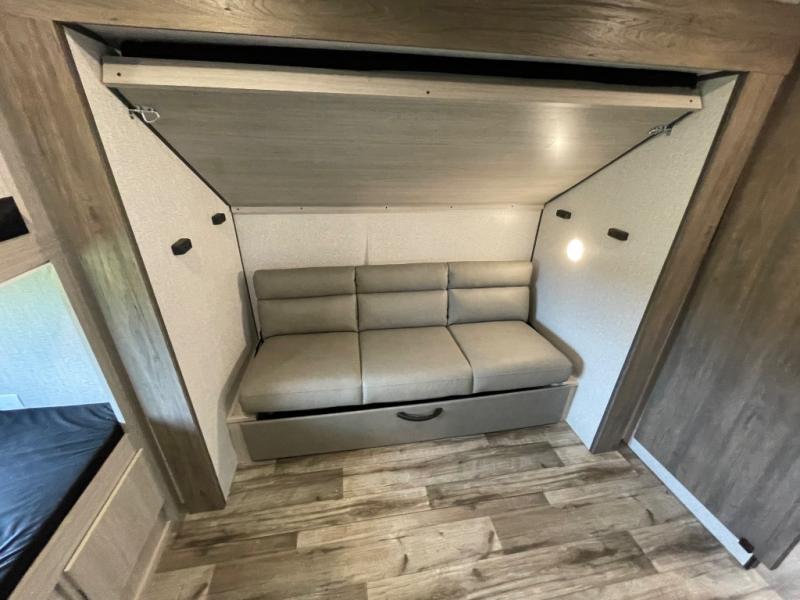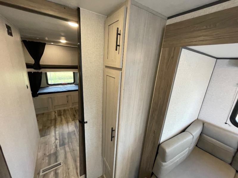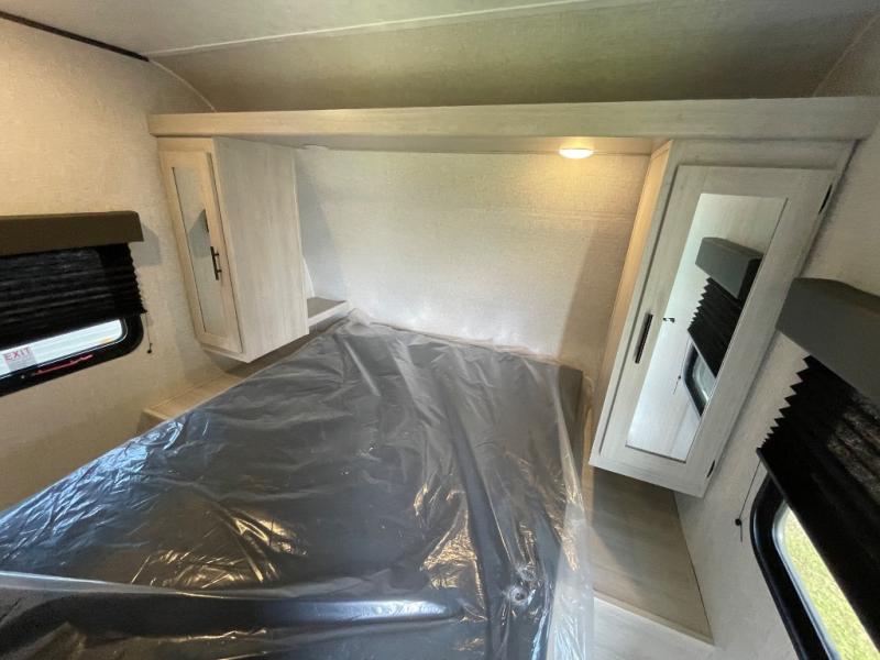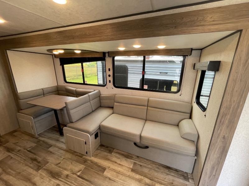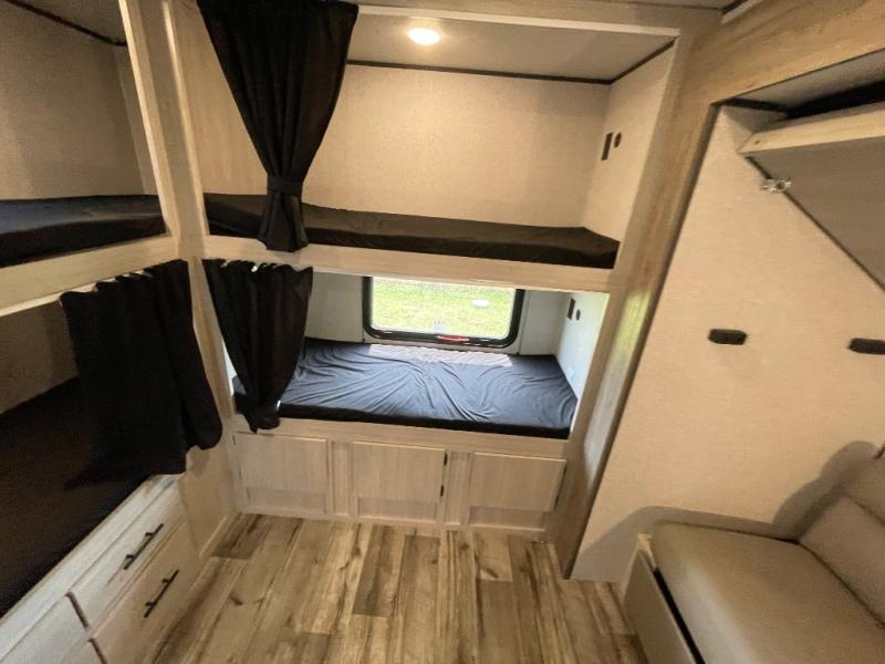 With dual entry doors, you will experience a smooth flow of traffic in and out of this travel trailer! The rear private bunkhouse includes two sets of bunk beds plus a fifth bunk over a jack knife sofa, so your kids can invite a few friends to come along. Across from the full bathroom is a linen closet to keep your towels close by and a U-shaped dinette to enjoy your meals at, play games, and even transform into an extra sleeping space. At night you can either relax on the 60" jackknife sofa by the fireplace or head to the front private bedroom and lie down on the 60" x 74" RV queen bed with closets on either side to keep your clothes looking their best!