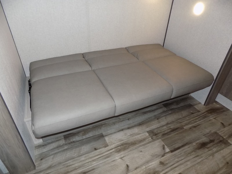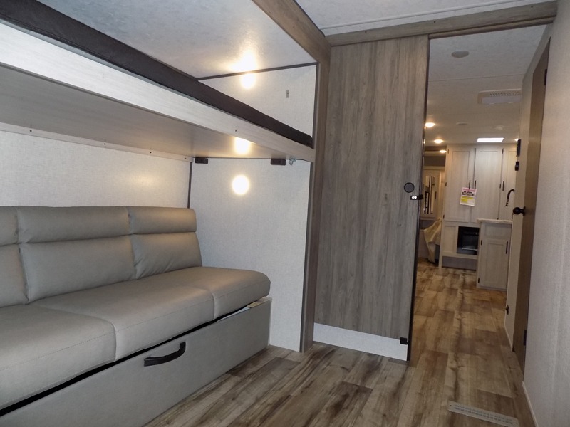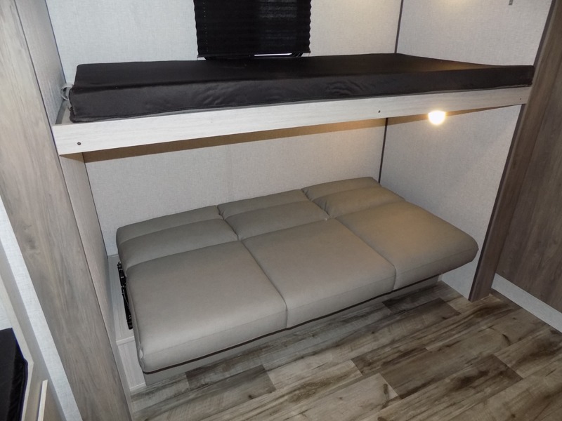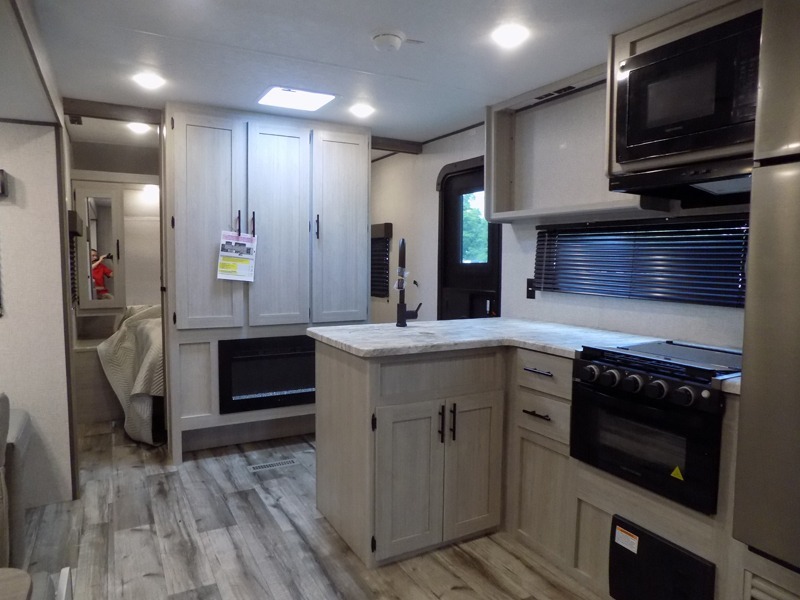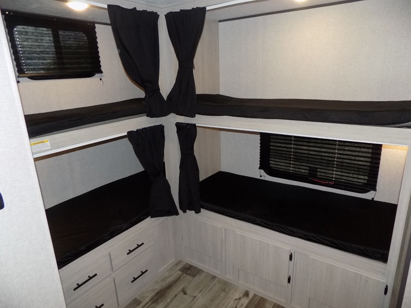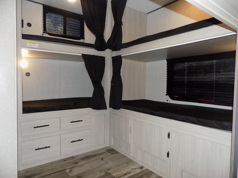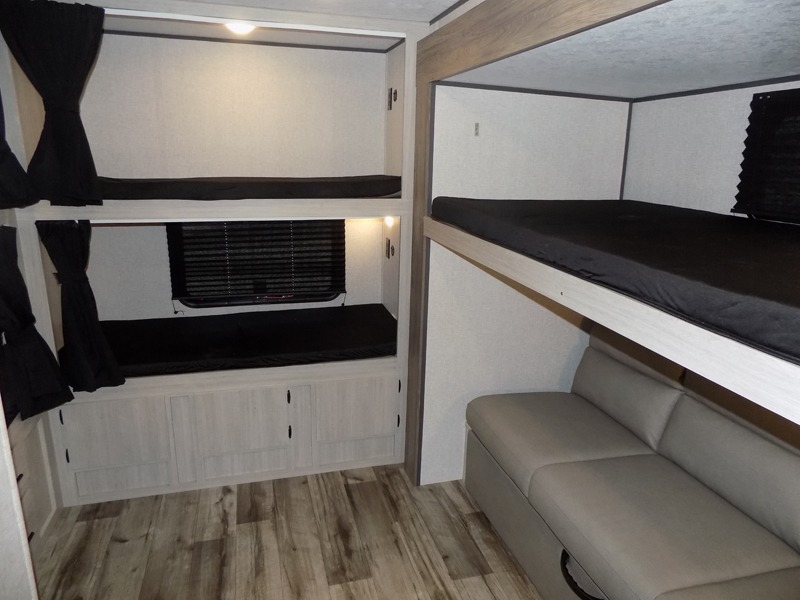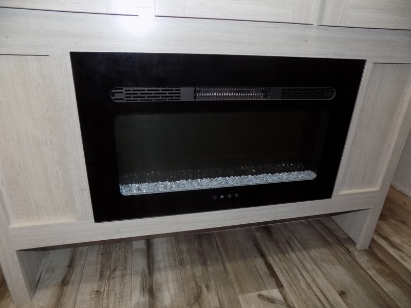 With dual entry doors, you will experience a smooth flow of traffic in and out of this travel trailer! The rear private bunkhouse includes two sets of bunk beds plus a fifth bunk over a jack knife sofa, so your kids can invite a few friends to come along. Across from the full bathroom is a linen closet to keep your towels close by and a U-shaped dinette to enjoy your meals at, play games, and even transform into an extra sleeping space. At night you can either relax on the 60" jackknife sofa by the fireplace or head to the front private bedroom and lie down on the 60" x 74" RV queen bed with closets on either side to keep your clothes looking their best!