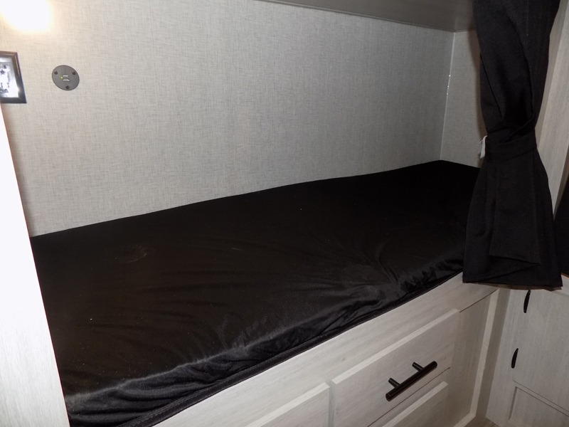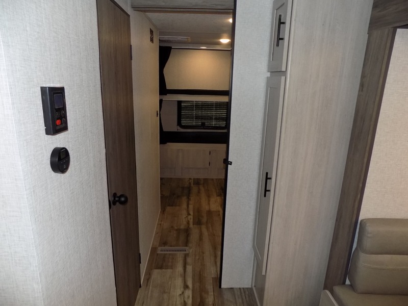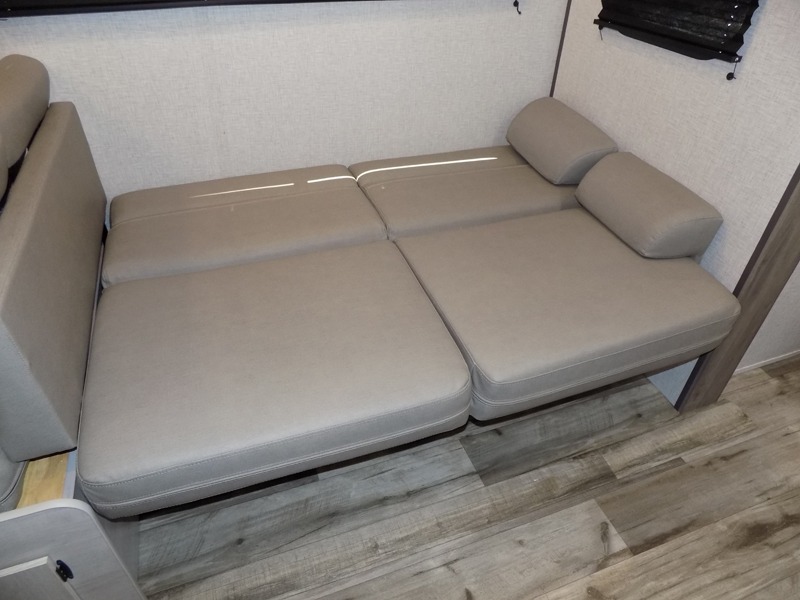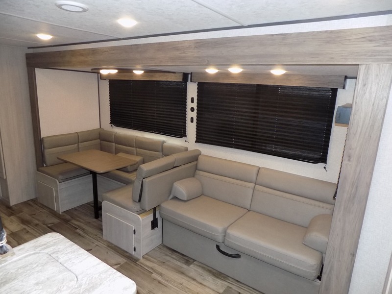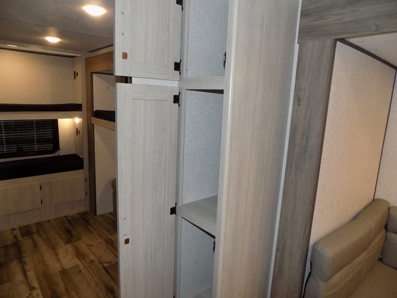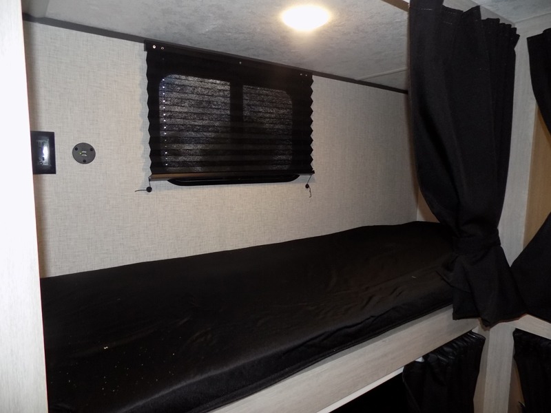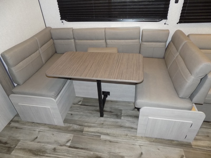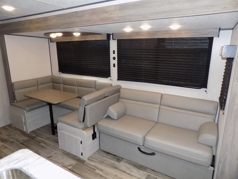 With dual entry doors, you will experience a smooth flow of traffic in and out of this travel trailer! The rear private bunkhouse includes two sets of bunk beds plus a fifth bunk over a jack knife sofa, so your kids can invite a few friends to come along. Across from the full bathroom is a linen closet to keep your towels close by and a U-shaped dinette to enjoy your meals at, play games, and even transform into an extra sleeping space. At night you can either relax on the 60" jackknife sofa by the fireplace or head to the front private bedroom and lie down on the 60" x 74" RV queen bed with closets on either side to keep your clothes looking their best!