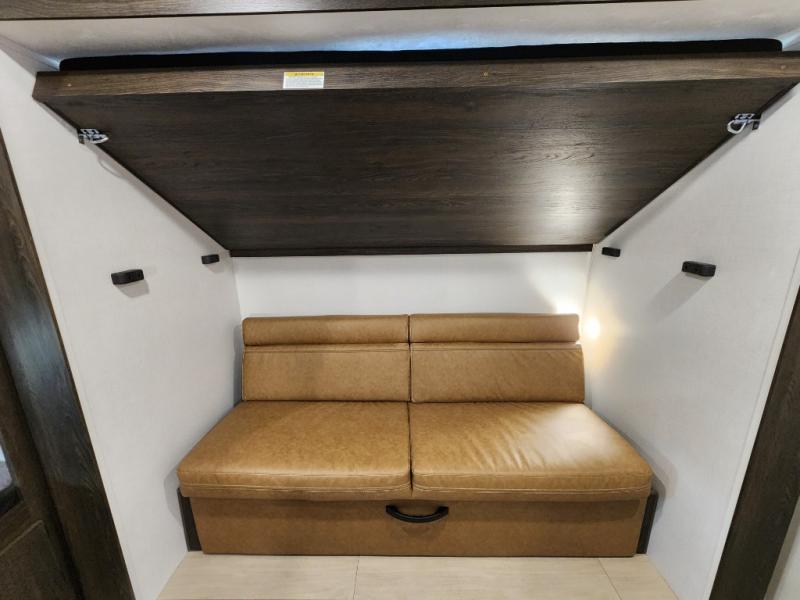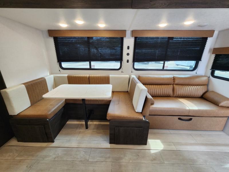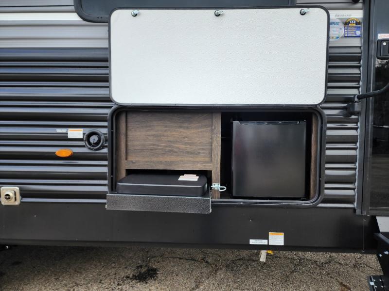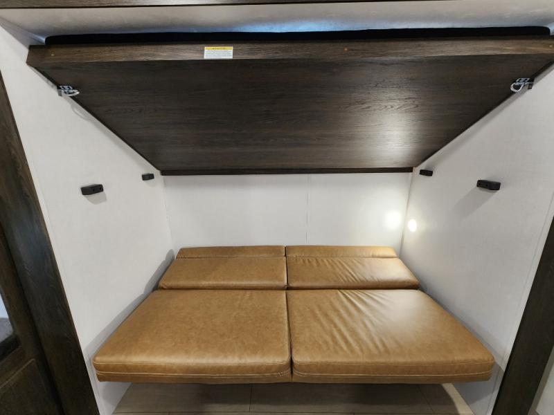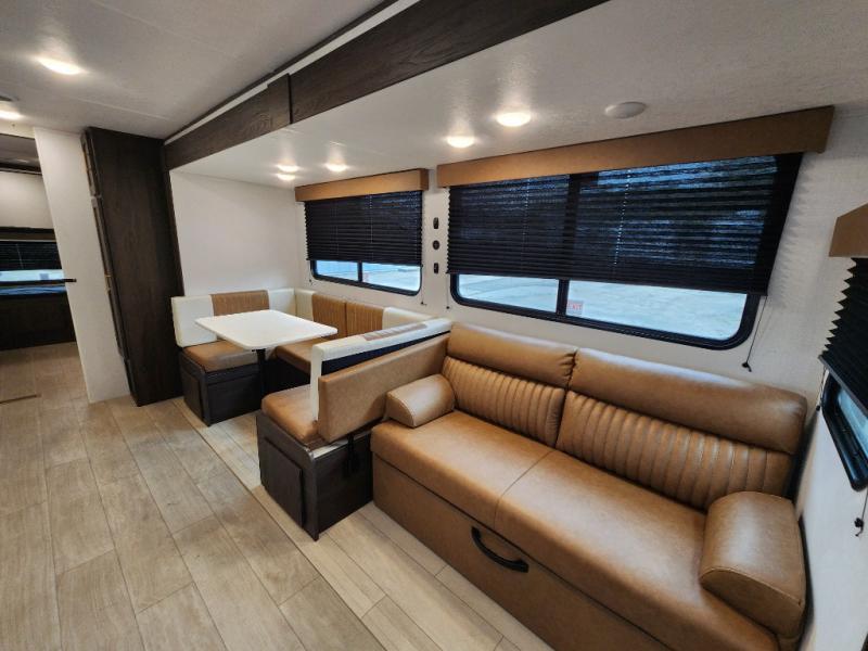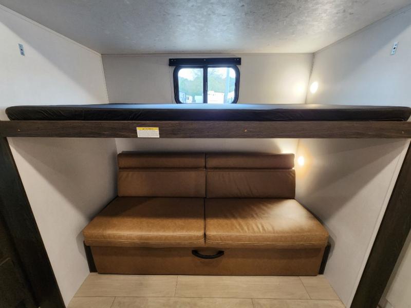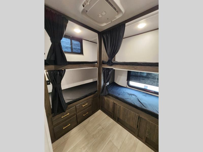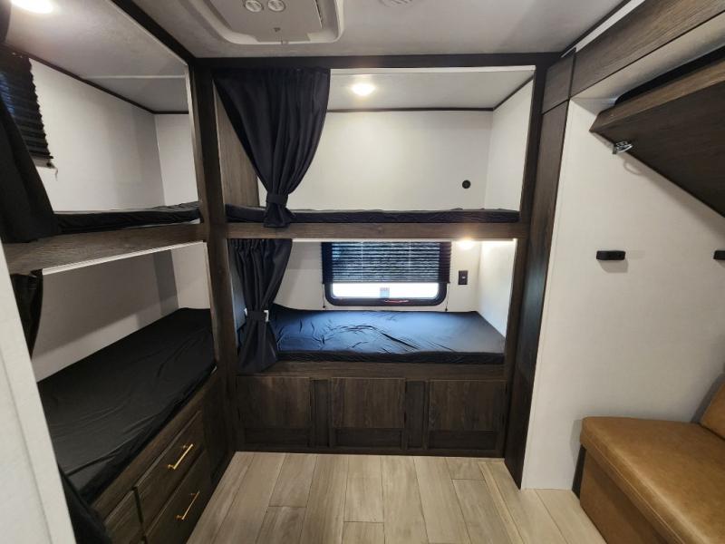 With dual entry doors, you will experience a smooth flow of traffic in and out of this travel trailer! The rear private bunkhouse includes two sets of bunk beds plus a fifth bunk over a jack knife sofa, so your kids can invite a few friends to come along. Across from the full bathroom is a linen closet to keep your towels close by and a U-shaped dinette to enjoy your meals at, play games, and even transform into an extra sleeping space. At night you can either relax on the 60" jackknife sofa by the fireplace or head to the front private bedroom and lie down on the 60" x 74" RV queen bed with closets on either side to keep your clothes looking their best!