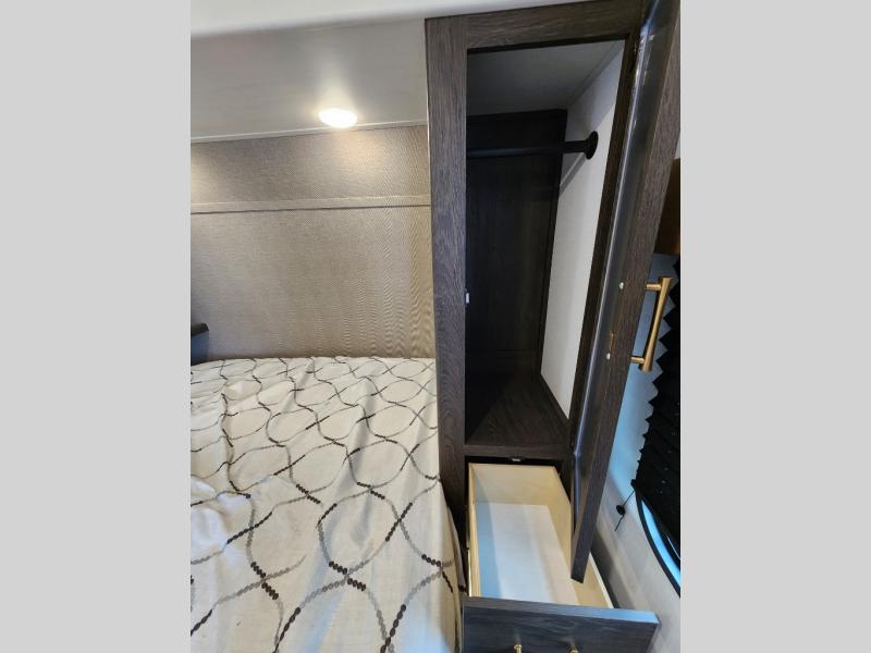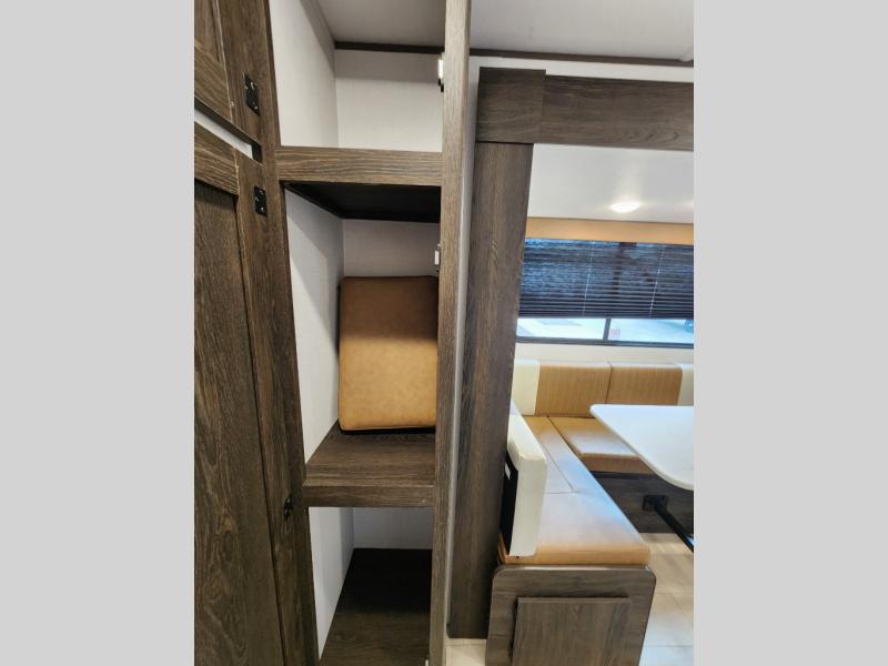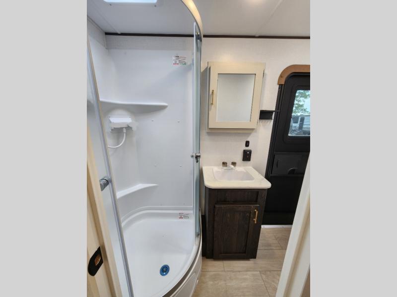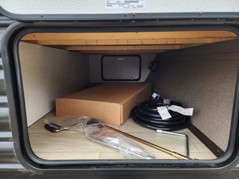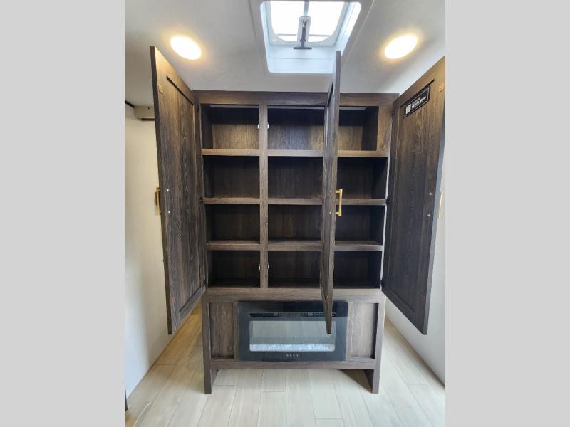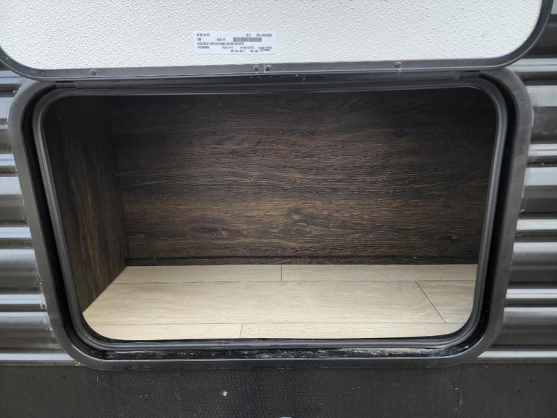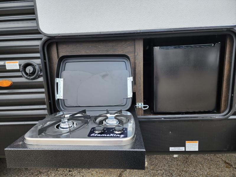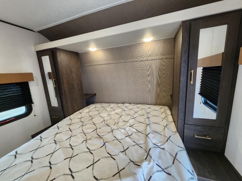 With dual entry doors, you will experience a smooth flow of traffic in and out of this travel trailer! The rear private bunkhouse includes two sets of bunk beds plus a fifth bunk over a jack knife sofa, so your kids can invite a few friends to come along. Across from the full bathroom is a linen closet to keep your towels close by and a U-shaped dinette to enjoy your meals at, play games, and even transform into an extra sleeping space. At night you can either relax on the 60" jackknife sofa by the fireplace or head to the front private bedroom and lie down on the 60" x 74" RV queen bed with closets on either side to keep your clothes looking their best!