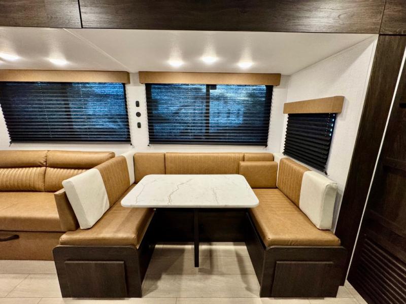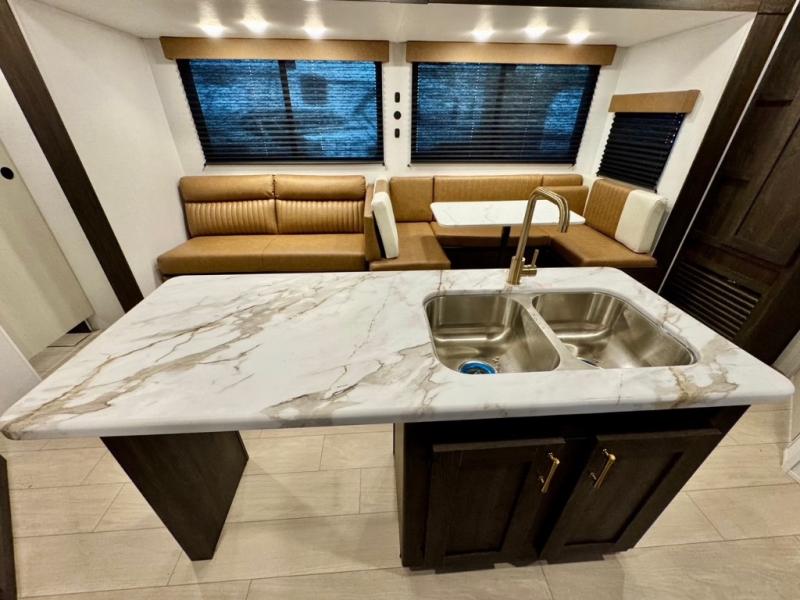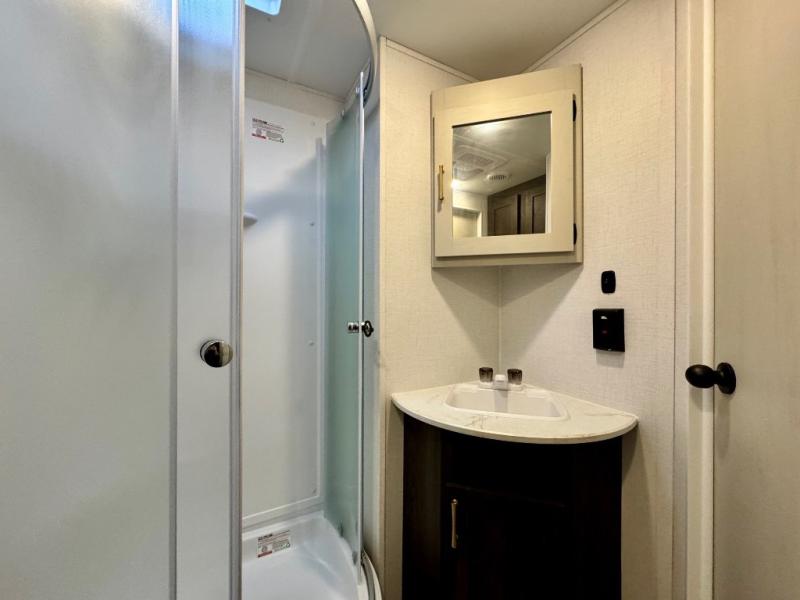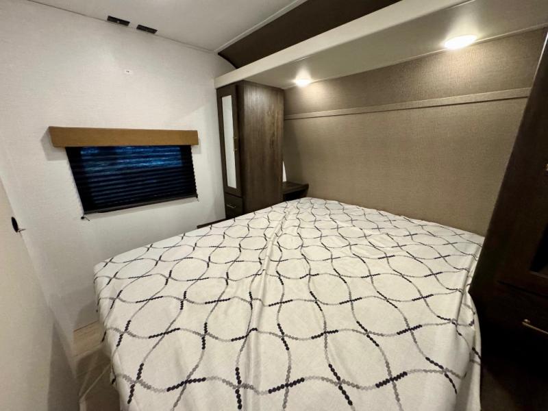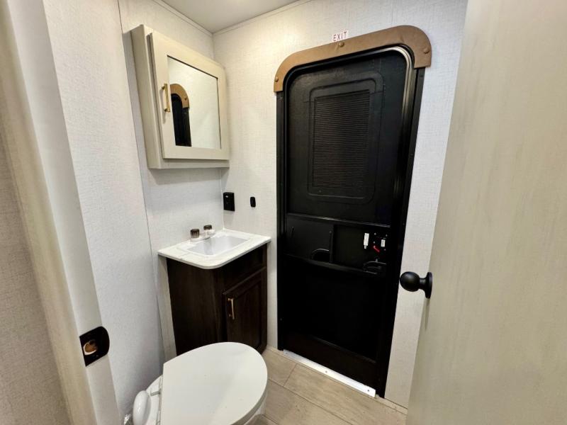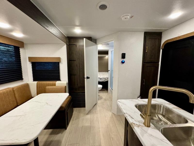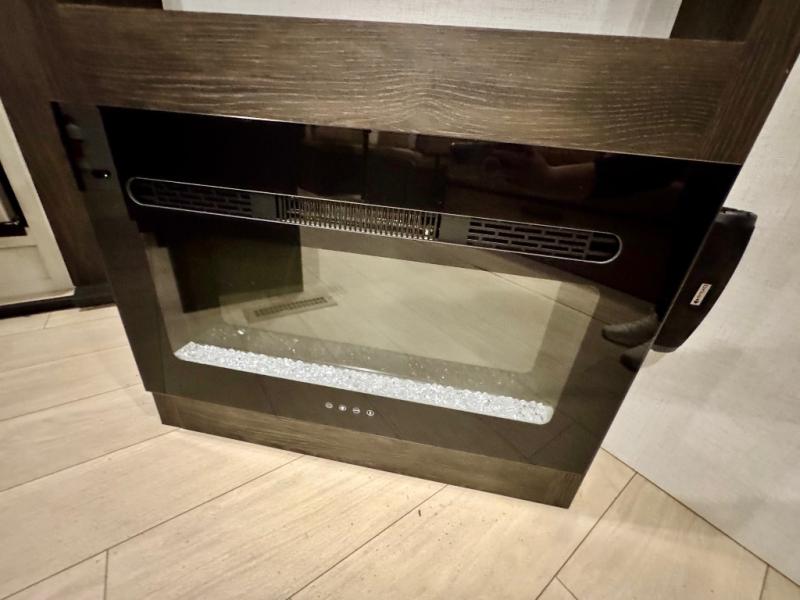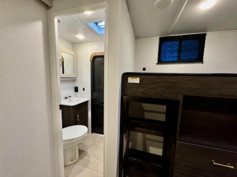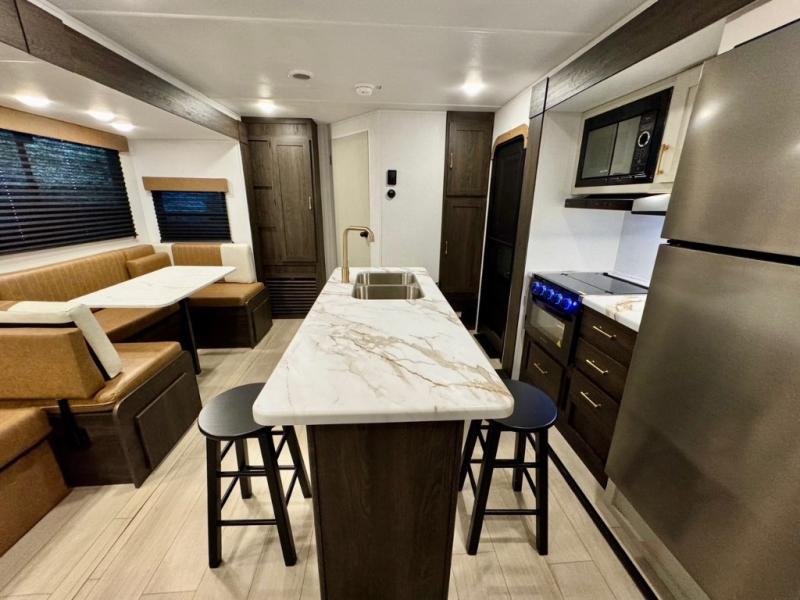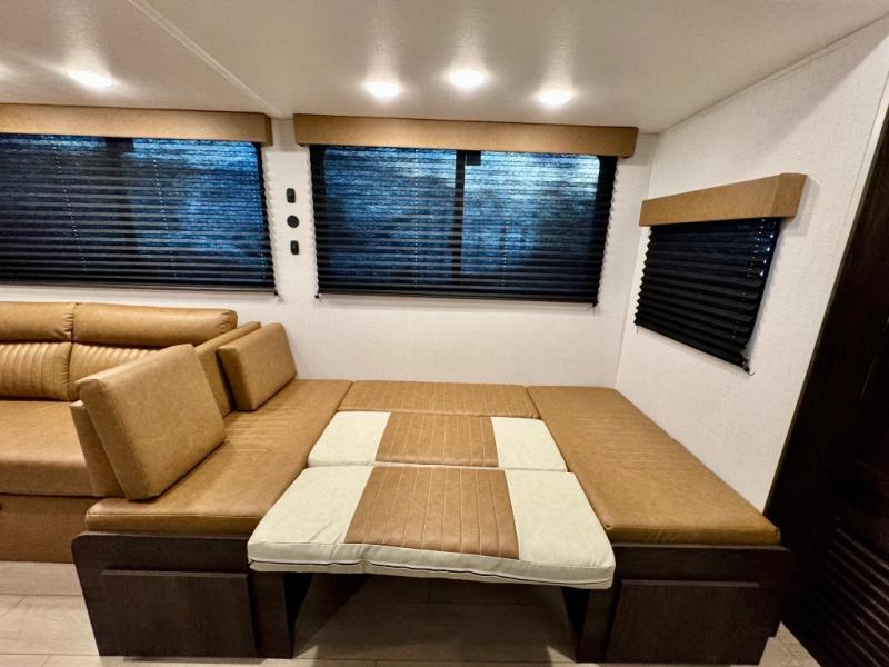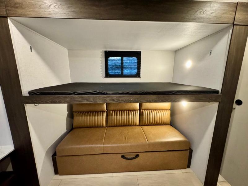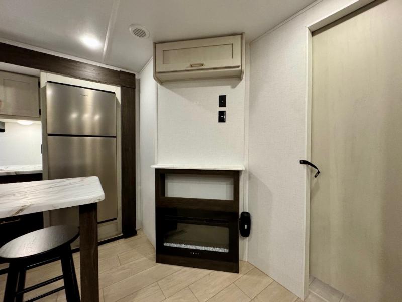 You won't believe all that this travel trailer has to offer! There is a kitchen island with a chair on either side of it for two helpers to roll out the dough for cinnamon rolls in the morning and enjoy them at the U-shaped dinette. One of the entrance doors leads right into the half bathroom which also leads into the rear private bunkhouse. Inside the bunkhouse is a flip-up bunk above the jackknife sofa which are both across from a second bunk and wardrobe/entertainment center. While the kids are busy playing in their bedroom, you and your spouse can relax on the jack knife sofa across from the fireplace or head to the front private bedroom to relax on the RV queen bed, plus you have your own entrance into the walk-through bathroom which will come in very handy at night!
