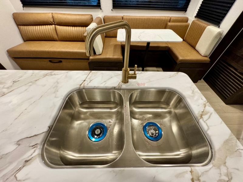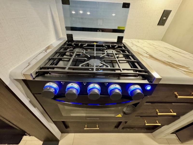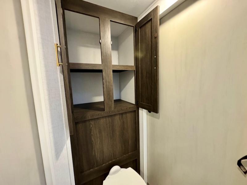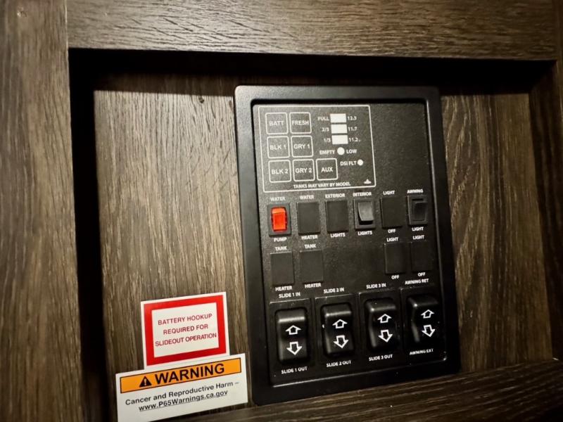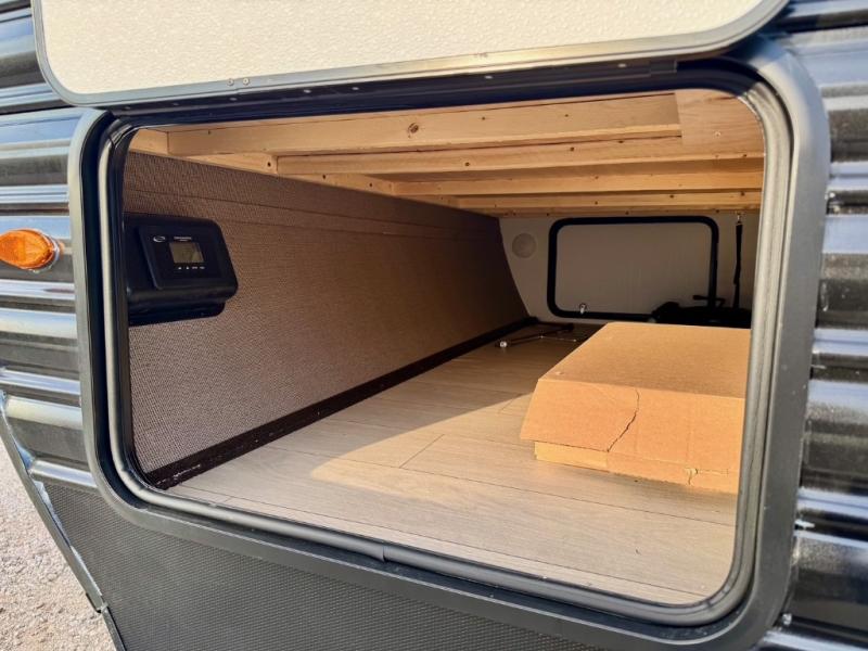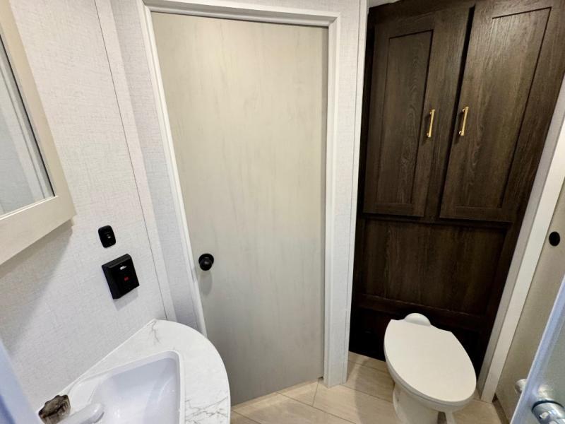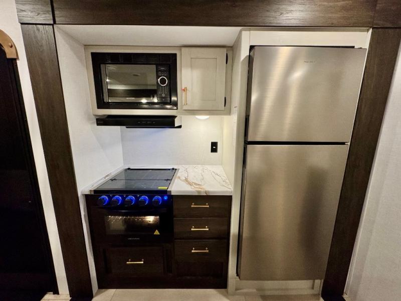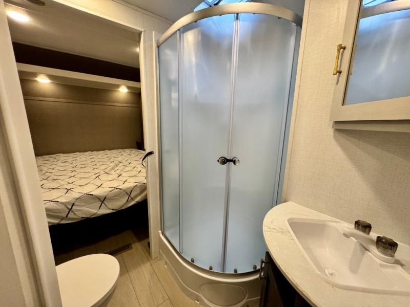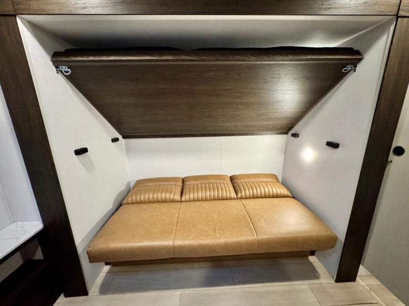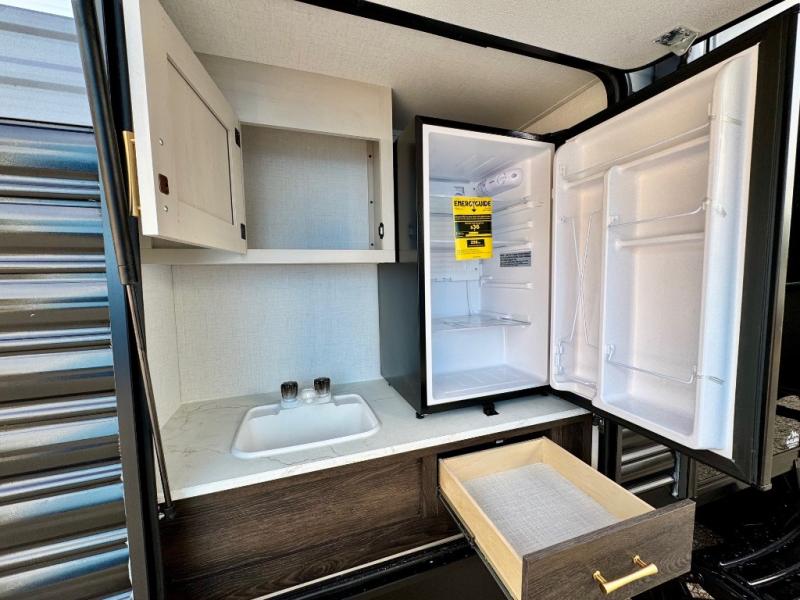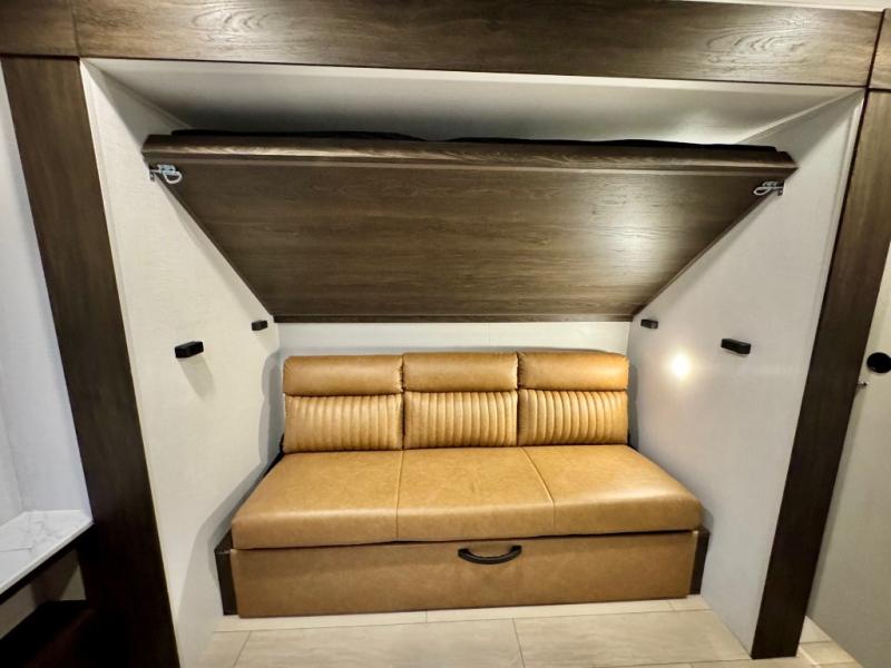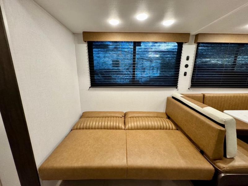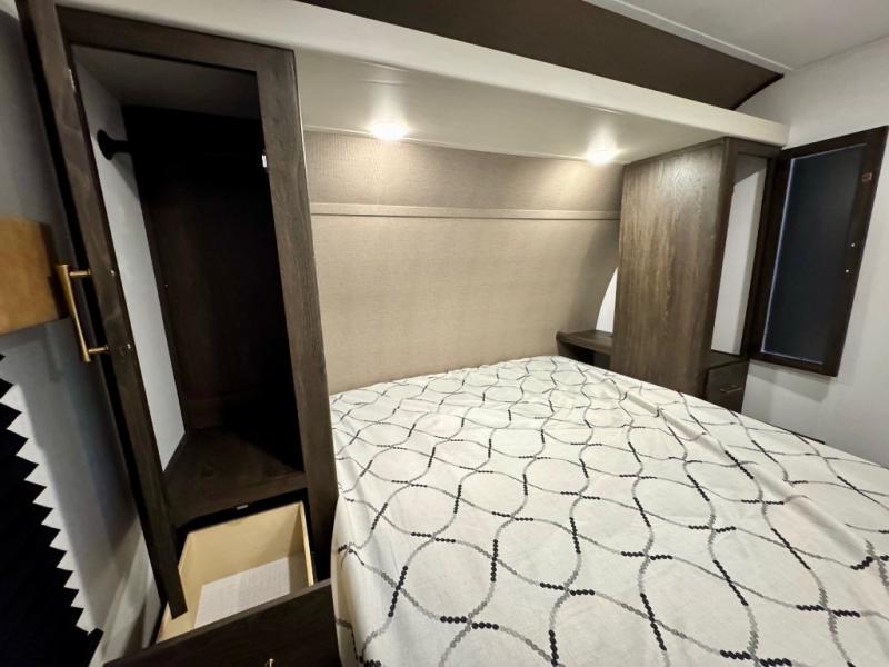 You won't believe all that this travel trailer has to offer! There is a kitchen island with a chair on either side of it for two helpers to roll out the dough for cinnamon rolls in the morning and enjoy them at the U-shaped dinette. One of the entrance doors leads right into the half bathroom which also leads into the rear private bunkhouse. Inside the bunkhouse is a flip-up bunk above the jackknife sofa which are both across from a second bunk and wardrobe/entertainment center. While the kids are busy playing in their bedroom, you and your spouse can relax on the jack knife sofa across from the fireplace or head to the front private bedroom to relax on the RV queen bed, plus you have your own entrance into the walk-through bathroom which will come in very handy at night!