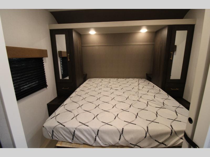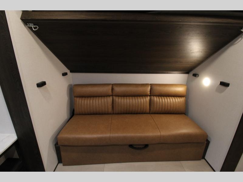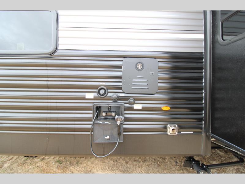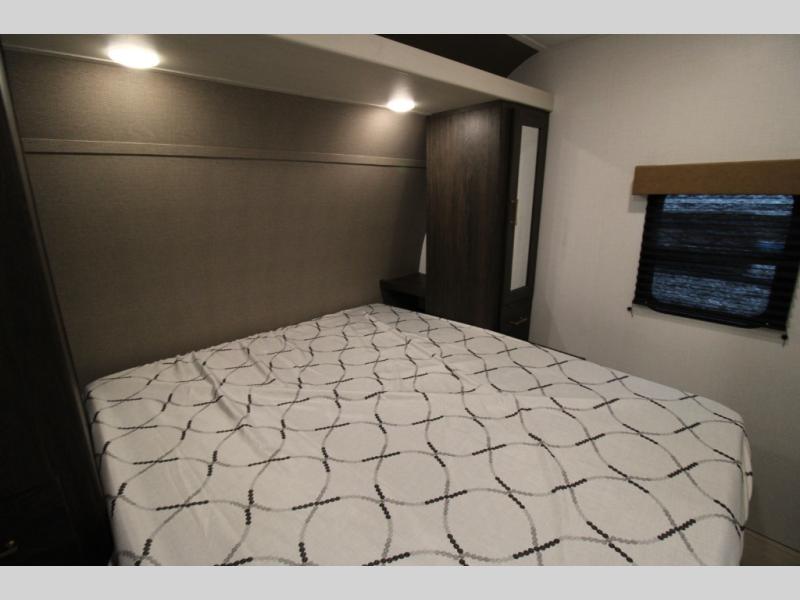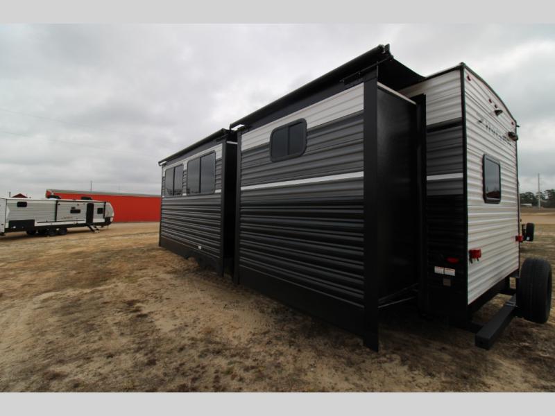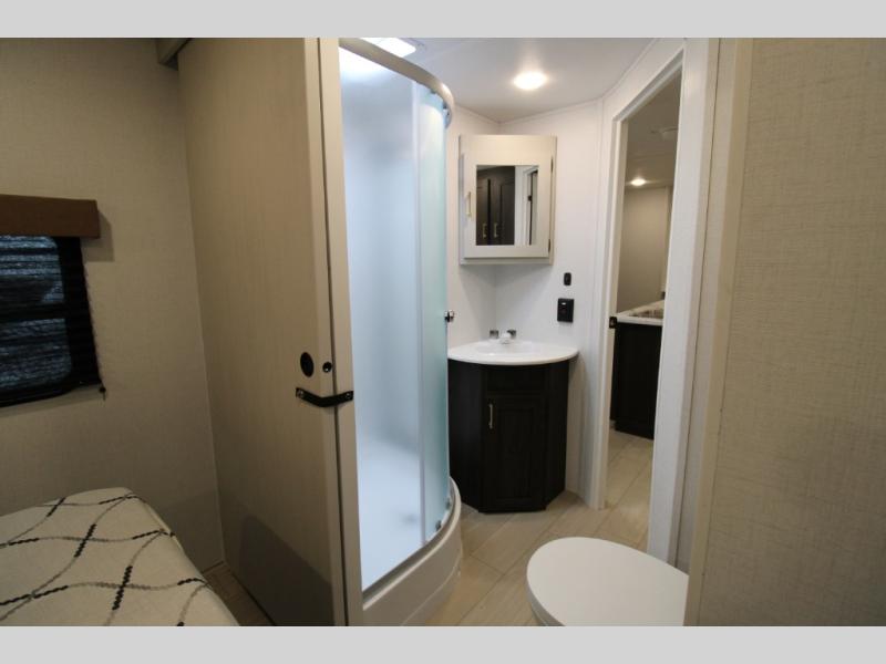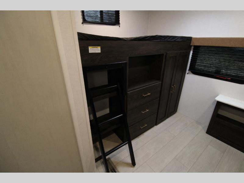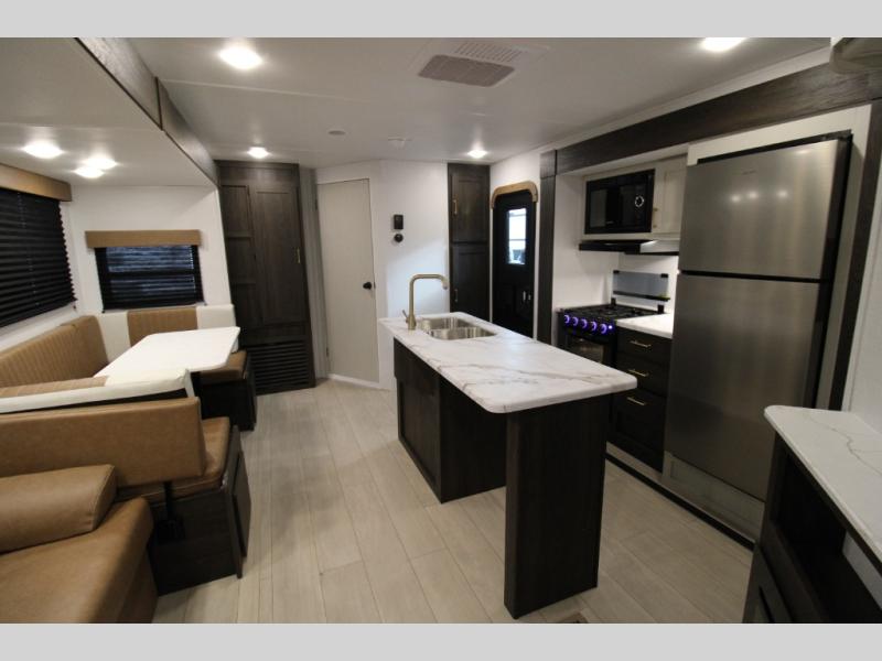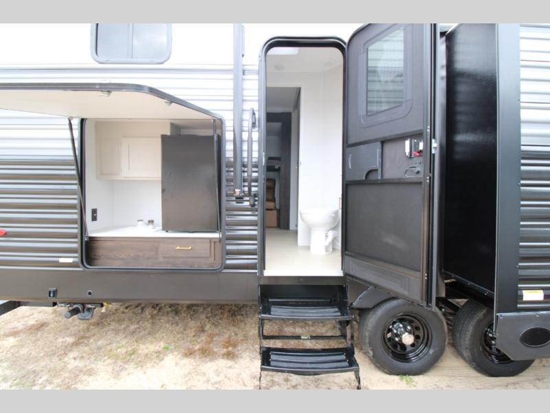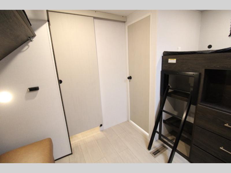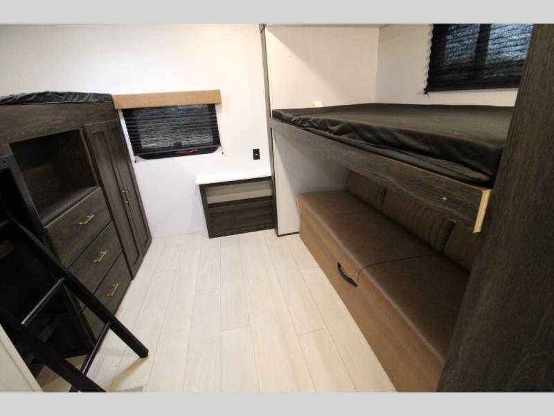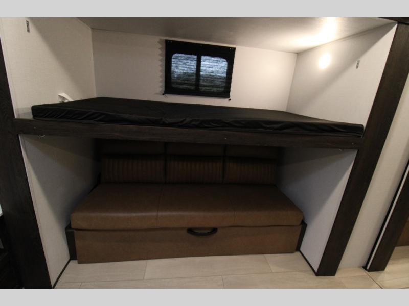 You won't believe all that this travel trailer has to offer! There is a kitchen island with a chair on either side of it for two helpers to roll out the dough for cinnamon rolls in the morning and enjoy them at the U-shaped dinette. One of the entrance doors leads right into the half bathroom which also leads into the rear private bunkhouse. Inside the bunkhouse is a flip-up bunk above the jackknife sofa which are both across from a second bunk and wardrobe/entertainment center. While the kids are busy playing in their bedroom, you and your spouse can relax on the jack knife sofa across from the fireplace or head to the front private bedroom to relax on the RV queen bed, plus you have your own entrance into the walk-through bathroom which will come in very handy at night!