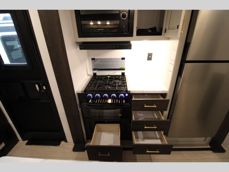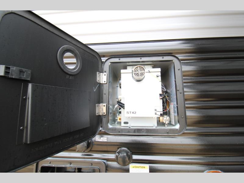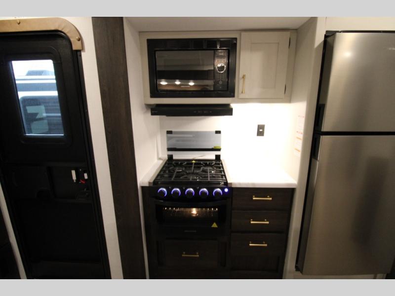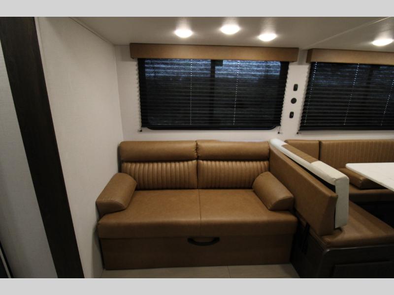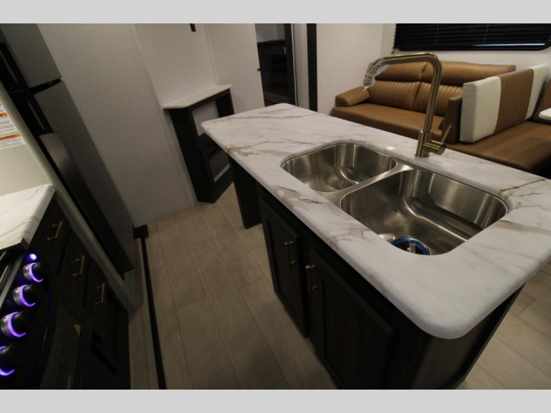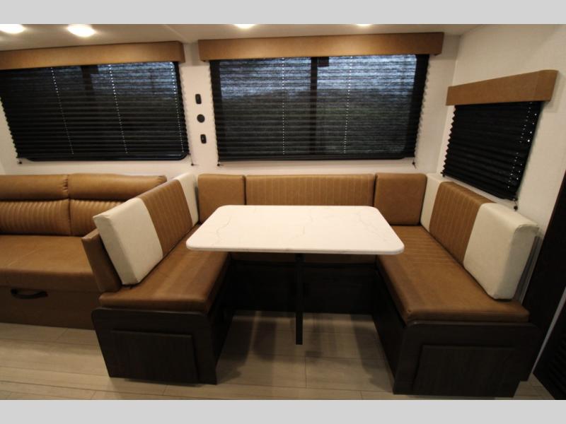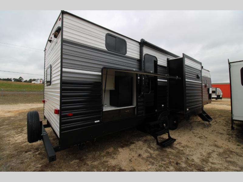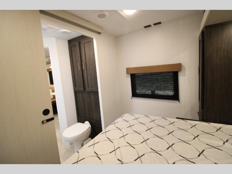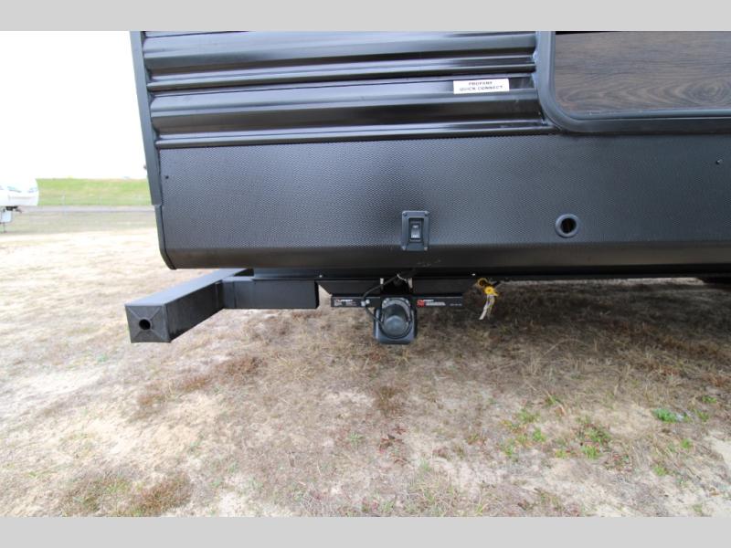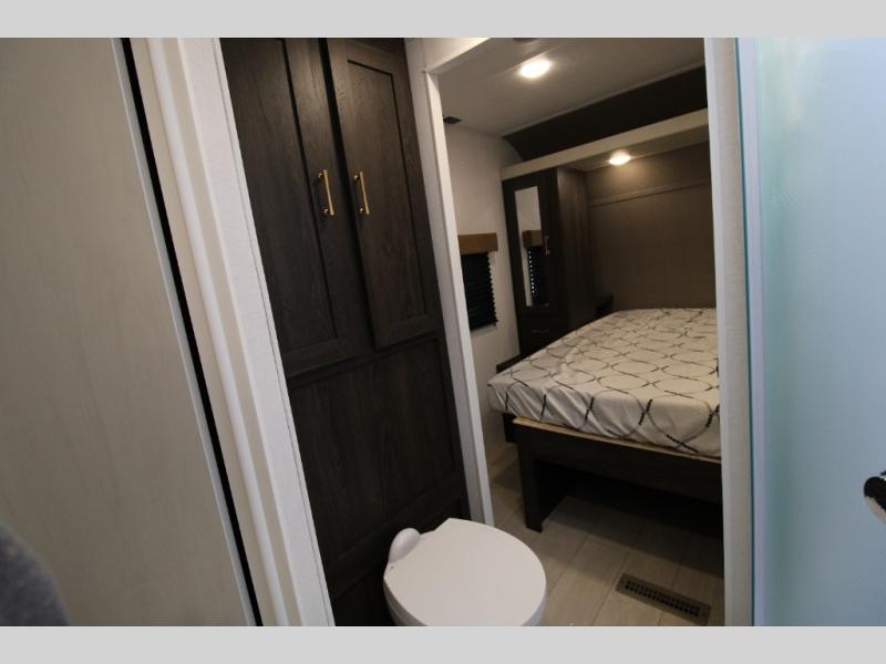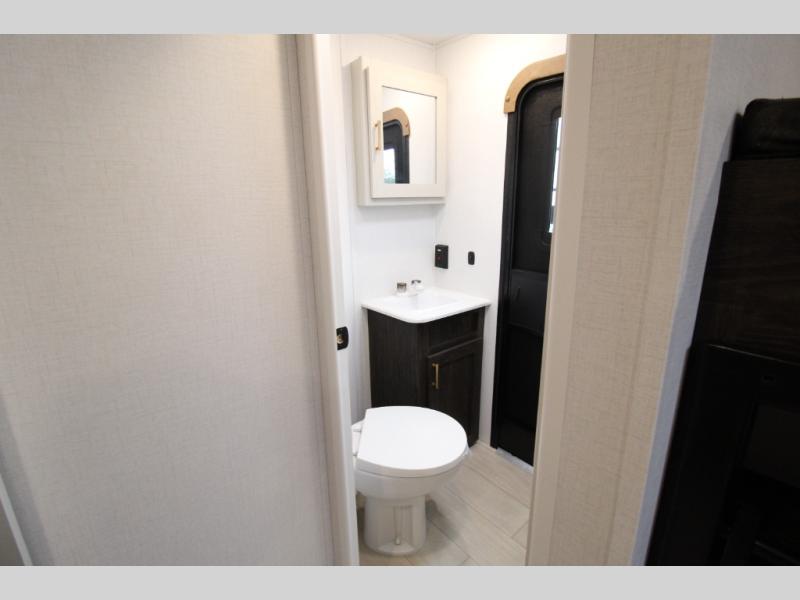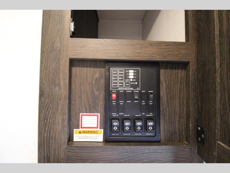You won't believe all that this travel trailer has to offer! There is a kitchen island with a chair on either side of it for two helpers to roll out the dough for cinnamon rolls in the morning and enjoy them at the U-shaped dinette. One of the entrance doors leads right into the half bathroom which also leads into the rear private bunkhouse. Inside the bunkhouse is a flip-up bunk above the jackknife sofa which are both across from a second bunk and wardrobe/entertainment center. While the kids are busy playing in their bedroom, you and your spouse can relax on the jack knife sofa across from the fireplace or head to the front private bedroom to relax on the RV queen bed, plus you have your own entrance into the walk-through bathroom which will come in very handy at night!