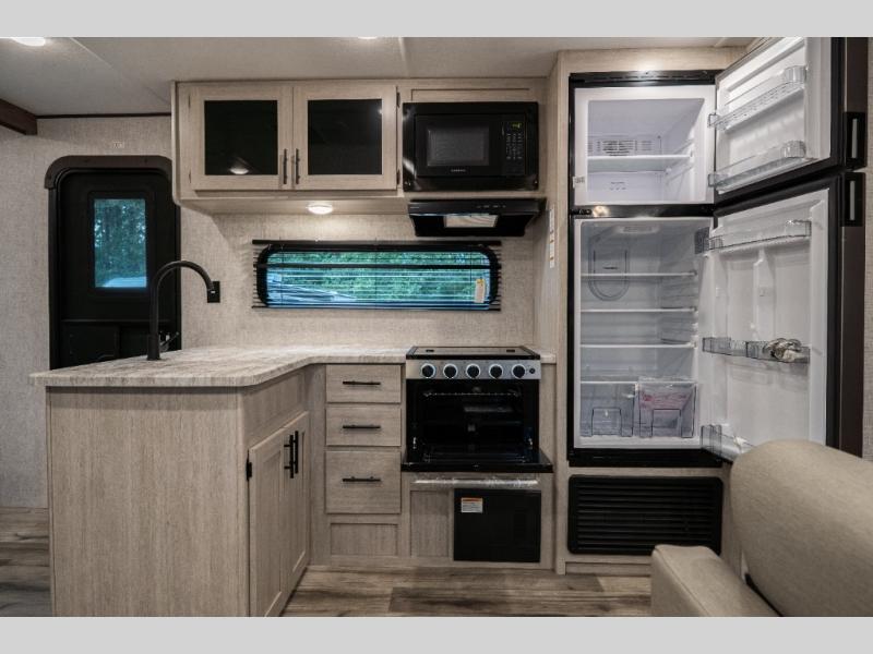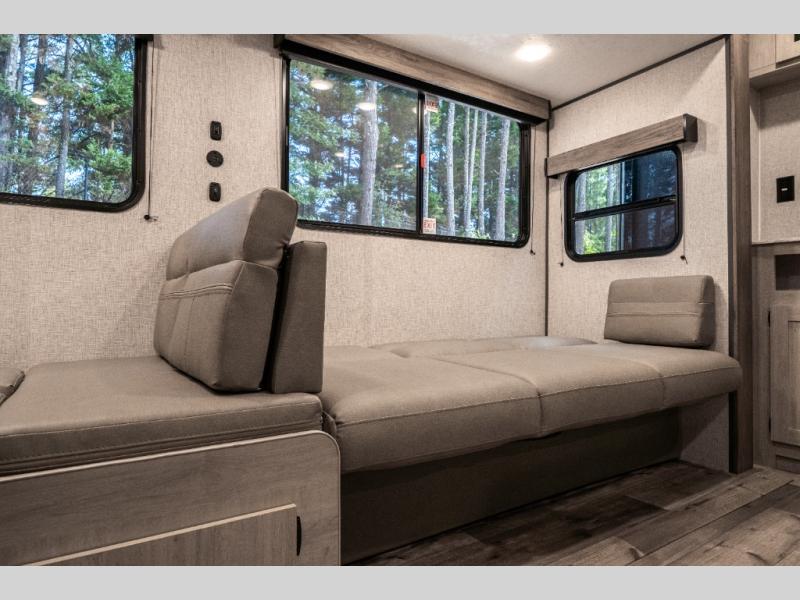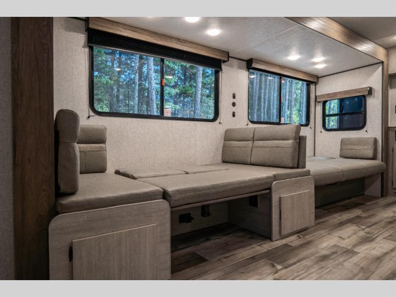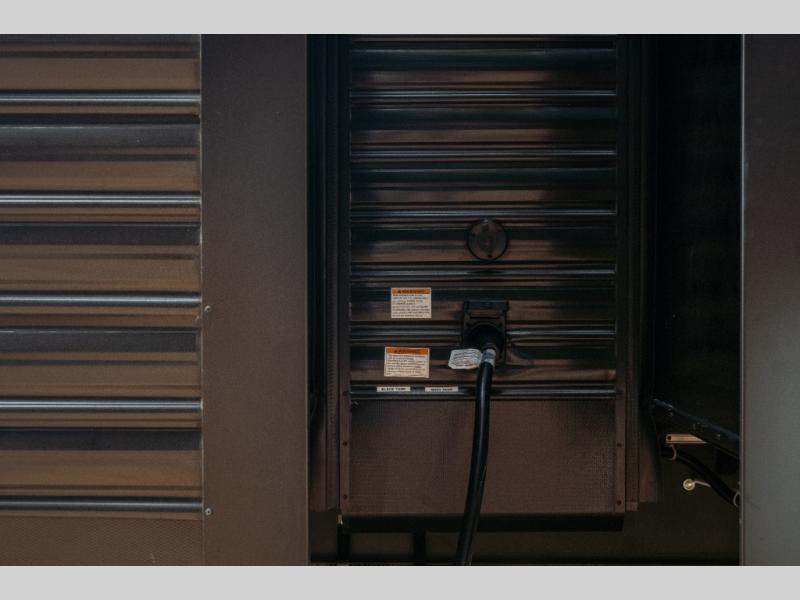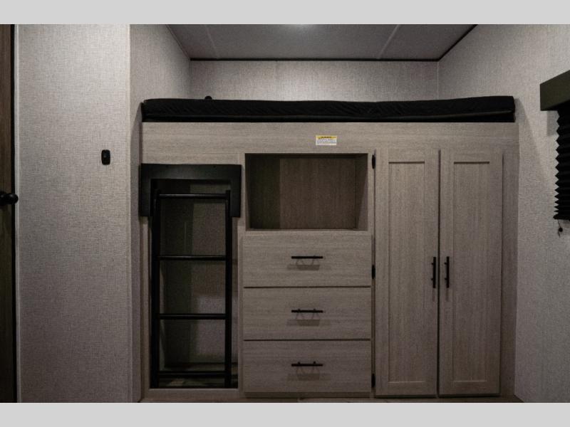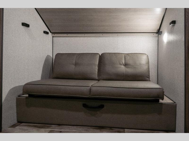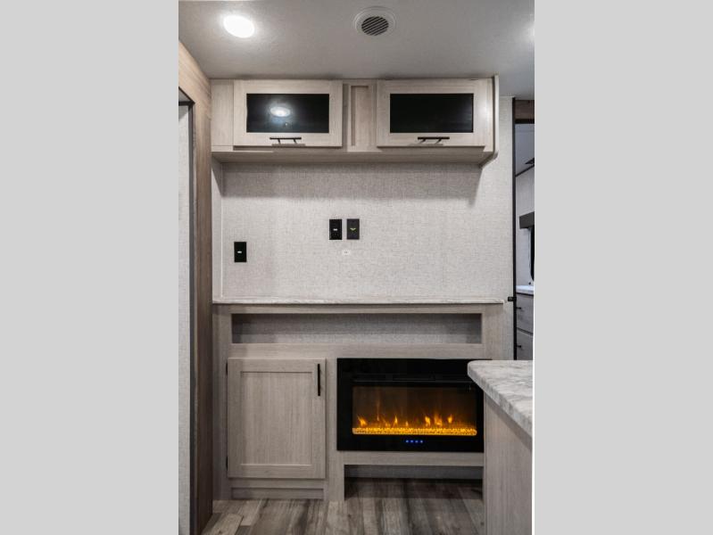 Camp like royalty in this travel trailer! The front private bedroom features a king bed across from a dresser and next to a large wardrobe with overhead cabinets, plus there is a closet with washer and dryer prep. The living area has a 60" jackknife sofa that can be pulled out for a comfortable place to lie down and watch a movie on the HDTV while a fire is roaring in the electric fireplace. The rear private bunkhouse is big enough to house all of the kiddos with the 38" x 74" flip-up bunk above the 72" jackknife sofa and the 38" x 74" bunk above the wardrobe/entertainment center. You can even cook dinner while breathing in fresh air at the outdoor kitchen!