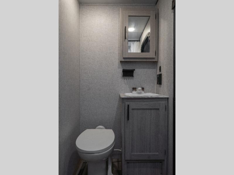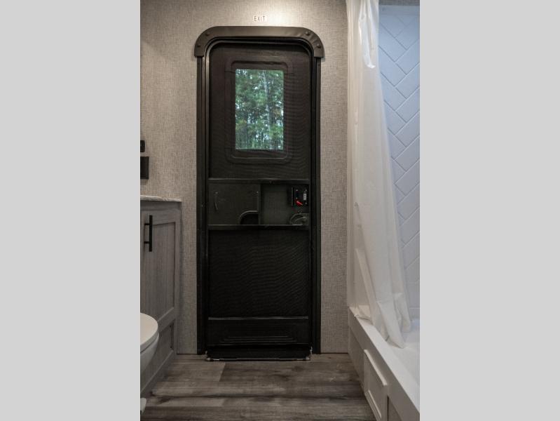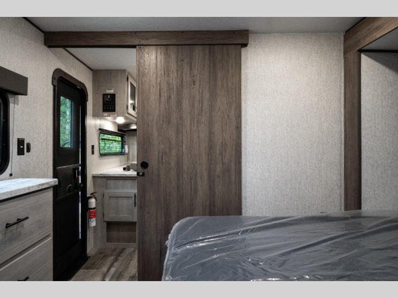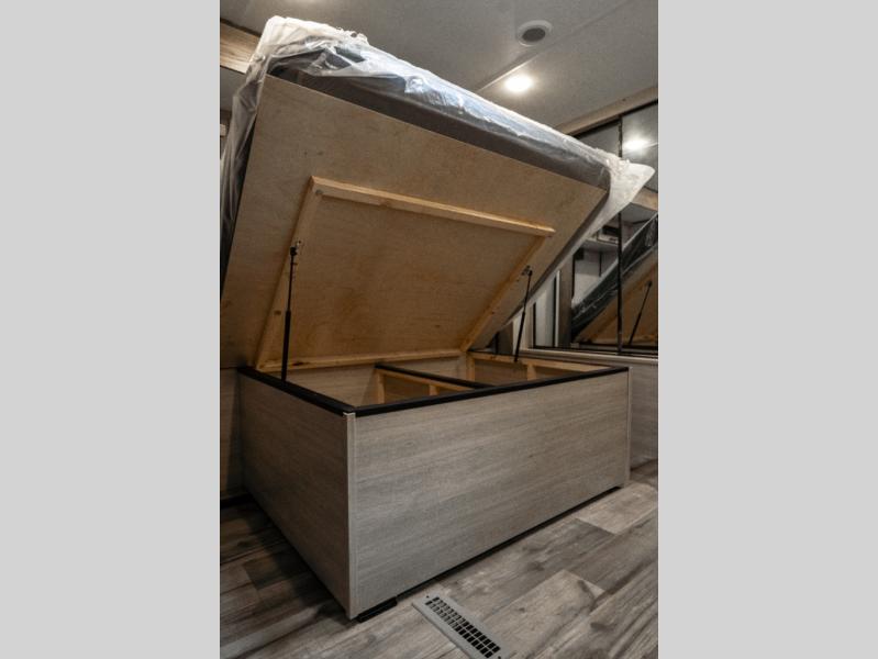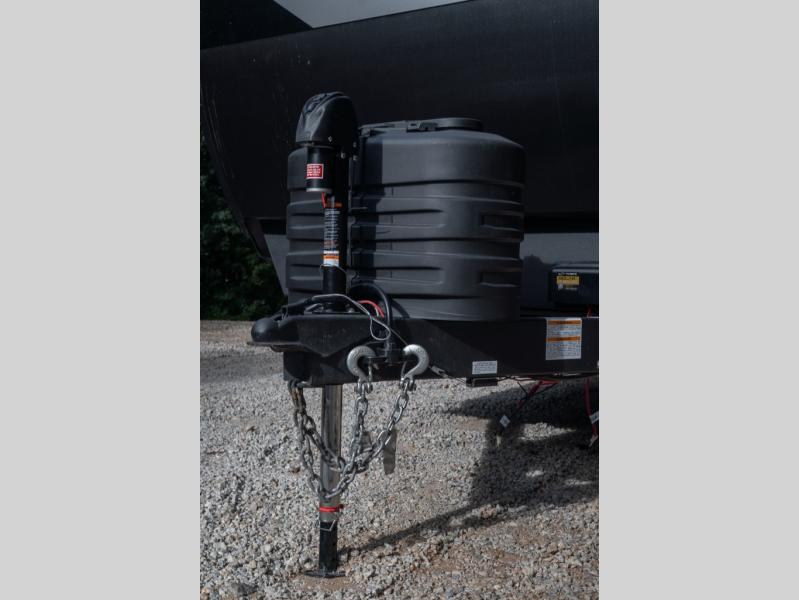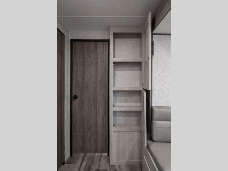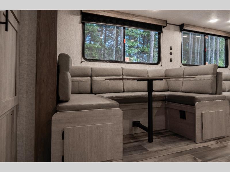 Camp like royalty in this travel trailer! The front private bedroom features a king bed across from a dresser and next to a large wardrobe with overhead cabinets, plus there is a closet with washer and dryer prep. The living area has a 60" jackknife sofa that can be pulled out for a comfortable place to lie down and watch a movie on the HDTV while a fire is roaring in the electric fireplace. The rear private bunkhouse is big enough to house all of the kiddos with the 38" x 74" flip-up bunk above the 72" jackknife sofa and the 38" x 74" bunk above the wardrobe/entertainment center. You can even cook dinner while breathing in fresh air at the outdoor kitchen!
