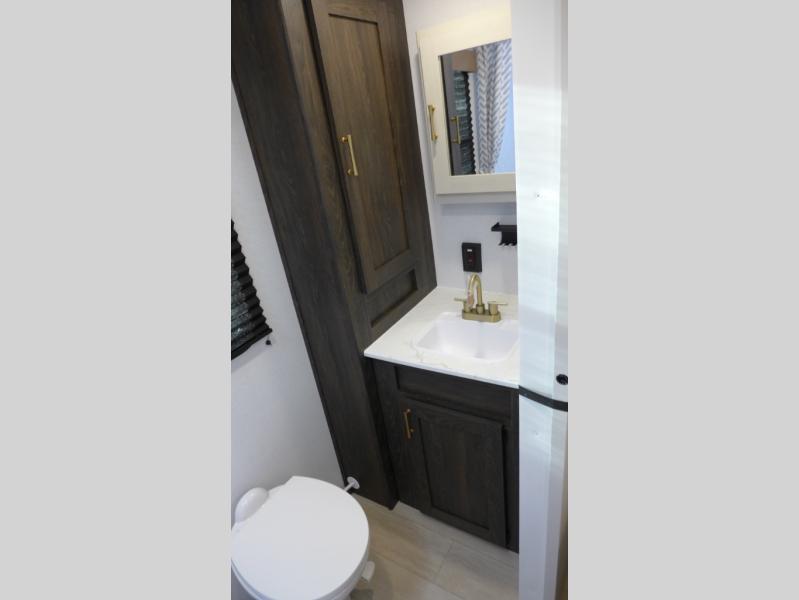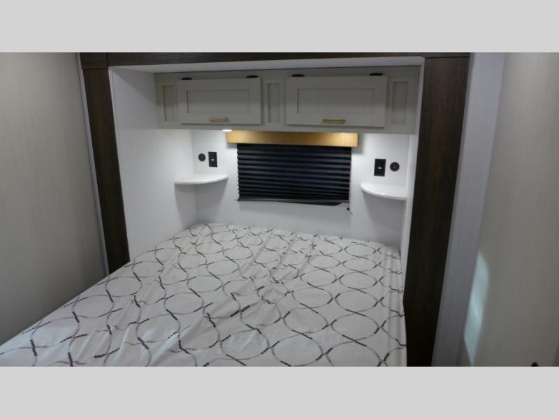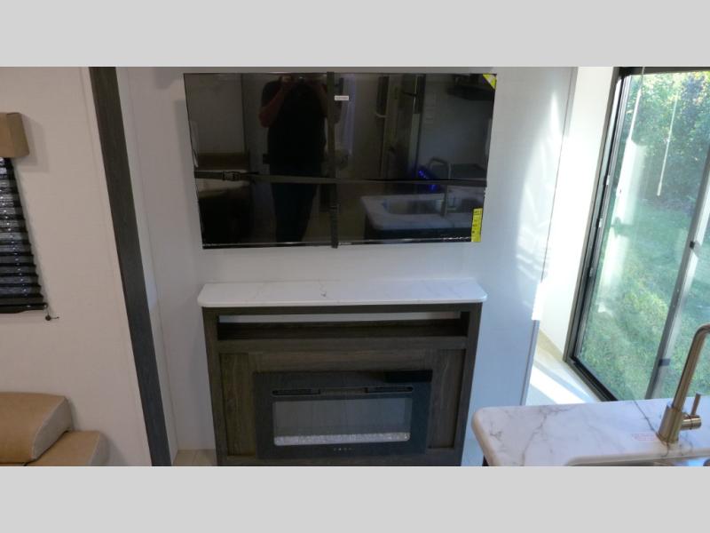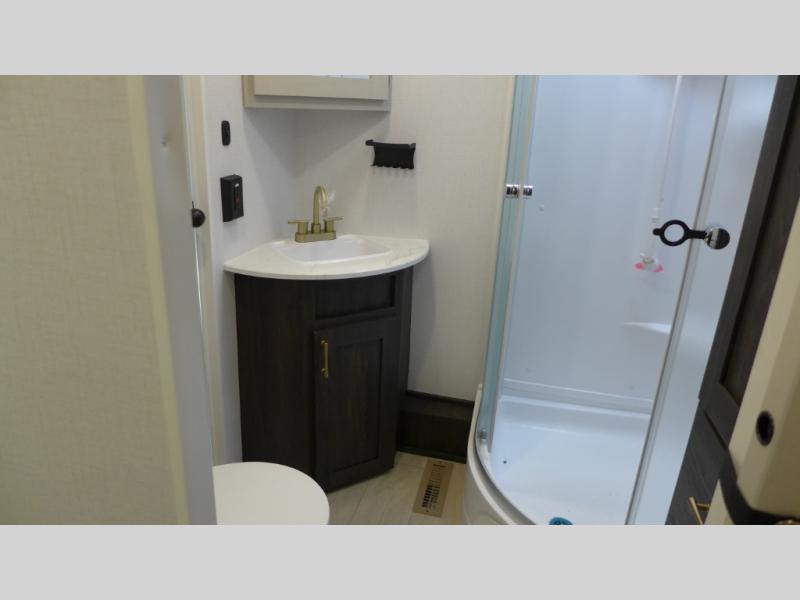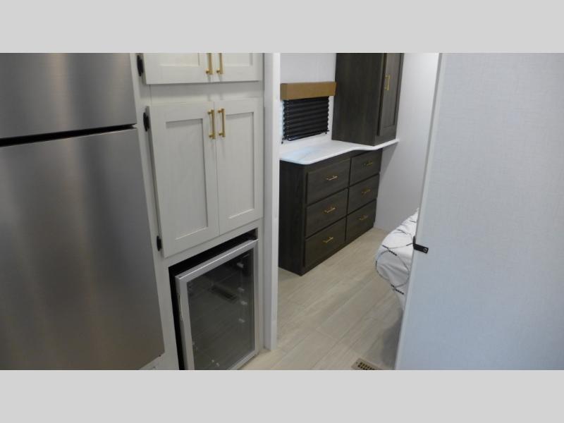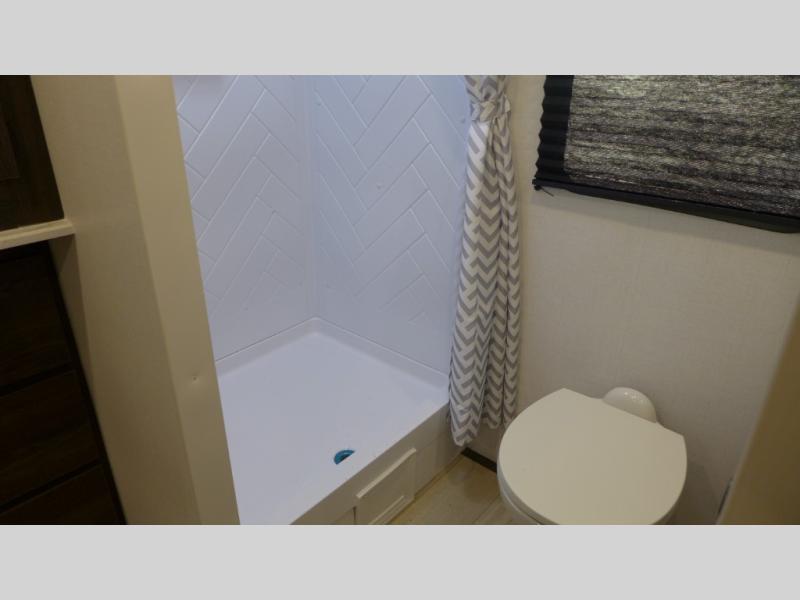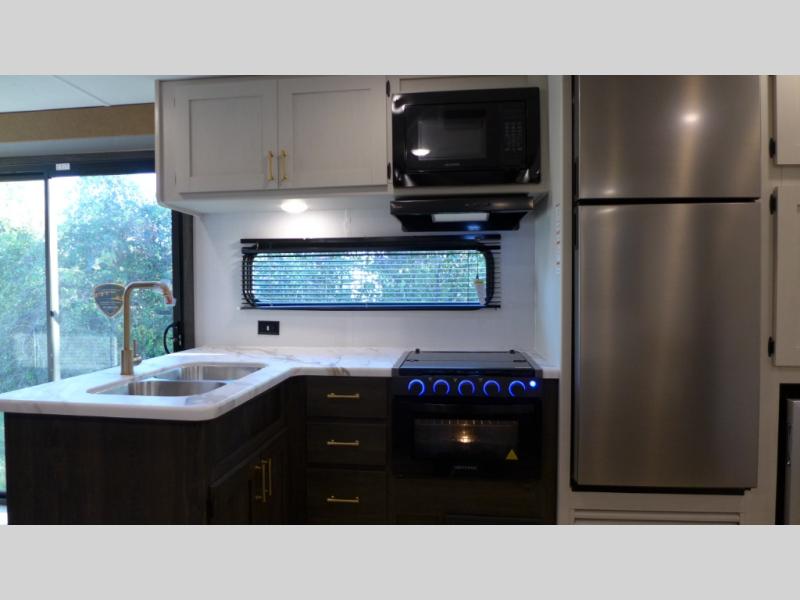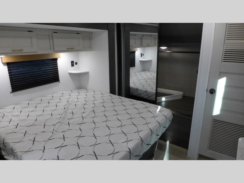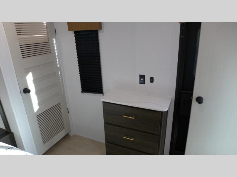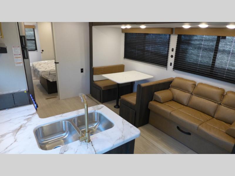 Pack your bags and invite your friends to tag along in this travel trailer! The master suite has an RV queen bed slide across from a dresser next to a wardrobe and its own rear full bathroom with a 30" x 36" shower. The front private bedroom has a king bed slide across from a dresser and a front wardrobe, washer and dryer prep, plus an entrance into the dual entry bathroom which has a 34" radius shower. Both bedrooms have an entrance/exit door to the unit, and the 60" x 72" patio door leads directly into the kitchen/living area. The chef can prepare delicious meals with the three-burner cooktop then you can enjoy them at the 38" booth dinette next to a 60" jackknife sofa for a relaxing evening by the 50" TV at the entertainment center.