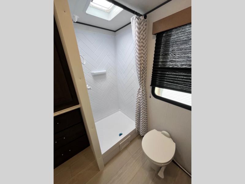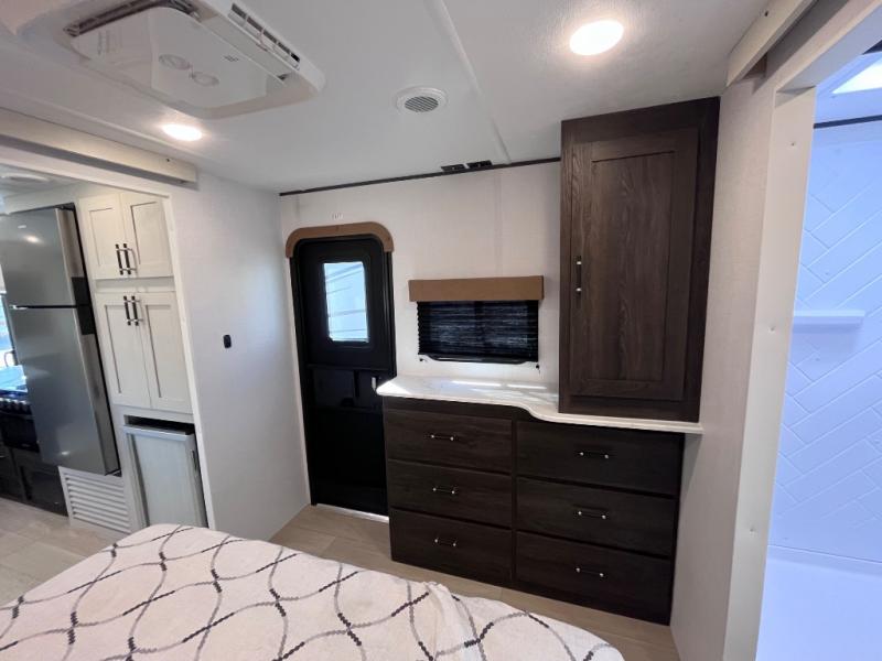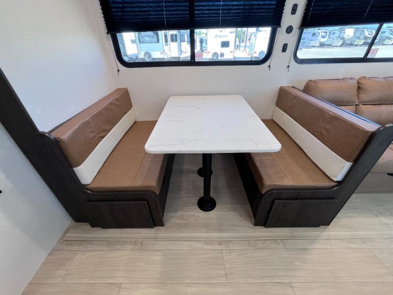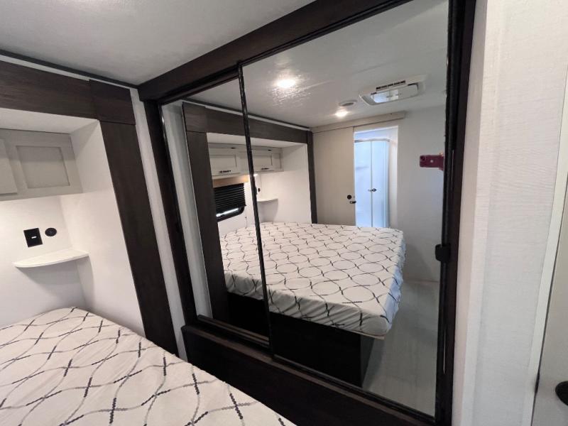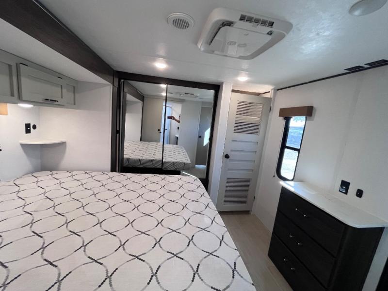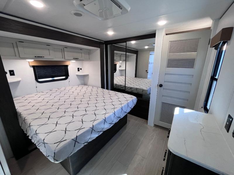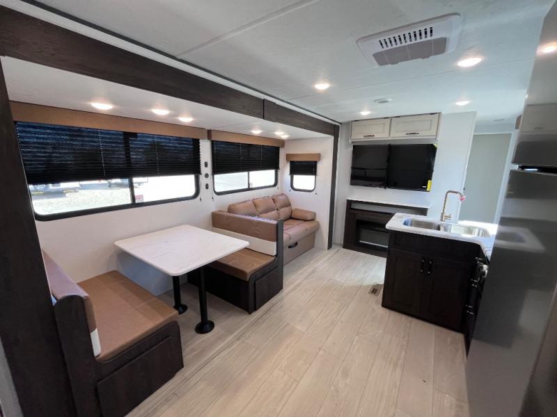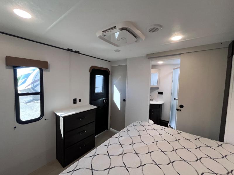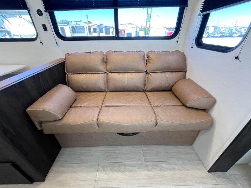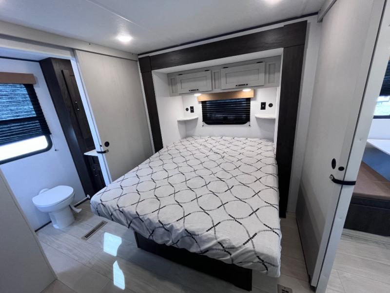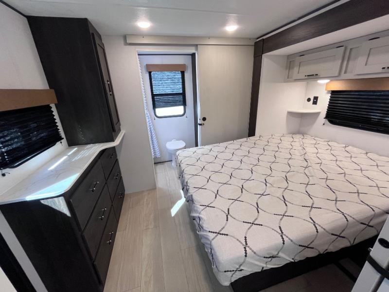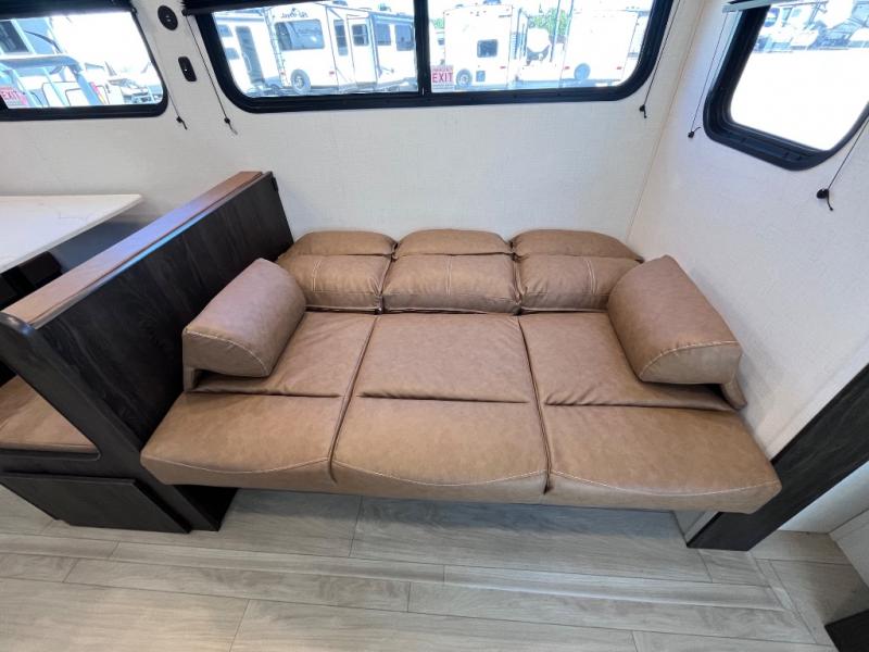 Pack your bags and invite your friends to tag along in this travel trailer! The master suite has an RV queen bed slide across from a dresser next to a wardrobe and it's own rear full bathroom with a 30" x 36" shower. The front private bedroom has a king bed slide across from a dresser and a front wardrobe, washer and dryer prep, plus an entrance into the dual entry bathroom which has a 34" radius shower. Both bedrooms have an entrance/exit door to the unit, and the 60" x 72" patio door leads directly into the kitchen/living area. The chef can prepare delicious meals with the three burner cooktop then you can enjoy them at the 38" booth dinette next to a 60" jackknife sofa for a relaxing evening by the 50" TV at the entertainment center.