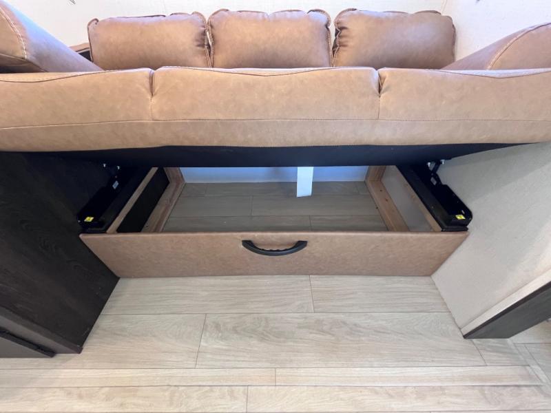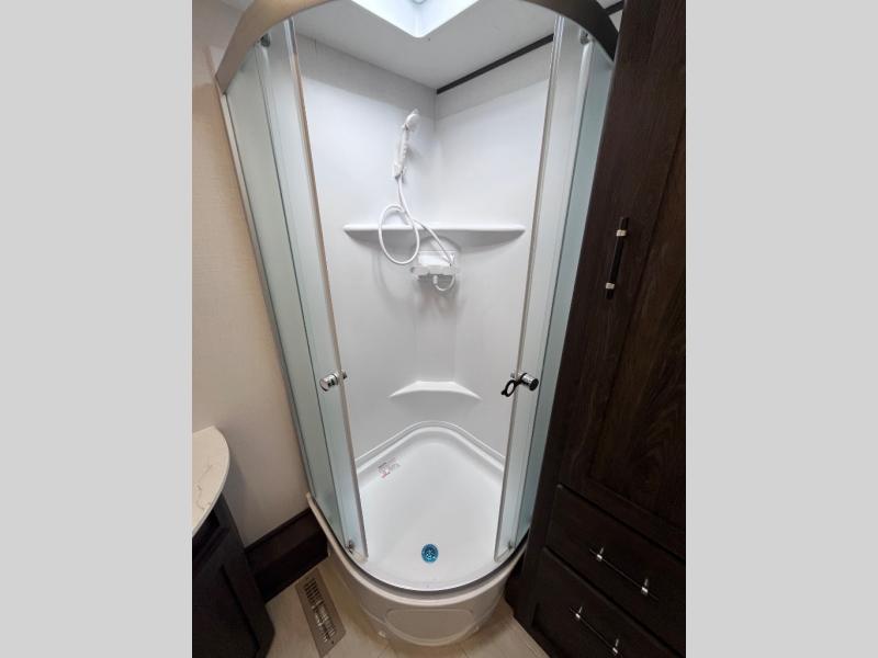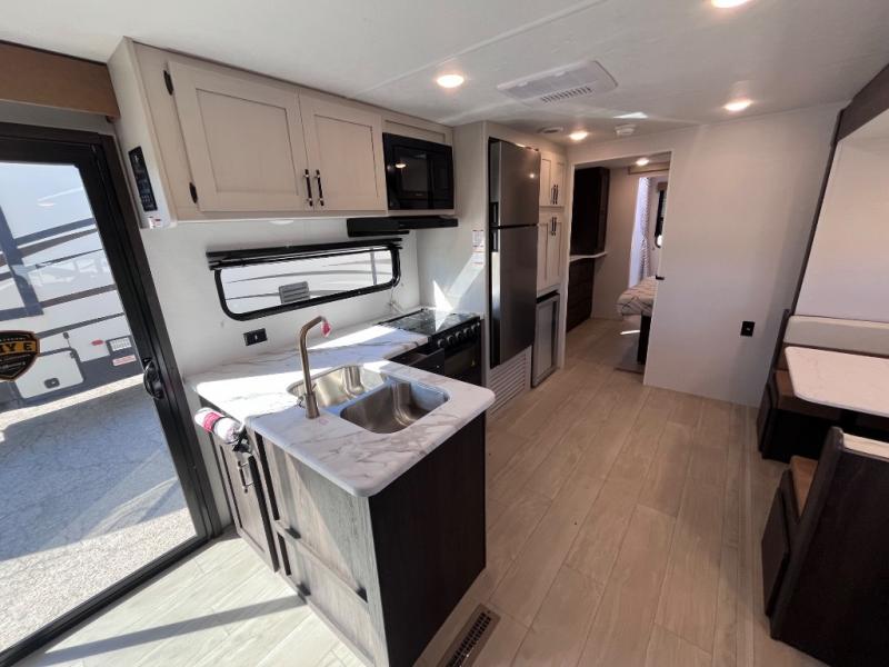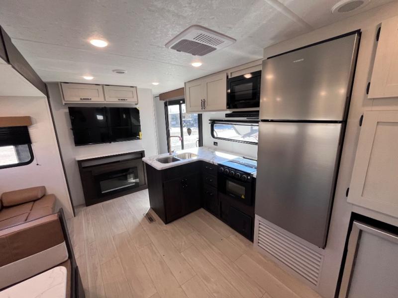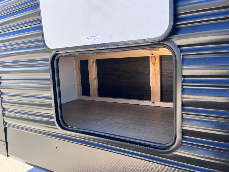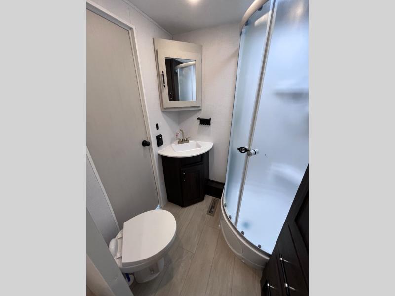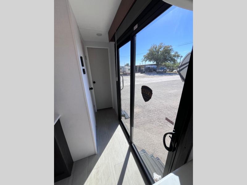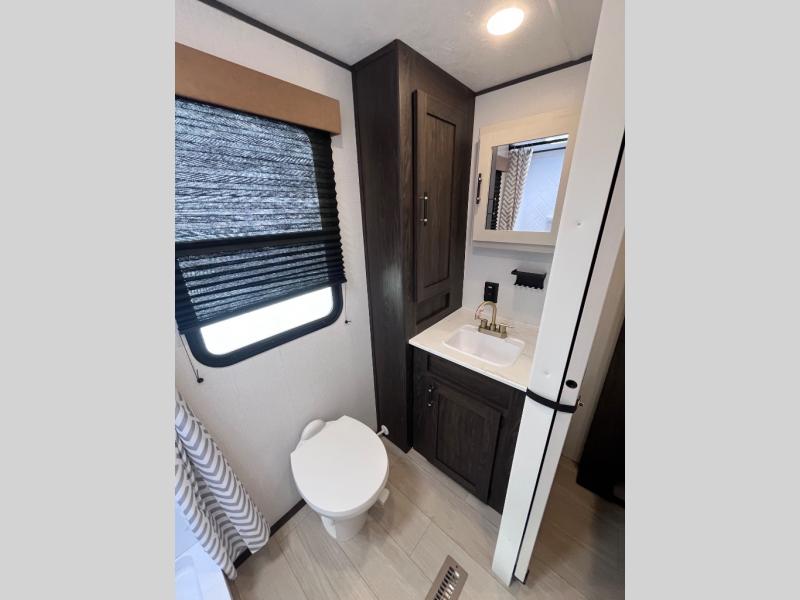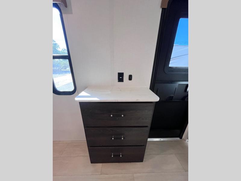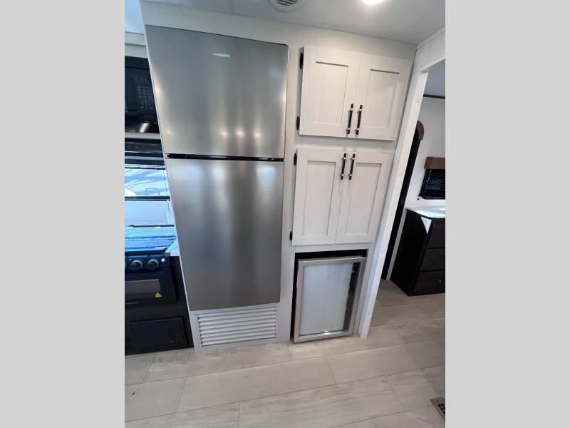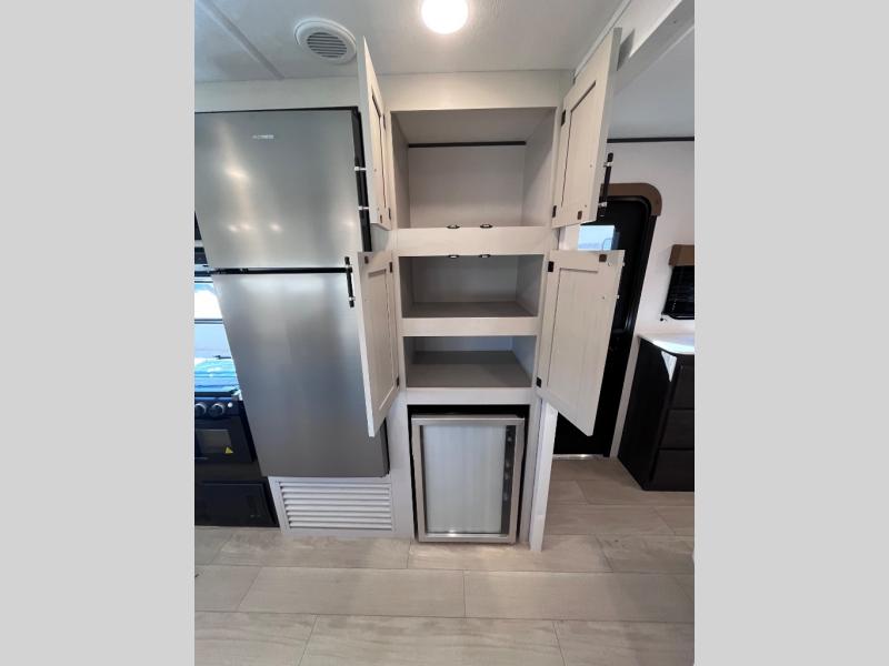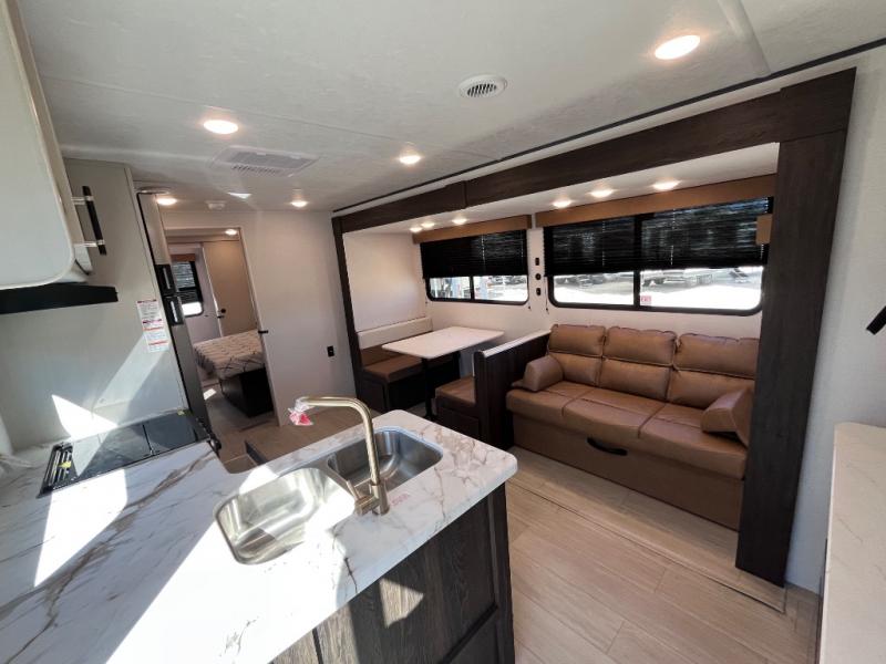 Pack your bags and invite your friends to tag along in this travel trailer! The master suite has an RV queen bed slide across from a dresser next to a wardrobe and it's own rear full bathroom with a 30" x 36" shower. The front private bedroom has a king bed slide across from a dresser and a front wardrobe, washer and dryer prep, plus an entrance into the dual entry bathroom which has a 34" radius shower. Both bedrooms have an entrance/exit door to the unit, and the 60" x 72" patio door leads directly into the kitchen/living area. The chef can prepare delicious meals with the three burner cooktop then you can enjoy them at the 38" booth dinette next to a 60" jackknife sofa for a relaxing evening by the 50" TV at the entertainment center.