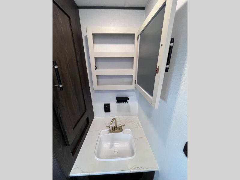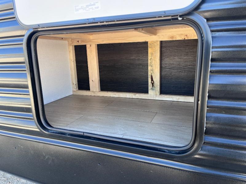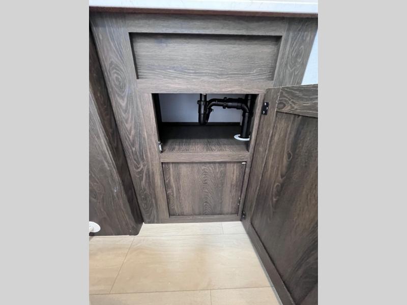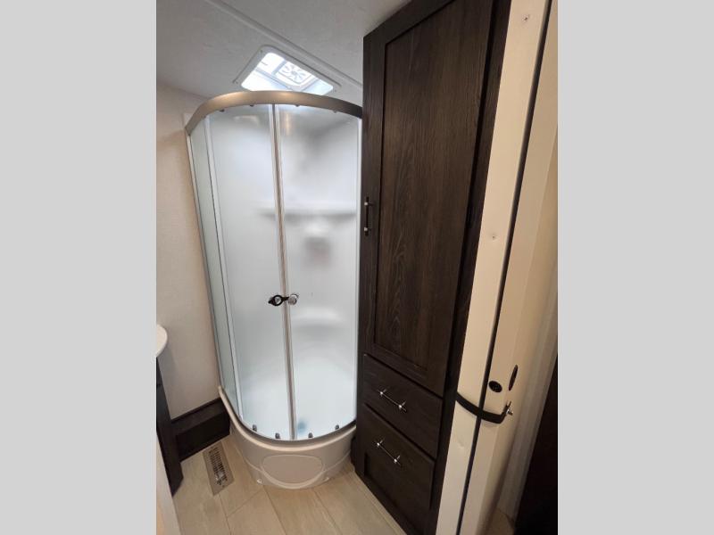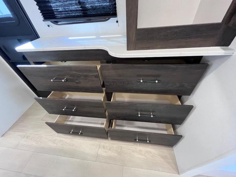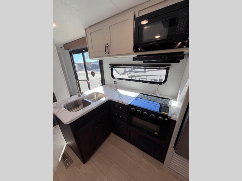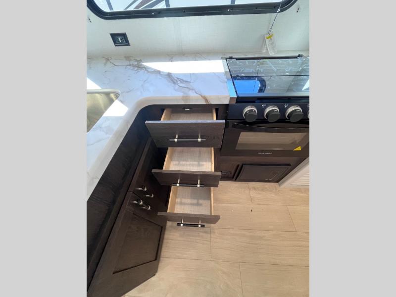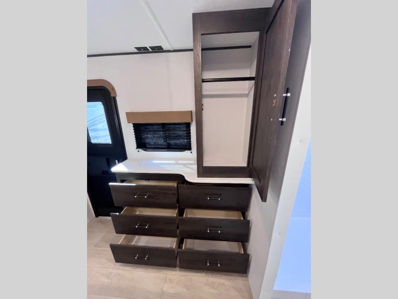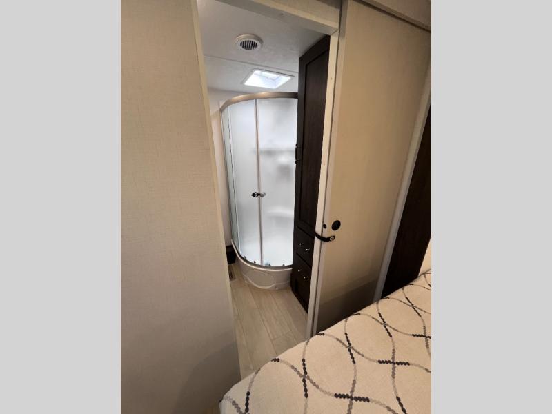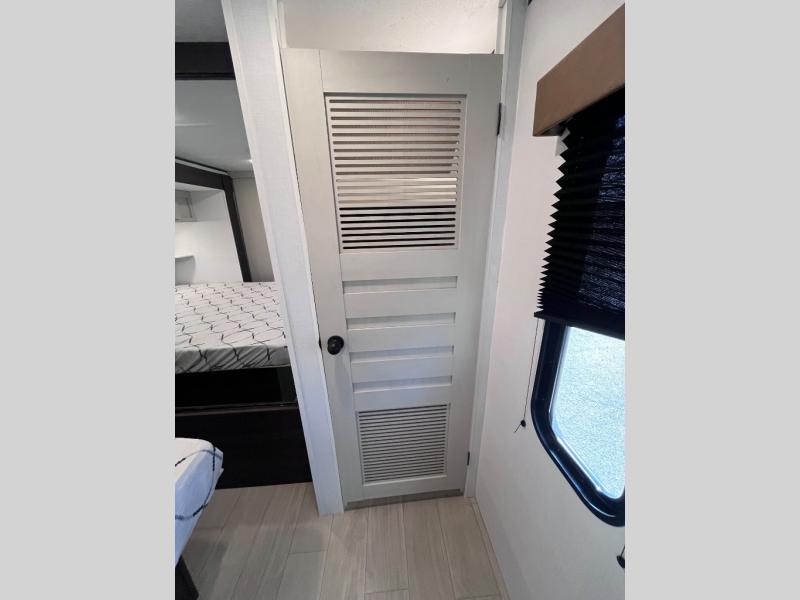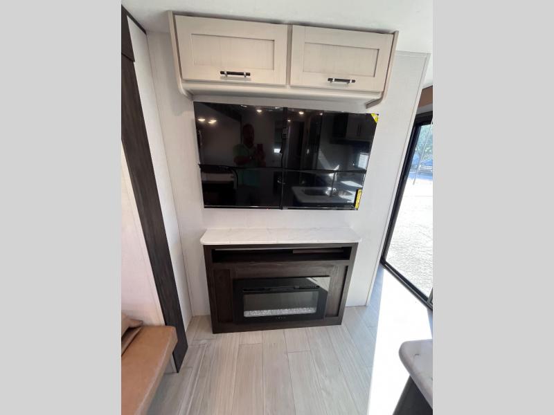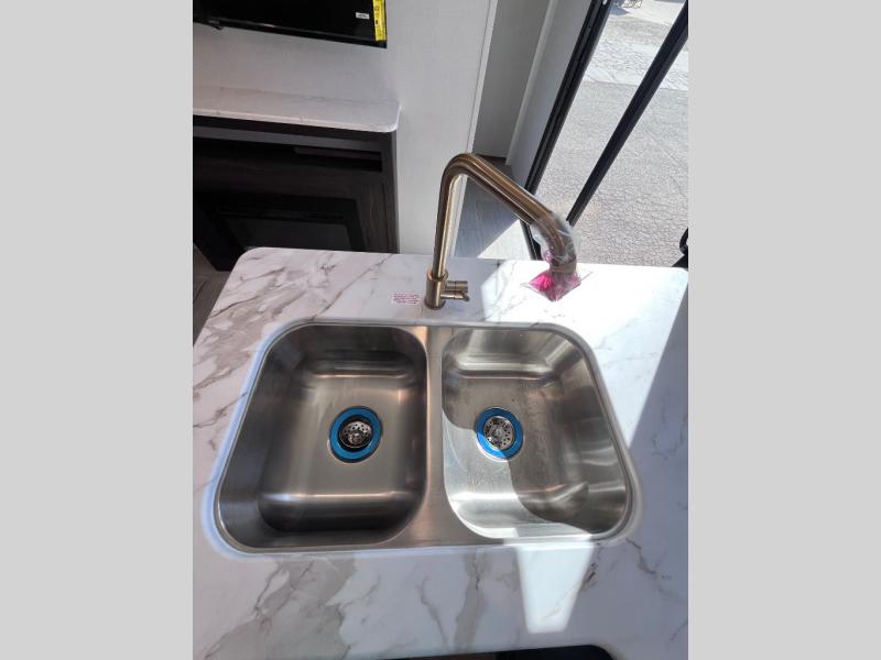 Pack your bags and invite your friends to tag along in this travel trailer! The master suite has an RV queen bed slide across from a dresser next to a wardrobe and it's own rear full bathroom with a 30" x 36" shower. The front private bedroom has a king bed slide across from a dresser and a front wardrobe, washer and dryer prep, plus an entrance into the dual entry bathroom which has a 34" radius shower. Both bedrooms have an entrance/exit door to the unit, and the 60" x 72" patio door leads directly into the kitchen/living area. The chef can prepare delicious meals with the three burner cooktop then you can enjoy them at the 38" booth dinette next to a 60" jackknife sofa for a relaxing evening by the 50" TV at the entertainment center.