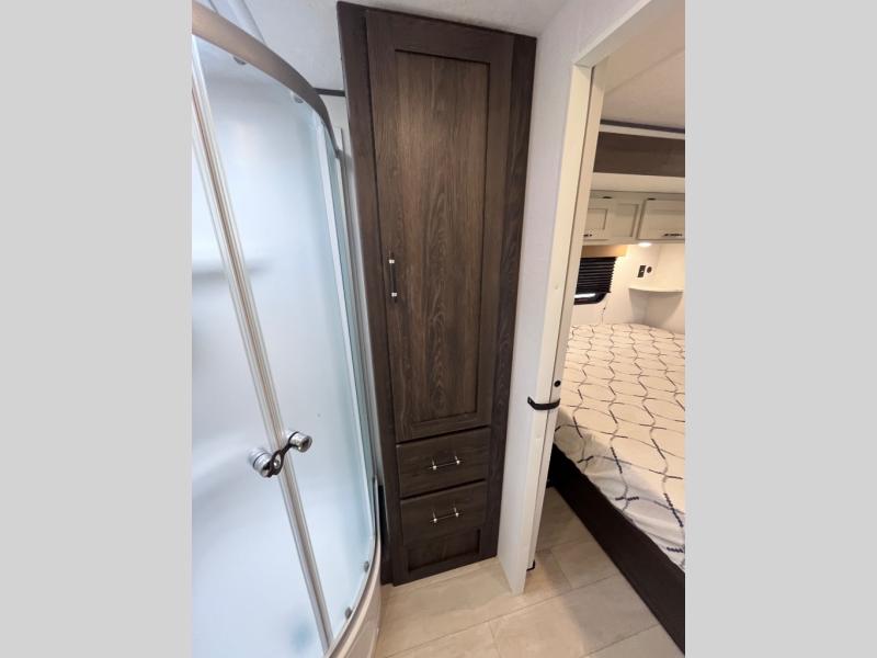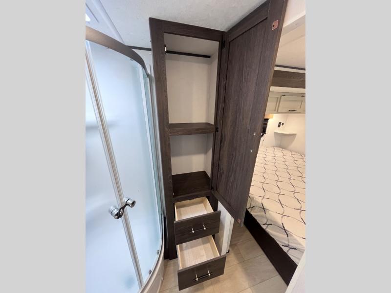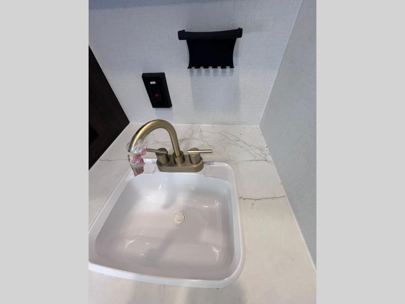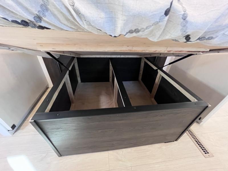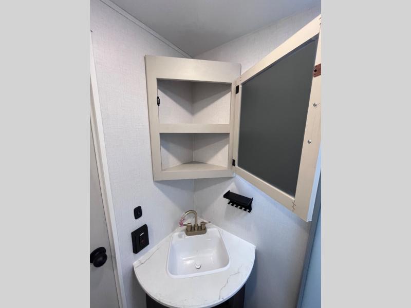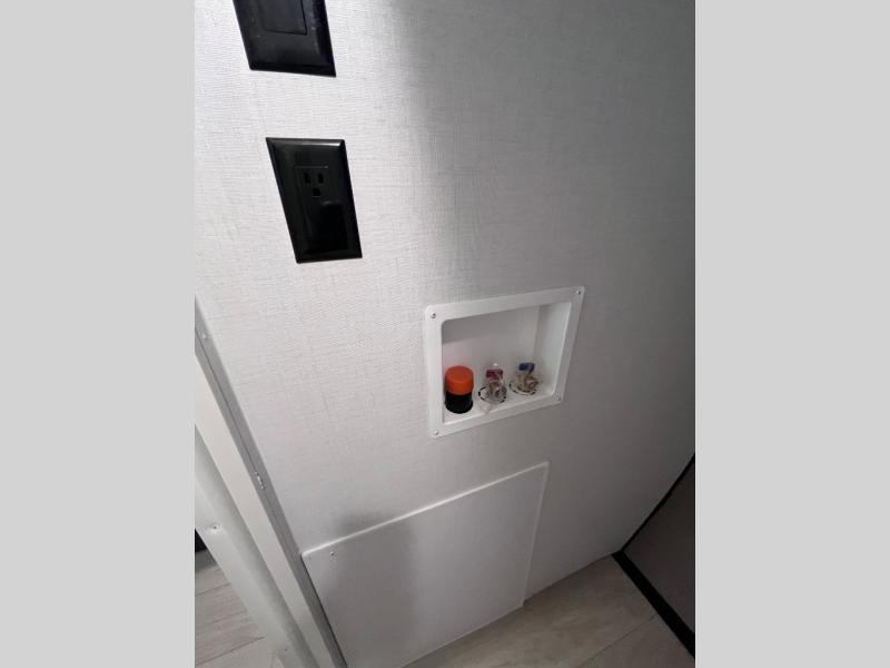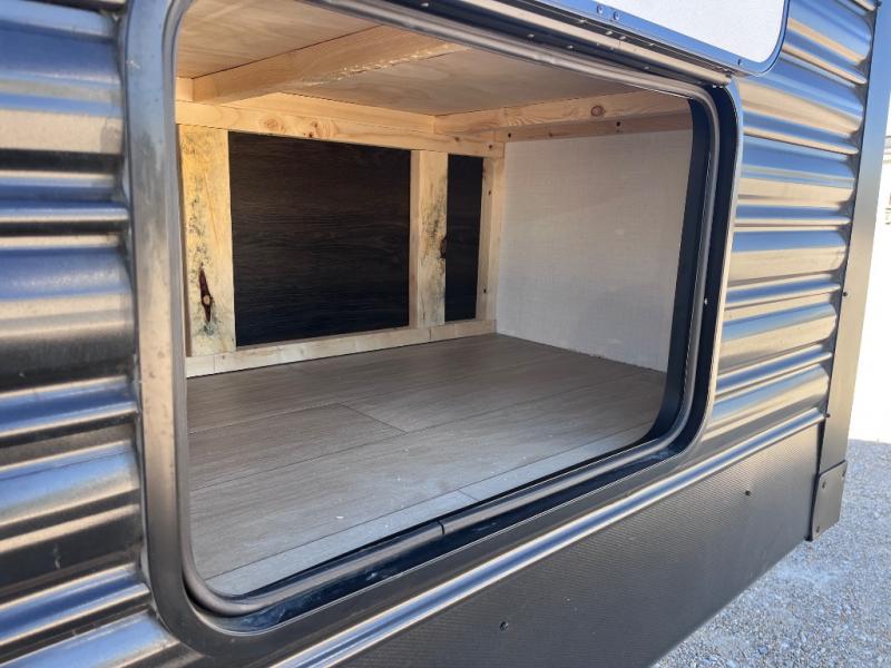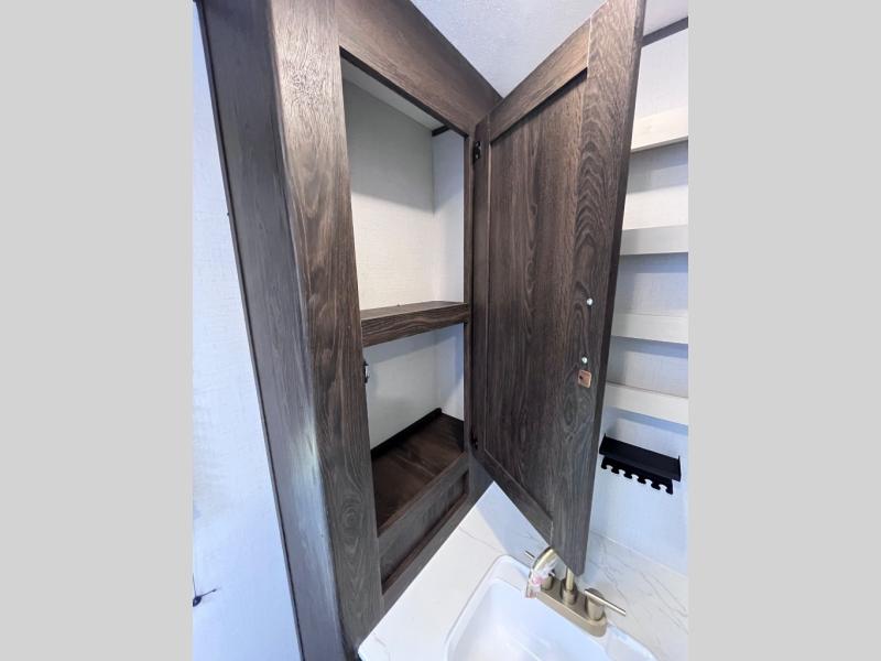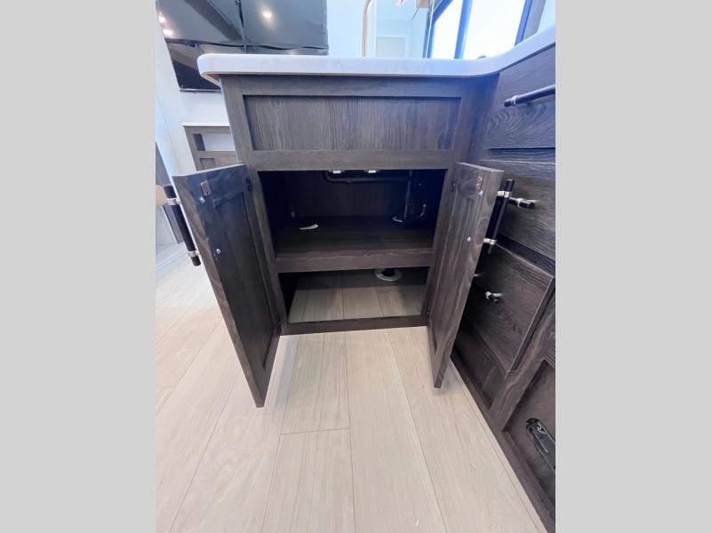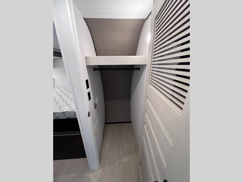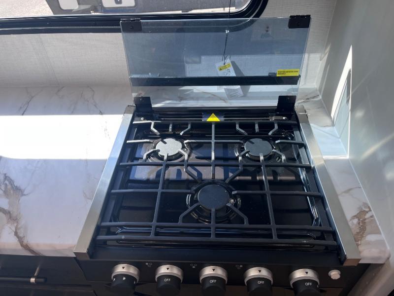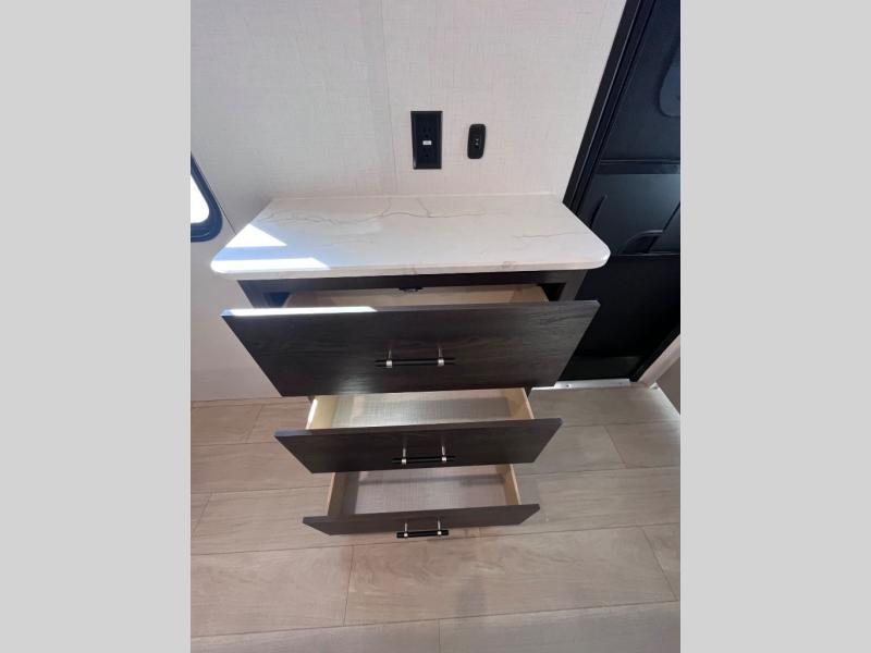 Pack your bags and invite your friends to tag along in this travel trailer! The master suite has an RV queen bed slide across from a dresser next to a wardrobe and it's own rear full bathroom with a 30" x 36" shower. The front private bedroom has a king bed slide across from a dresser and a front wardrobe, washer and dryer prep, plus an entrance into the dual entry bathroom which has a 34" radius shower. Both bedrooms have an entrance/exit door to the unit, and the 60" x 72" patio door leads directly into the kitchen/living area. The chef can prepare delicious meals with the three burner cooktop then you can enjoy them at the 38" booth dinette next to a 60" jackknife sofa for a relaxing evening by the 50" TV at the entertainment center.