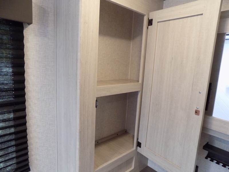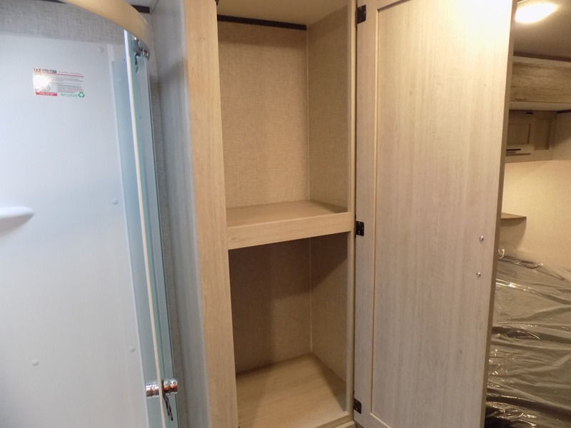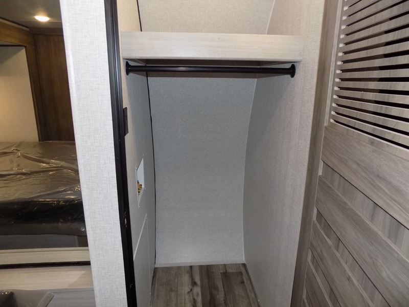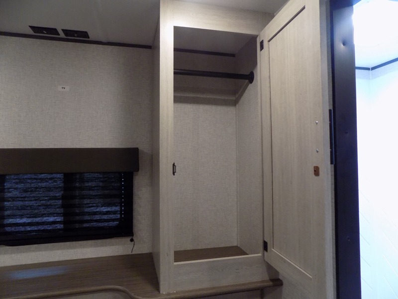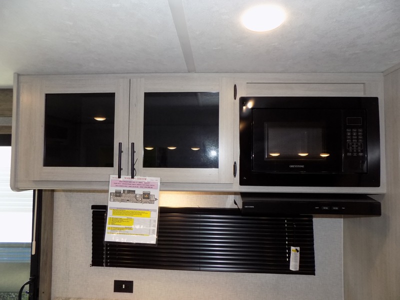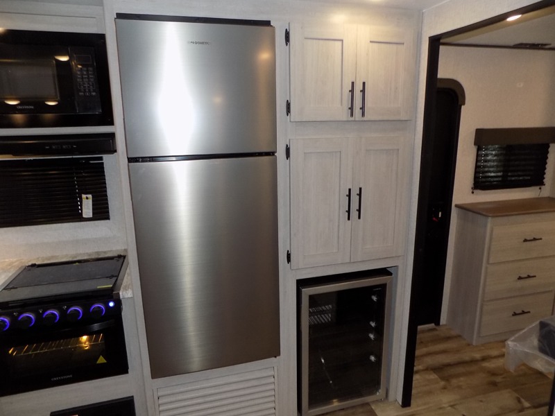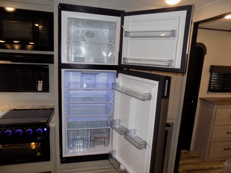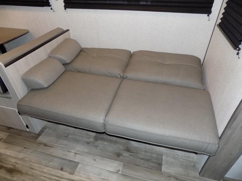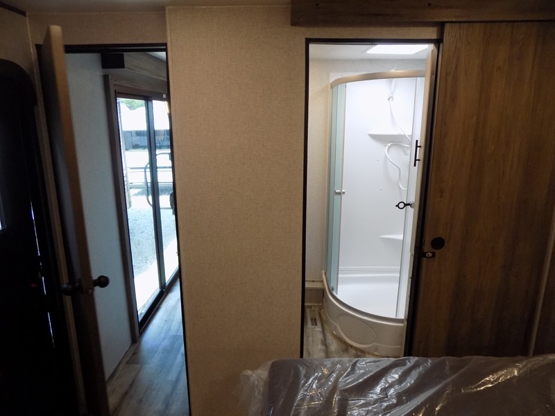 Pack your bags and invite your friends to tag along in this travel trailer! The master suite has an RV queen bed slide across from a dresser next to a wardrobe and its own rear full bathroom with a 30" x 36" shower. The front private bedroom has a king bed slide across from a dresser and a front wardrobe, washer and dryer prep, plus an entrance into the dual entry bathroom which has a 34" radius shower. Both bedrooms have an entrance/exit door to the unit, and the 60" x 72" patio door leads directly into the kitchen/living area. The chef can prepare delicious meals with the three-burner cooktop then you can enjoy them at the 38" booth dinette next to a 60" jackknife sofa for a relaxing evening by the 50" TV at the entertainment center.