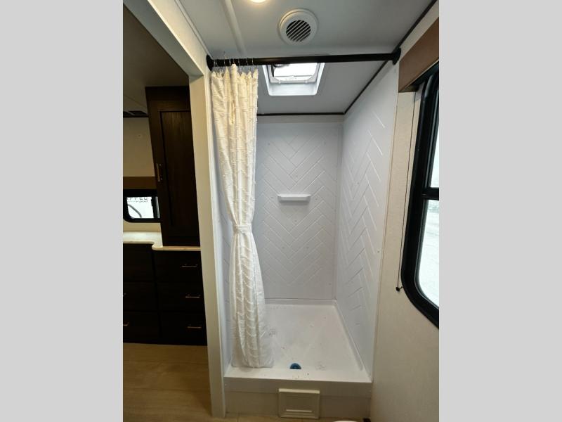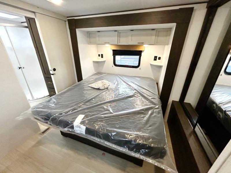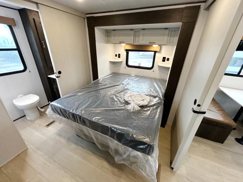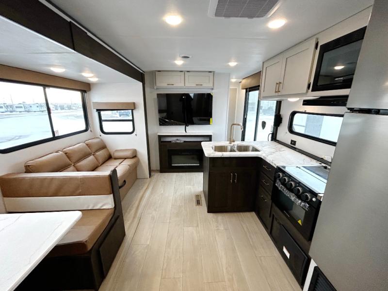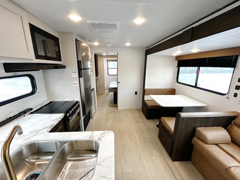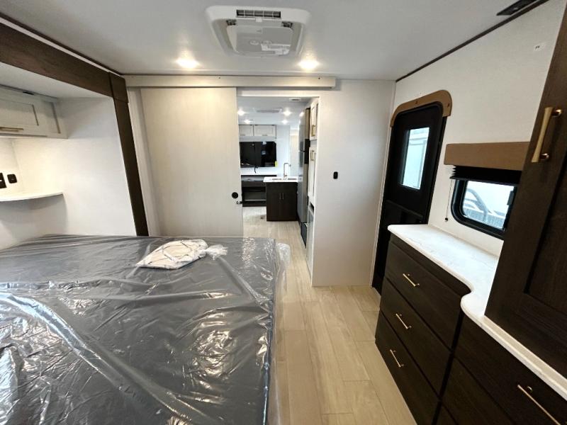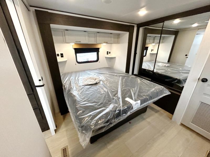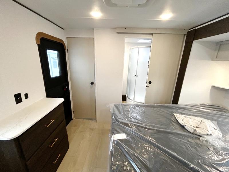 Pack your bags and invite your friends to tag along in this travel trailer! The master suite has an RV queen bed slide across from a dresser next to a wardrobe and its own rear full bathroom with a 30" x 36" shower. The front private bedroom has a king bed slide across from a dresser and a front wardrobe, washer and dryer prep, plus an entrance into the dual entry bathroom which has a 34" radius shower. Both bedrooms have an entrance/exit door to the unit, and the 60" x 72" patio door leads directly into the kitchen/living area. The chef can prepare delicious meals with the three-burner cooktop then you can enjoy them at the 38" booth dinette next to a 60" jackknife sofa for a relaxing evening by the 50" TV at the entertainment center.