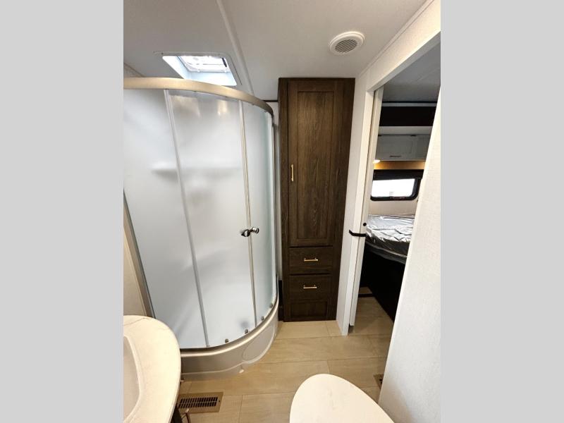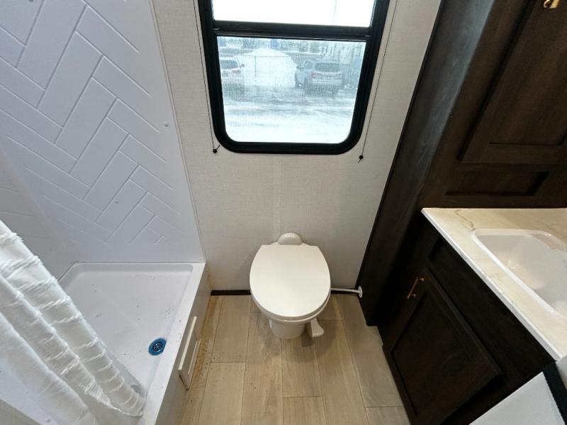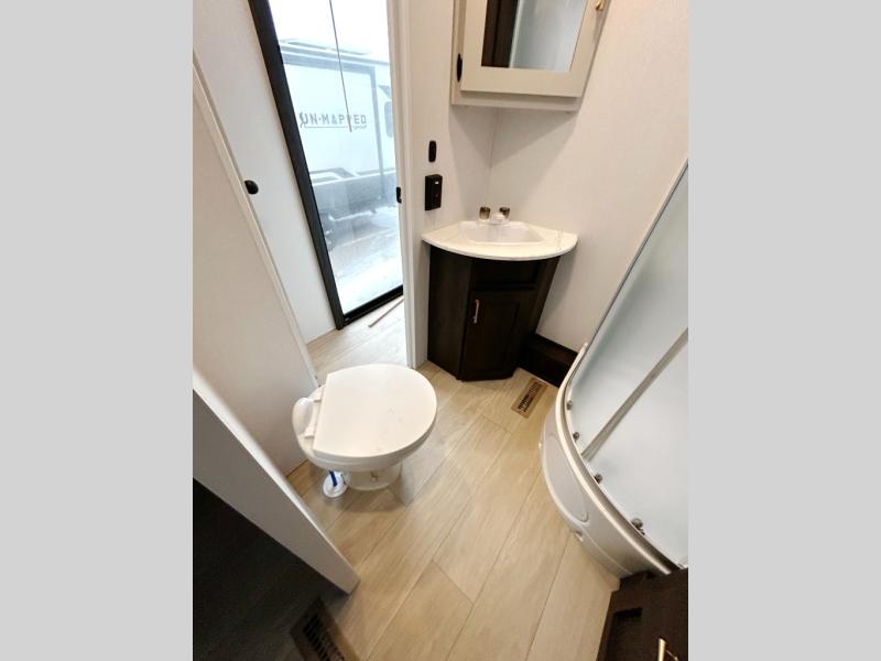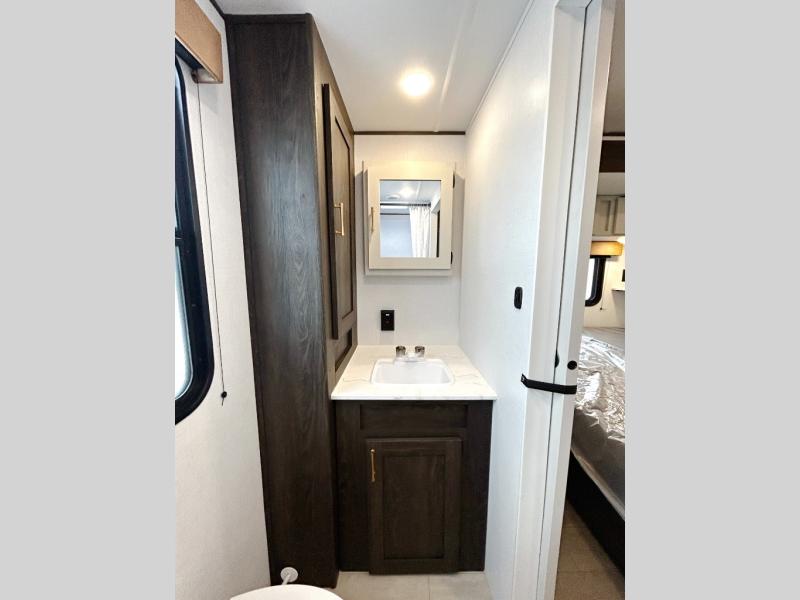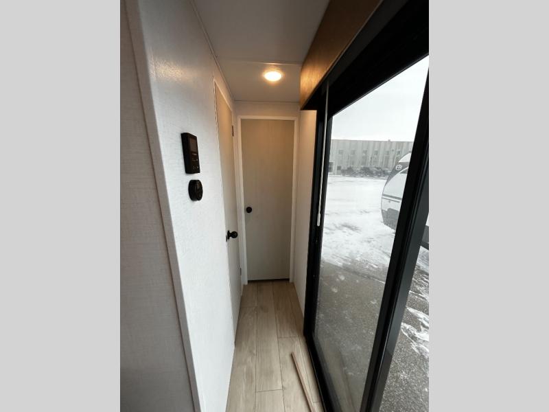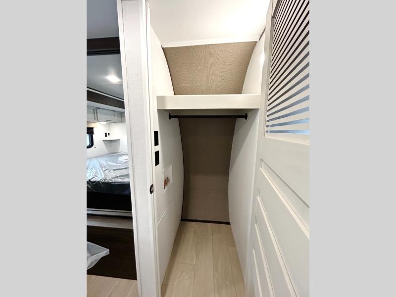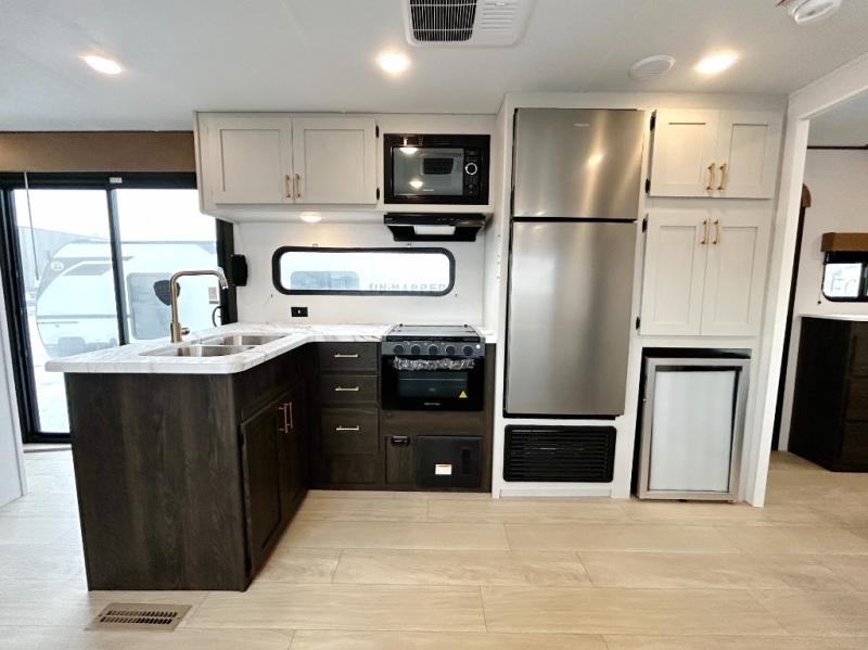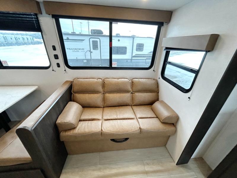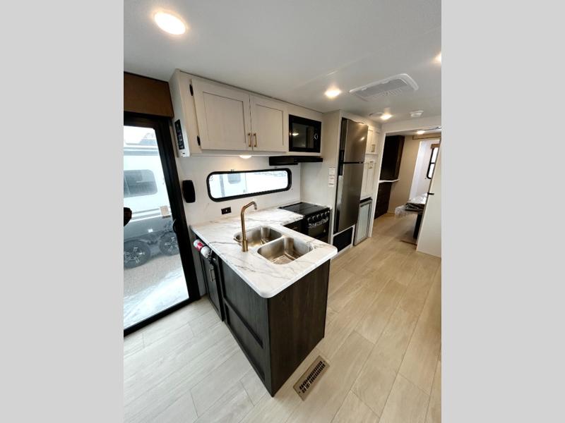 Pack your bags and invite your friends to tag along in this travel trailer! The master suite has an RV queen bed slide across from a dresser next to a wardrobe and its own rear full bathroom with a 30" x 36" shower. The front private bedroom has a king bed slide across from a dresser and a front wardrobe, washer and dryer prep, plus an entrance into the dual entry bathroom which has a 34" radius shower. Both bedrooms have an entrance/exit door to the unit, and the 60" x 72" patio door leads directly into the kitchen/living area. The chef can prepare delicious meals with the three-burner cooktop then you can enjoy them at the 38" booth dinette next to a 60" jackknife sofa for a relaxing evening by the 50" TV at the entertainment center.