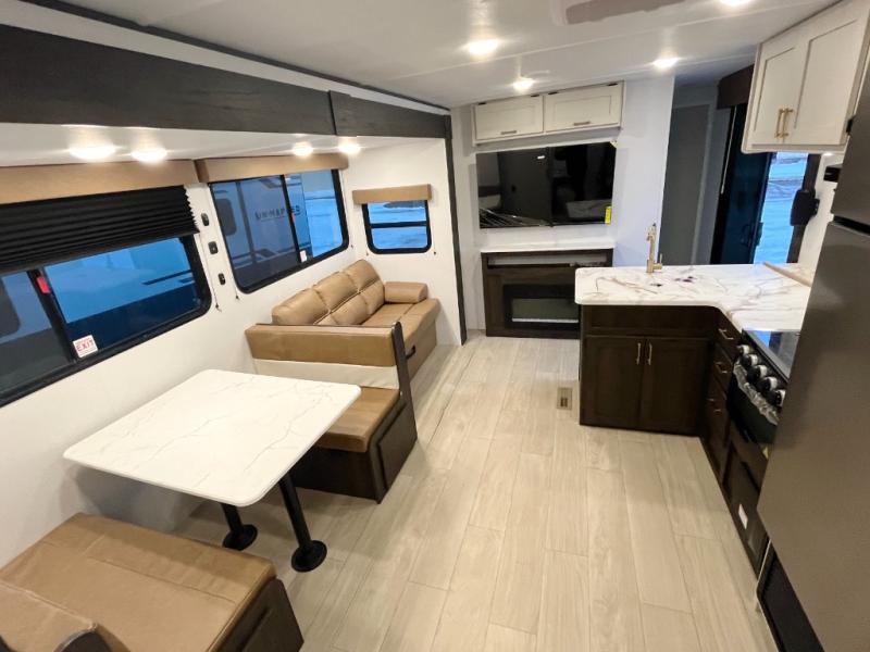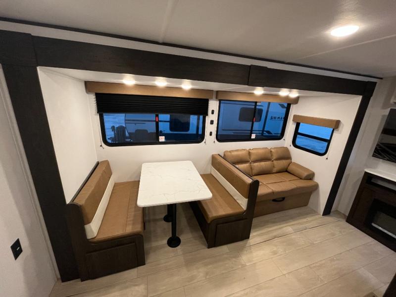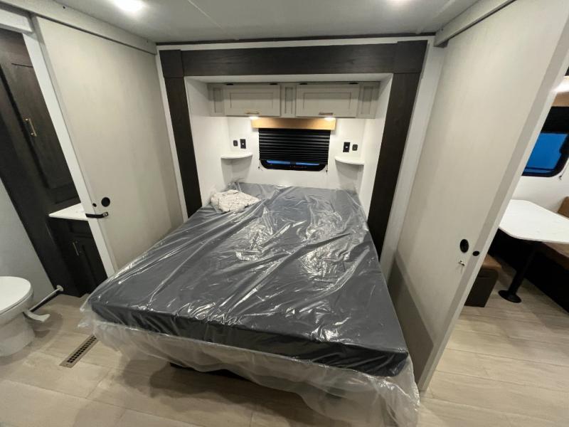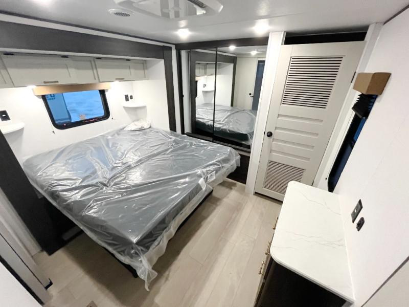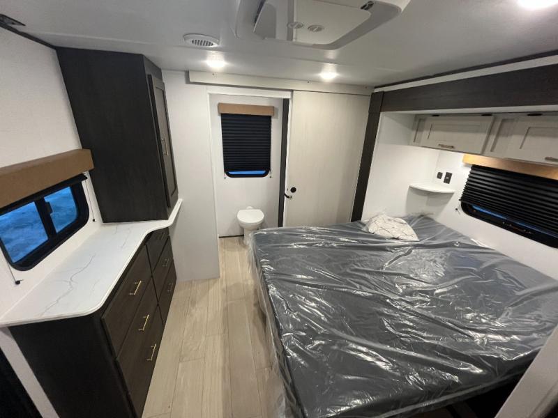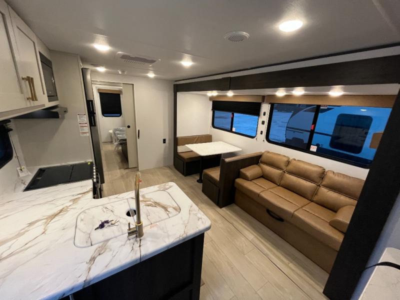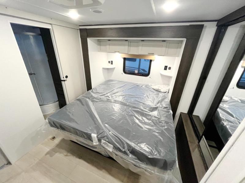 Pack your bags and invite your friends to tag along in this travel trailer! The master suite has an RV queen bed slide across from a dresser next to a wardrobe and its own rear full bathroom with a 30" x 36" shower. The front private bedroom has a king bed slide across from a dresser and a front wardrobe, washer and dryer prep, plus an entrance into the dual entry bathroom which has a 34" radius shower. Both bedrooms have an entrance/exit door to the unit, and the 60" x 72" patio door leads directly into the kitchen/living area. The chef can prepare delicious meals with the three-burner cooktop then you can enjoy them at the 38" booth dinette next to a 60" jackknife sofa for a relaxing evening by the 50" TV at the entertainment center.