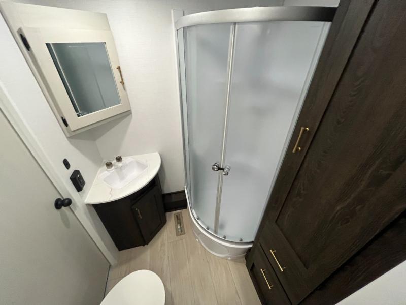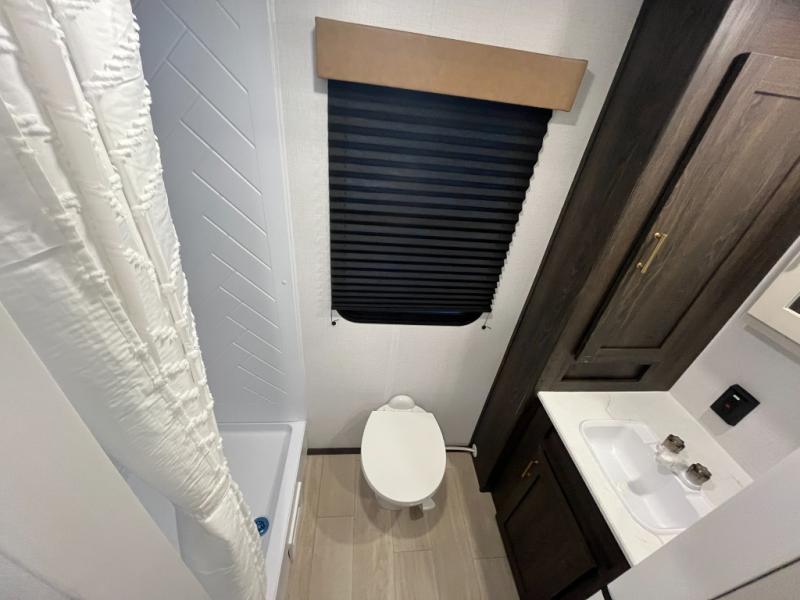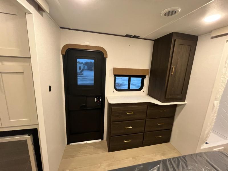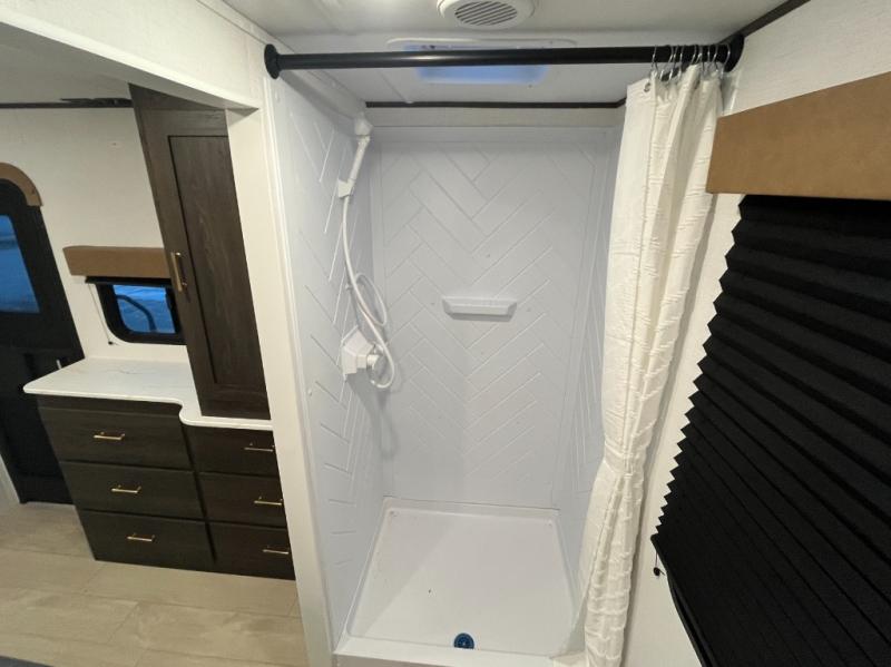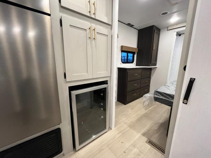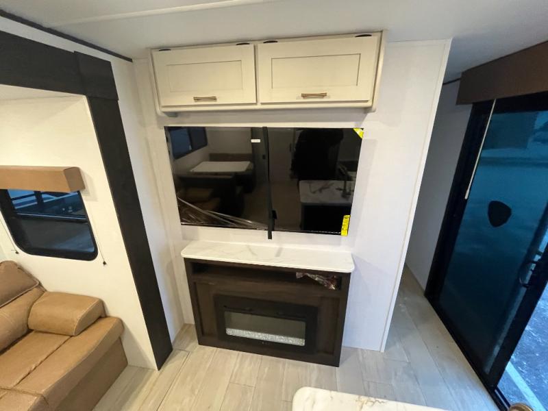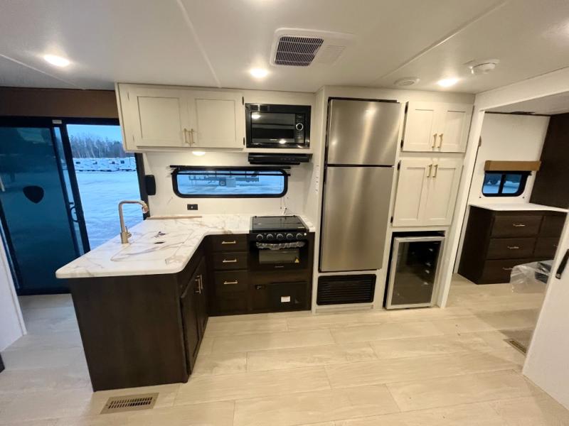 Pack your bags and invite your friends to tag along in this travel trailer! The master suite has an RV queen bed slide across from a dresser next to a wardrobe and its own rear full bathroom with a 30" x 36" shower. The front private bedroom has a king bed slide across from a dresser and a front wardrobe, washer and dryer prep, plus an entrance into the dual entry bathroom which has a 34" radius shower. Both bedrooms have an entrance/exit door to the unit, and the 60" x 72" patio door leads directly into the kitchen/living area. The chef can prepare delicious meals with the three-burner cooktop then you can enjoy them at the 38" booth dinette next to a 60" jackknife sofa for a relaxing evening by the 50" TV at the entertainment center.