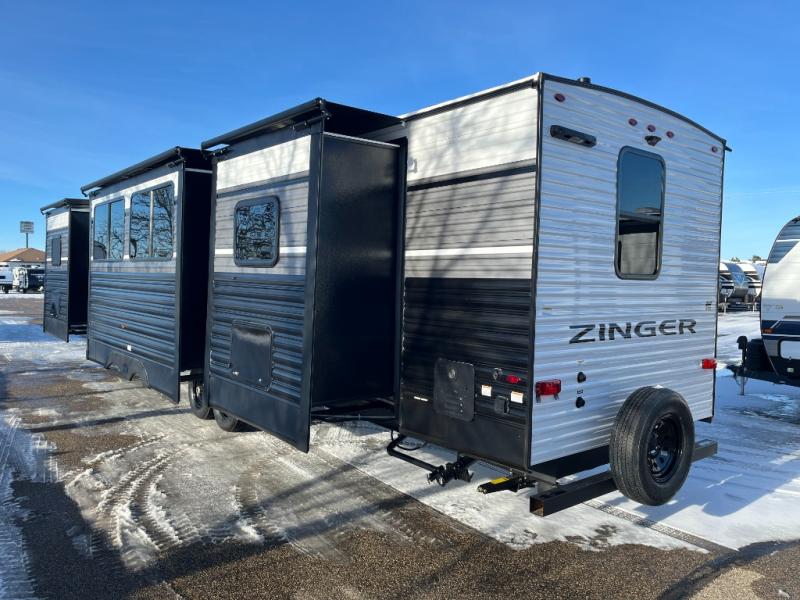 Lead your family to a great vacation getaway in any one of these CrossRoads RV Zinger travel trailers! They feature an aerodynamic front end, Keyed-Alike door locks, Secure Stance entry steps, and exterior speakers with LED accents. The interior of each model includes kitchen backsplash and pressed countertops, along with generous storage, designer valances, and LED lighting to keep your space well lit. You will also appreciate USB ports to keep your electronics charged up, and there is an AM/FM stereo with a Bluetooth soundbar to keep the party going!