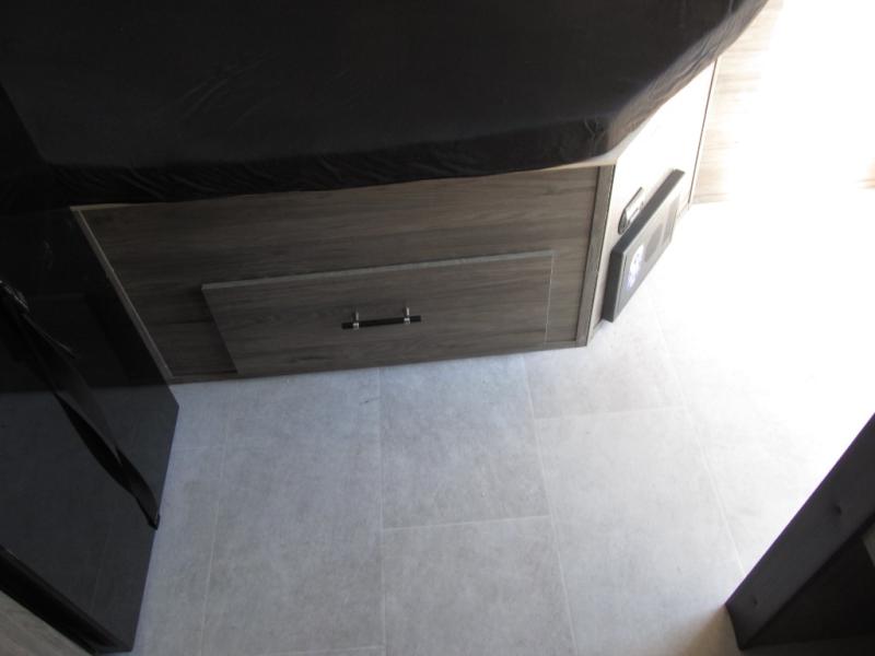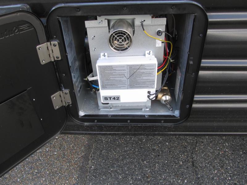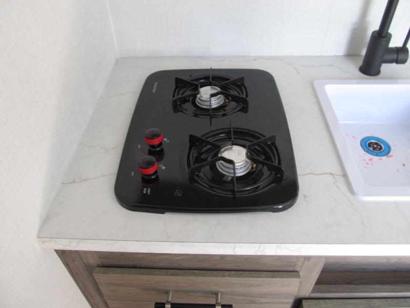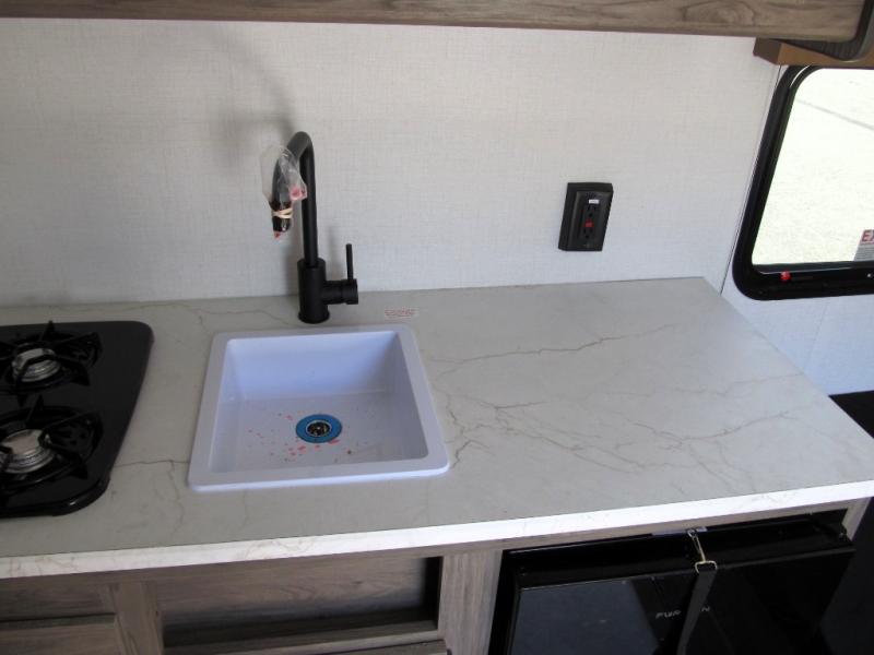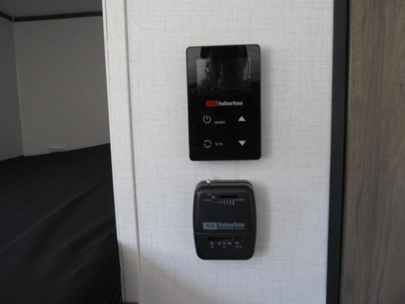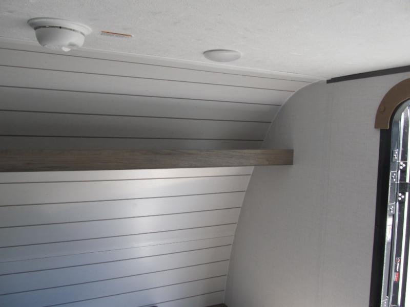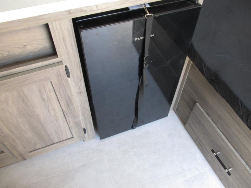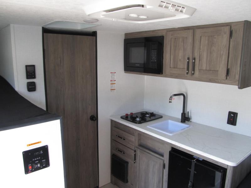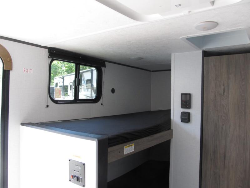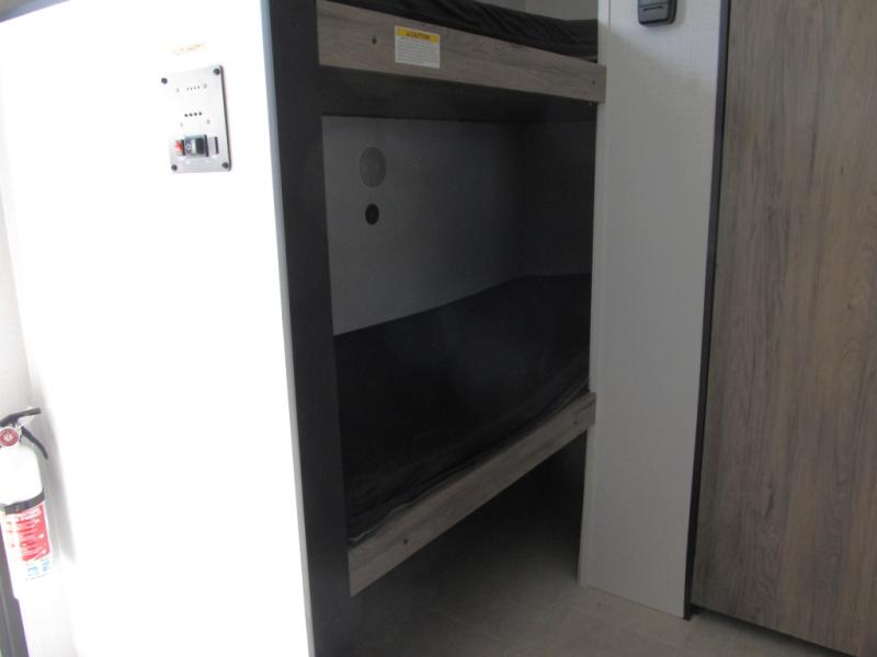This compact, yet cozy travel trailer is perfect for weekend trips to the lake. There is a queen bed up front with overhead cabinets for your books, board games and more. Your guests or littles ones can claim the bunk beds in the rear corner, and everyone can stay clean with the private shower and toilet. A functional kitchenette will let you make meals for your crew, and the refrigerator will keep cold items fresh!