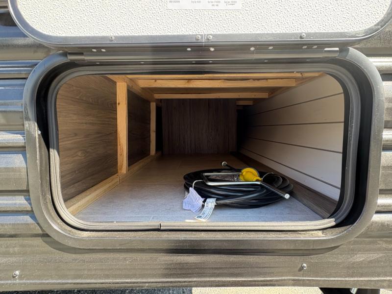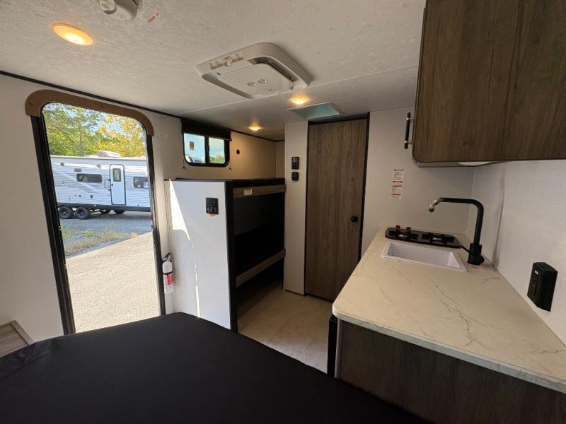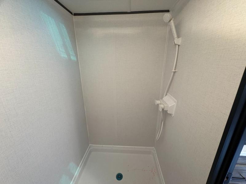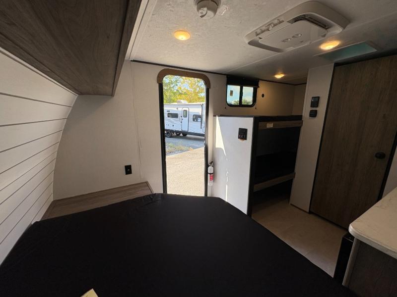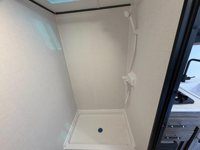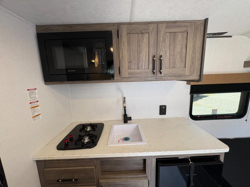 This compact, yet cozy travel trailer is perfect for weekend trips to the lake. There is a queen bed up front with overhead cabinets for your books, board games and more. Your guests or littles ones can claim the bunk beds in the rear corner, and everyone can stay clean with the private shower and toilet. A functional kitchenette will let you make meals for your crew, and the refrigerator will keep cold items fresh!