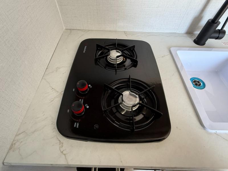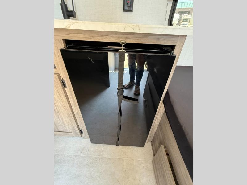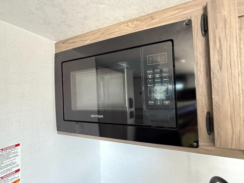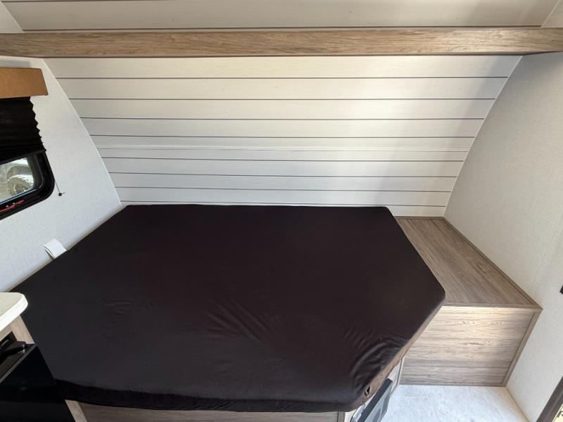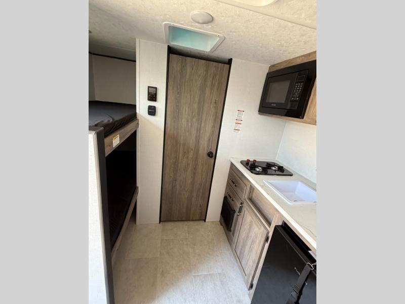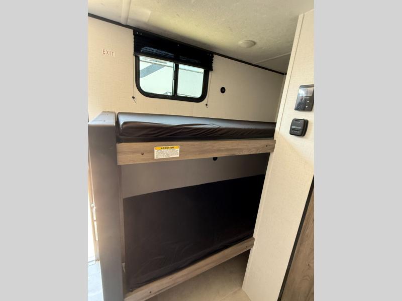This compact, yet cozy travel trailer is perfect for weekend trips to the lake. There is a queen bed up front with overhead cabinets for your books, board games and more. Your guests or littles ones can claim the bunk beds in the rear corner, and everyone can stay clean with the private shower and toilet. A functional kitchenette will let you make meals for your crew, and the refrigerator will keep cold items fresh!