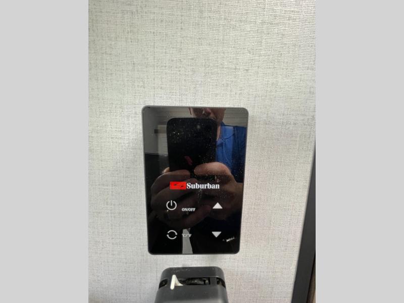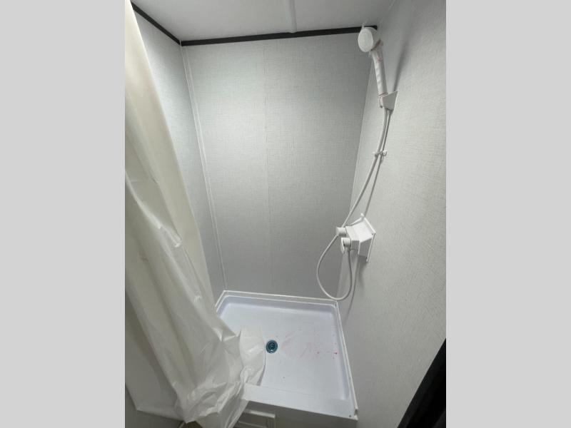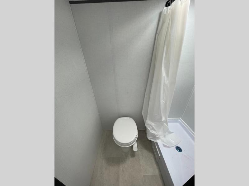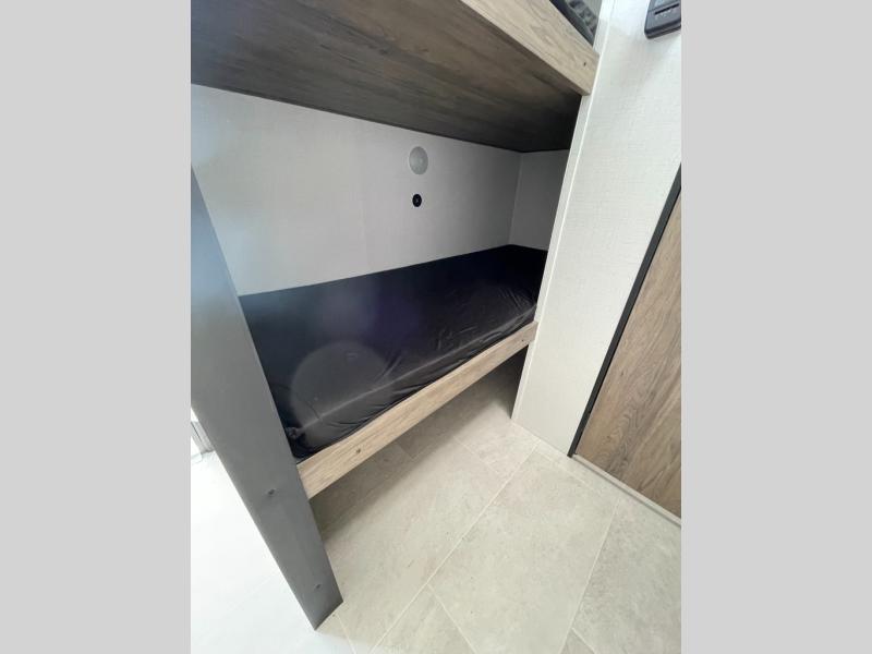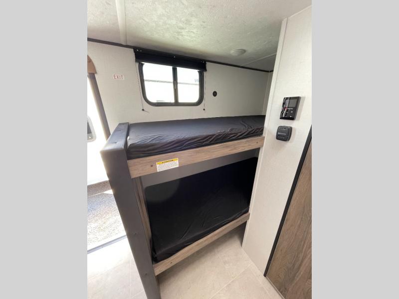 This compact, yet cozy travel trailer is perfect for weekend trips to the lake. There is a queen bed up front with overhead cabinets for your books, board games and more. Your guests or littles ones can claim the bunk beds in the rear corner, and everyone can stay clean with the private shower and toilet. A functional kitchenette will let you make meals for your crew, and the refrigerator will keep cold items fresh!