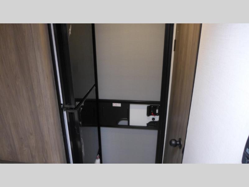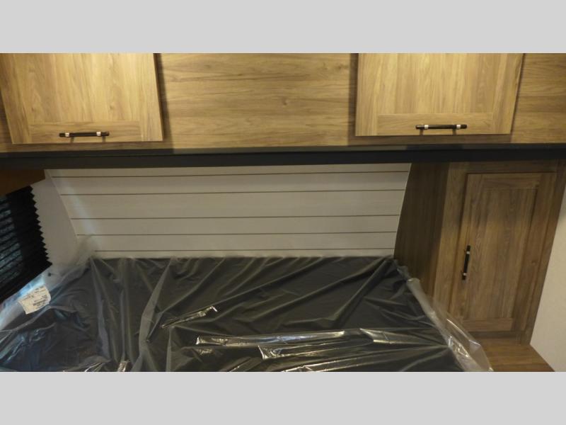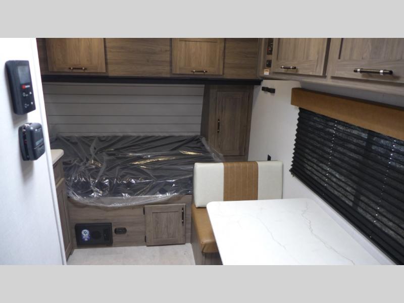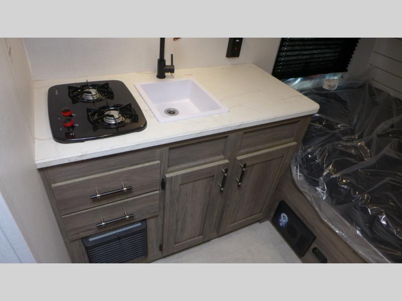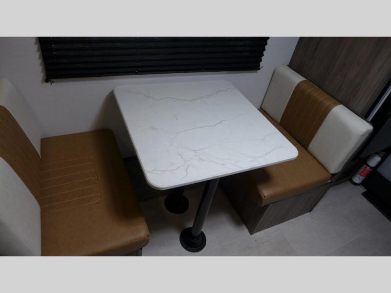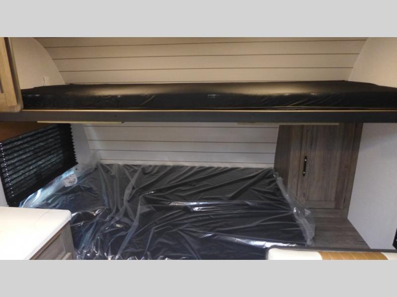 This compact, yet cozy travel trailer is perfect for weekend trips to the lake. There is a full-size bed up front with a fold-down bunk above, plus a wardrobe for clothes. A functional kitchenette will let you make meals for your crew, and there is a booth dinette where you can dine together!