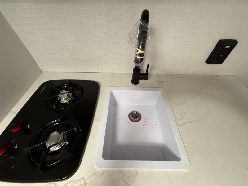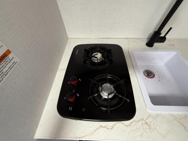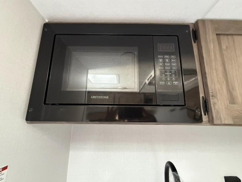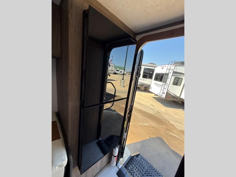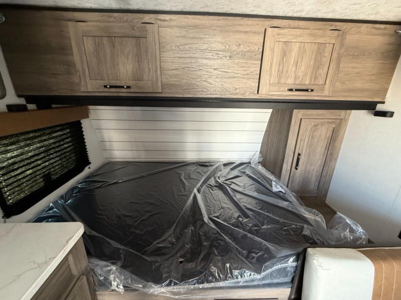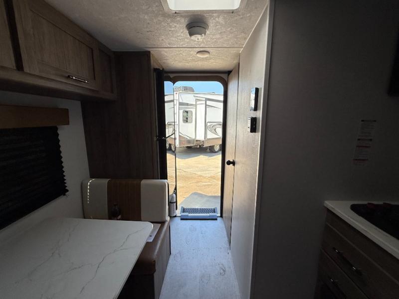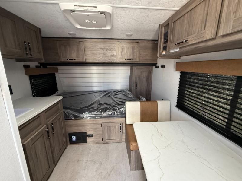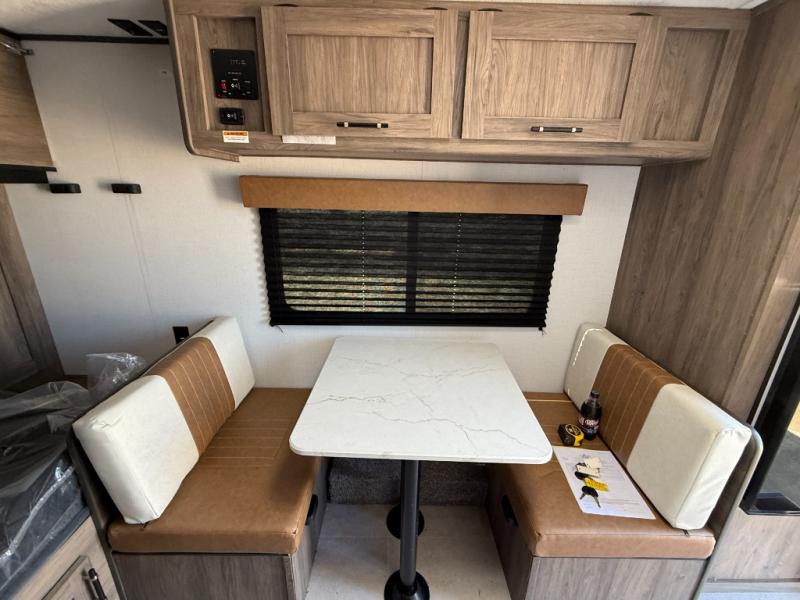 This compact, yet cozy travel trailer is perfect for weekend trips to the lake. There is a full-size bed up front with a fold-down bunk above, plus a wardrobe for clothes. A functional kitchenette will let you make meals for your crew, and there is a booth dinette where you can dine together!