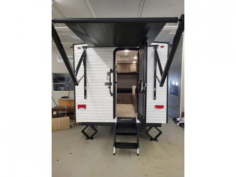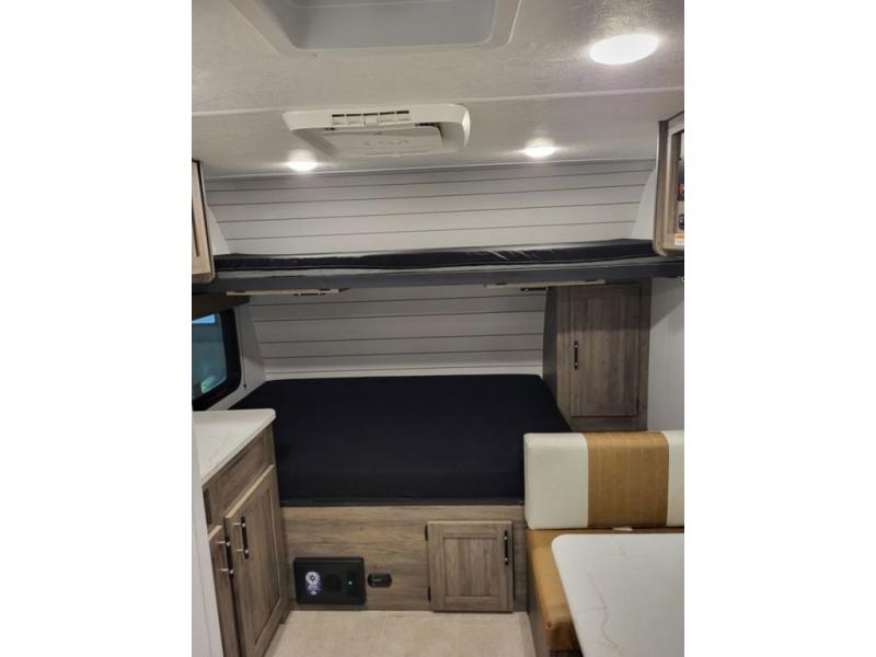 This compact, yet cozy travel trailer is perfect for weekend trips to the lake. There is a full-size bed up front with a fold-down bunk above, plus a wardrobe for clothes. A functional kitchenette will let you make meals for your crew, and there is a booth dinette where you can dine together!