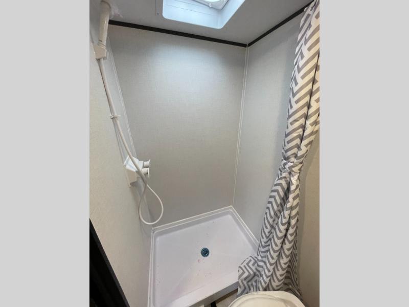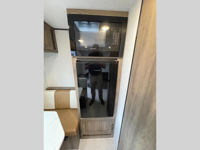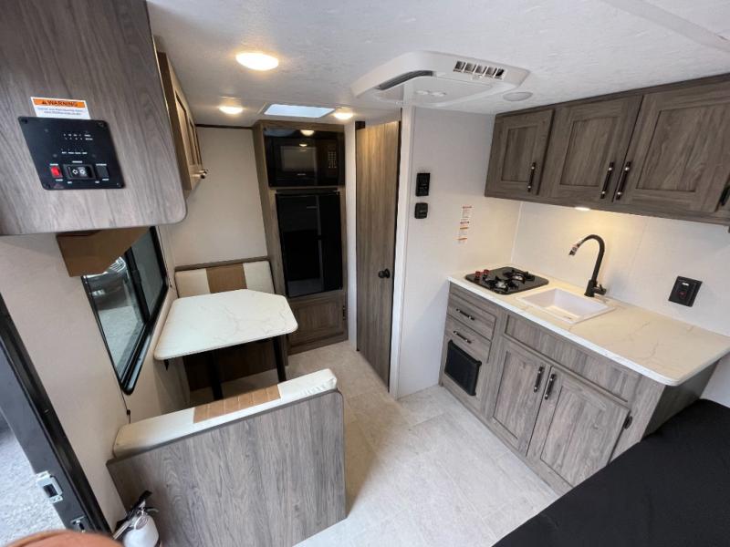 This compact, yet cozy travel trailer is perfect for weekend trips to the lake. There is a full-size bed up front with an overhead cabinet for your belongings. A functional kitchenette will let you make meals for your crew, and there is a booth dinette where you can dine together. There are also overhead cabinets above the dinette for snacks, board games and more!