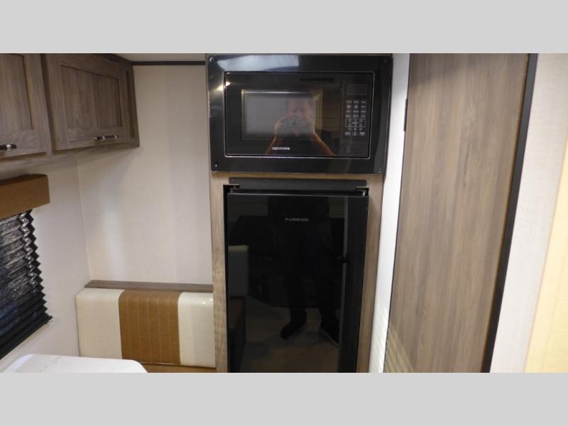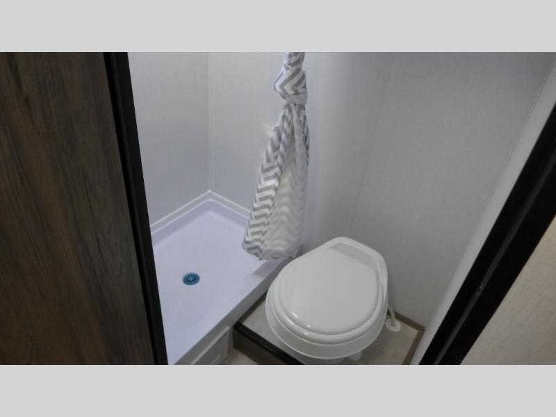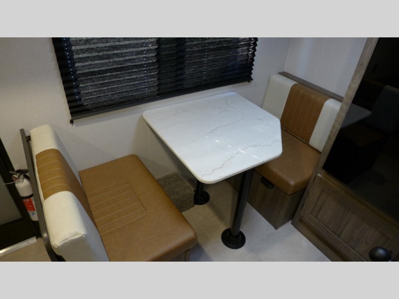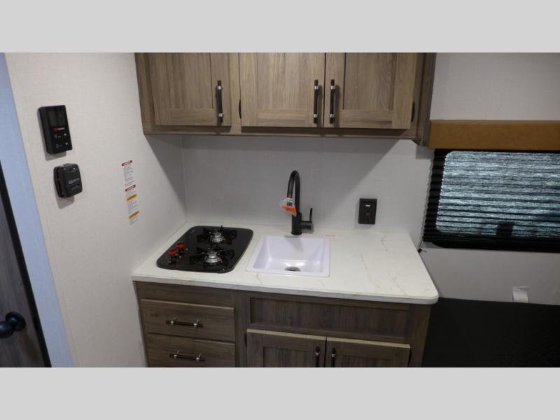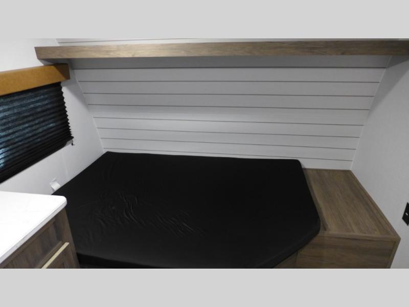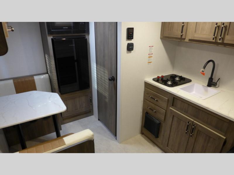 This compact, yet cozy travel trailer is perfect for weekend trips to the lake. There is a full-size bed up front with an overhead cabinet for your belongings. A functional kitchenette will let you make meals for your crew, and there is a booth dinette where you can dine together. There are also overhead cabinets above the dinette for snacks, board games and more!