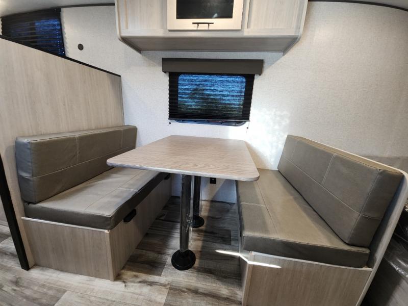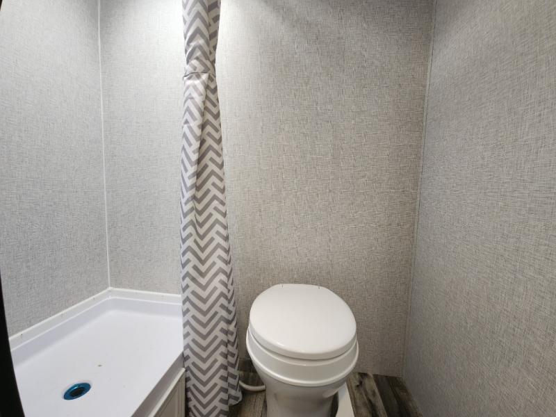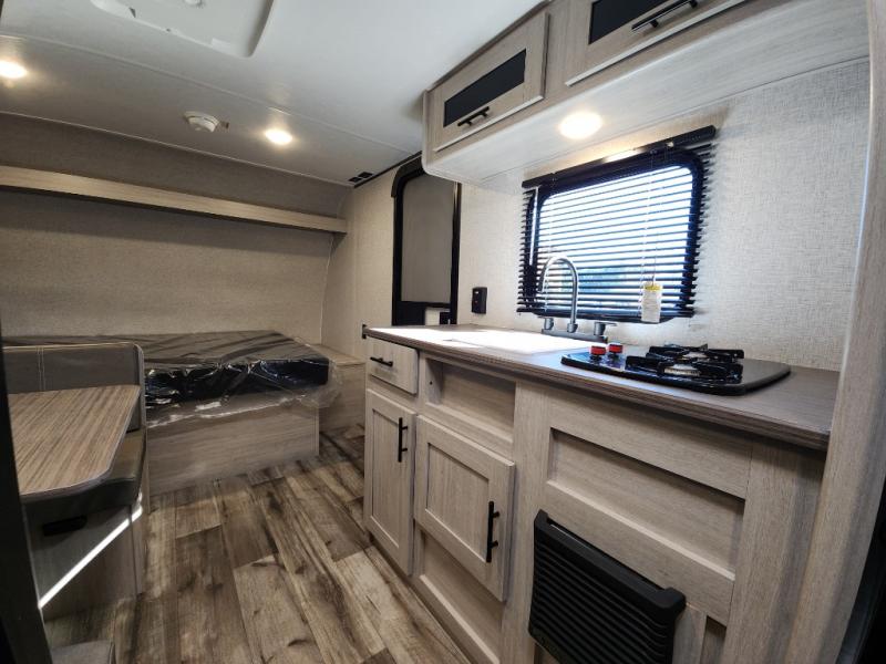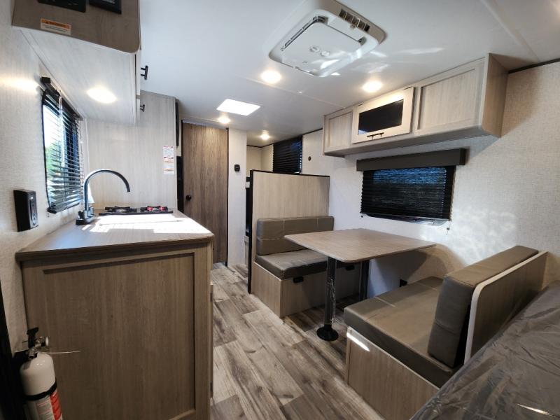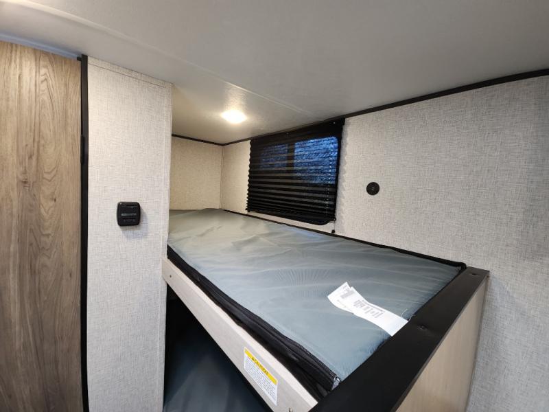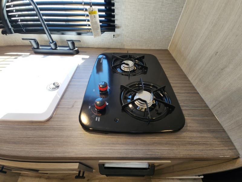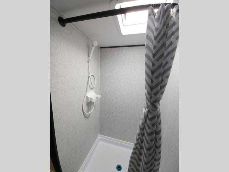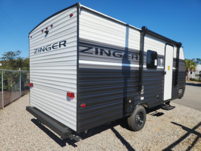 This Zinger Lite travel trailer is perfect for your next family vacation or weekend at the lake with friends. With room for five, this unit gives you the space you need to pack up the kids and the dog and get ready to hit the road! With an RV queen bed and bunk beds, everyone will have a place to sleep. The 38" booth dinette can comfortably hold one to two little ones or an adult guest. Use the two burner range to make a home-cooked meal and easily store your leftovers in the 12V refrigerator. Enjoy extra privacy with a rear corner bath that includes a 30" x 36" shower. This unit features multiple overhead compartments, so bring along the board games and other valuables from home.