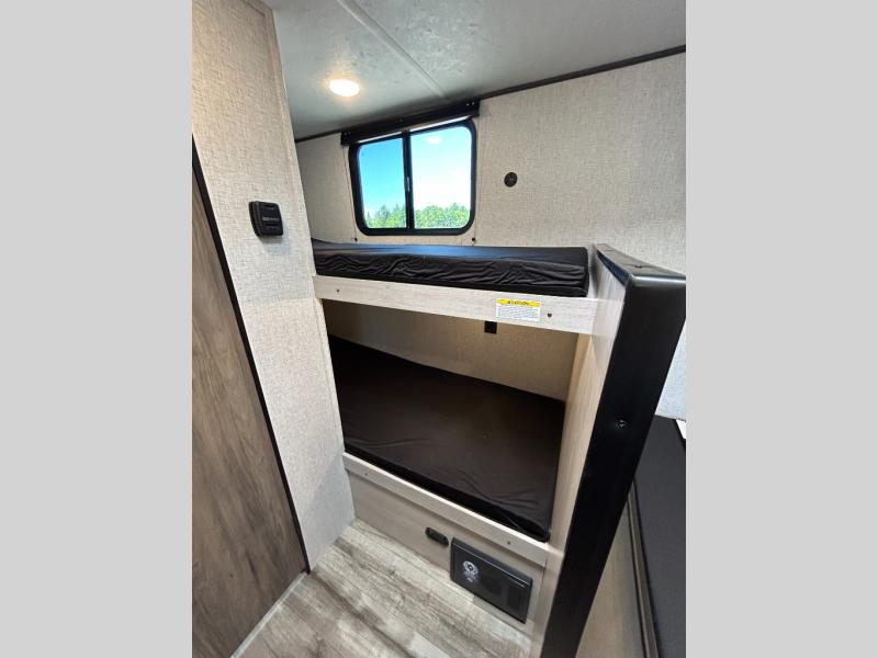This Zinger Lite travel trailer is perfect for your next family vacation or weekend at the lake with friends. With room for five, this unit gives you the space you need to pack up the kids and the dog and get ready to hit the road! With an RV queen bed and bunk beds, everyone will have a place to sleep. The 38" booth dinette can comfortably hold one to two little ones or an adult guest. Use the two burner range to make a home-cooked meal and easily store your leftovers in the 12V refrigerator. Enjoy extra privacy with a rear corner bath that includes a 30" x 36" shower. This unit features multiple overhead compartments, so bring along the board games and other valuables from home.