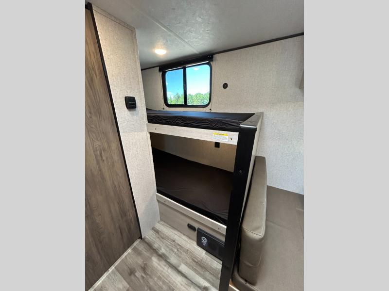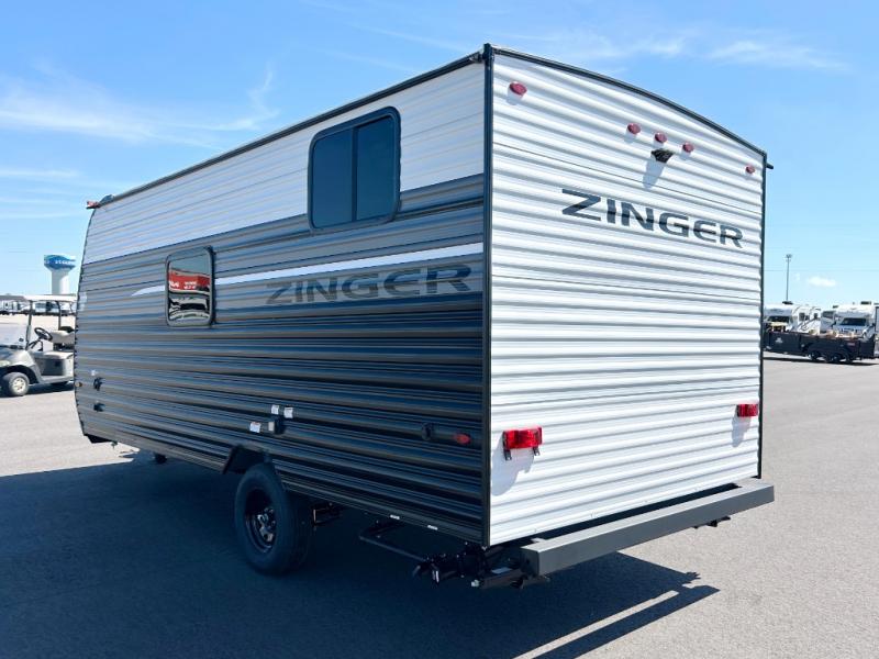 This Zinger Lite travel trailer is perfect for your next family vacation or weekend at the lake with friends. With room for five, this unit gives you the space you need to pack up the kids and the dog and get ready to hit the road! With an RV queen bed and bunk beds, everyone will have a place to sleep. The 38" booth dinette can comfortably hold one to two little ones or an adult guest. Use the two burner range to make a home-cooked meal and easily store your leftovers in the 12V refrigerator. Enjoy extra privacy with a rear corner bath that includes a 30" x 36" shower. This unit features multiple overhead compartments, so bring along the board games and other valuables from home.