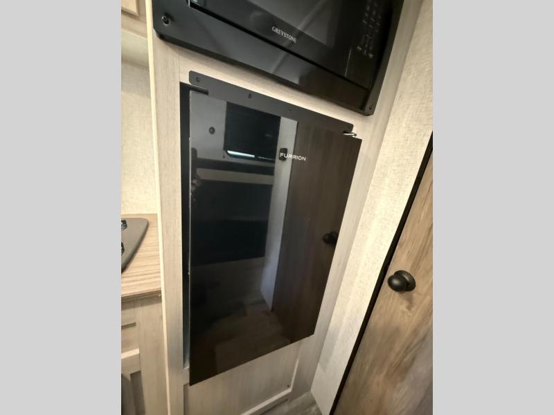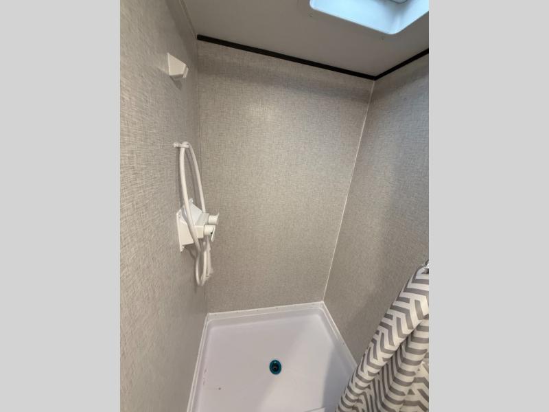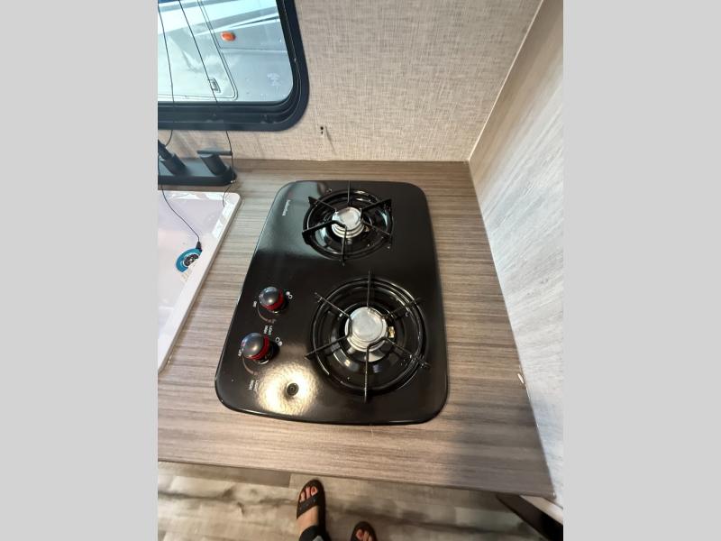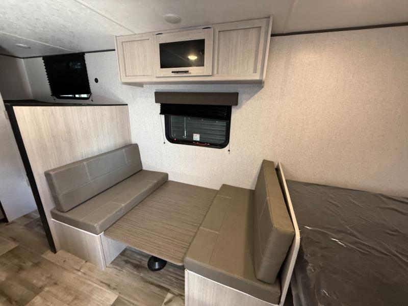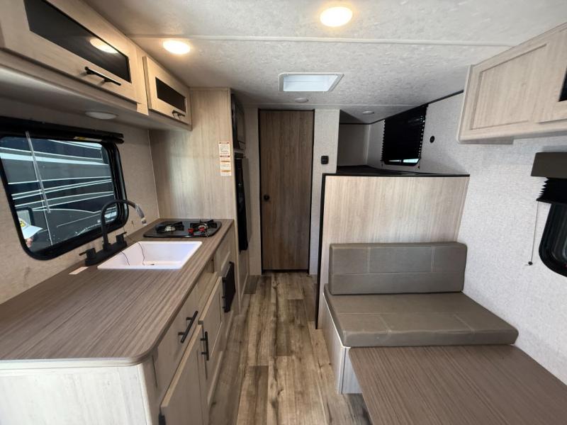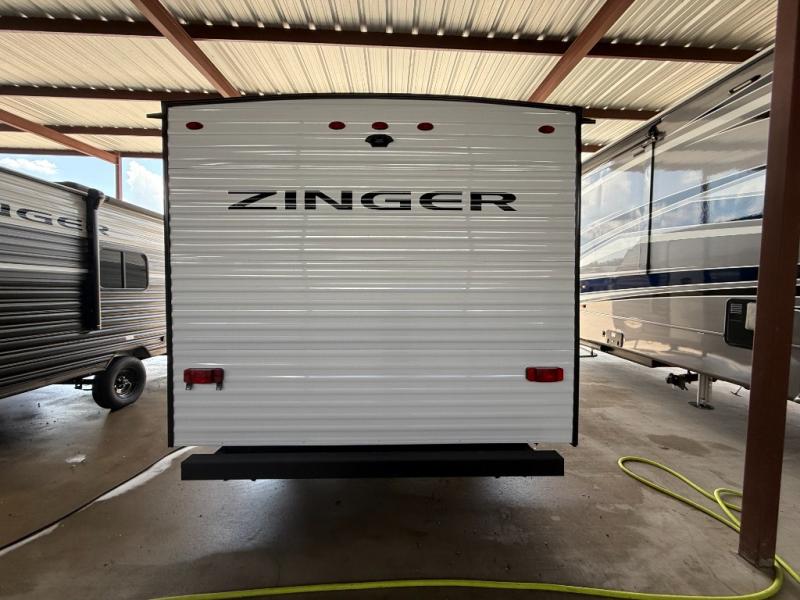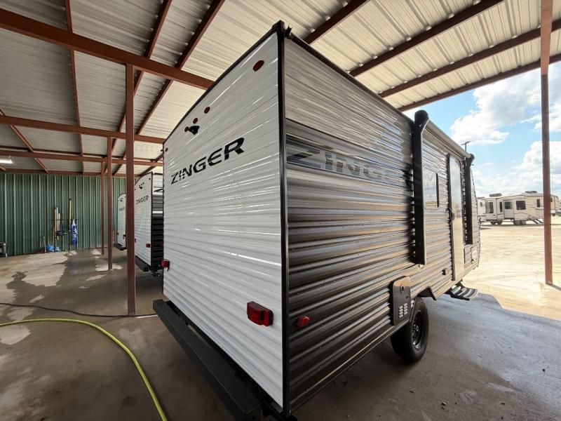 This Zinger Lite travel trailer is perfect for your next family vacation or weekend at the lake with friends. With room for five, this unit gives you the space you need to pack up the kids and the dog and get ready to hit the road! With an RV queen bed and bunk beds, everyone will have a place to sleep. The 38" booth dinette can comfortably hold one to two little ones or an adult guest. Use the two burner range to make a home-cooked meal and easily store your leftovers in the 12V refrigerator. Enjoy extra privacy with a rear corner bath that includes a 30" x 36" shower. This unit features multiple overhead compartments, so bring along the board games and other valuables from home.