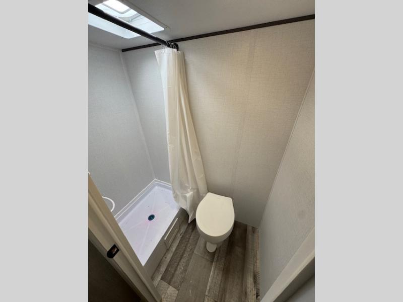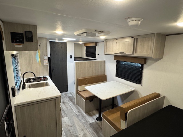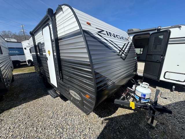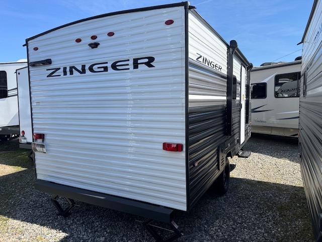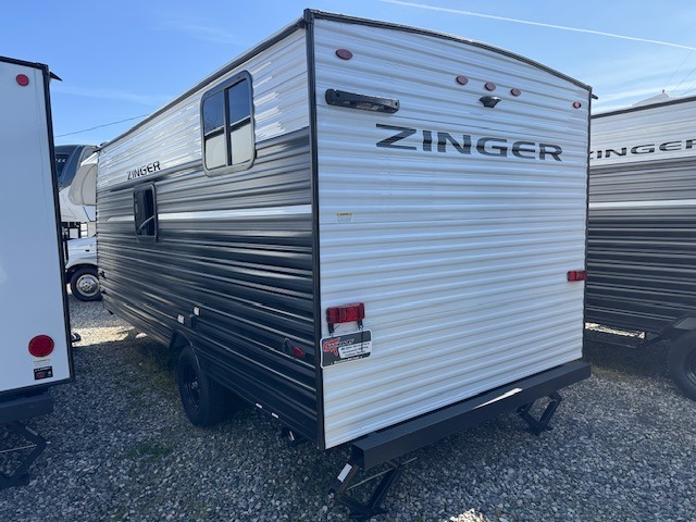 This Zinger Lite travel trailer is perfect for your next family vacation or weekend at the lake with friends. With room for five, this unit gives you the space you need to pack up the kids and the dog and get ready to hit the road! With an RV queen bed and bunk beds, everyone will have a place to sleep. The 38" booth dinette can comfortably hold one to two little ones or an adult guest. Use the two burner range to make a home-cooked meal and easily store your leftovers in the 12V refrigerator. Enjoy extra privacy with a rear corner bath that includes a 30" x 36" shower. This unit features multiple overhead compartments, so bring along the board games and other valuables from home.