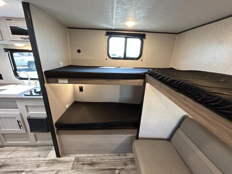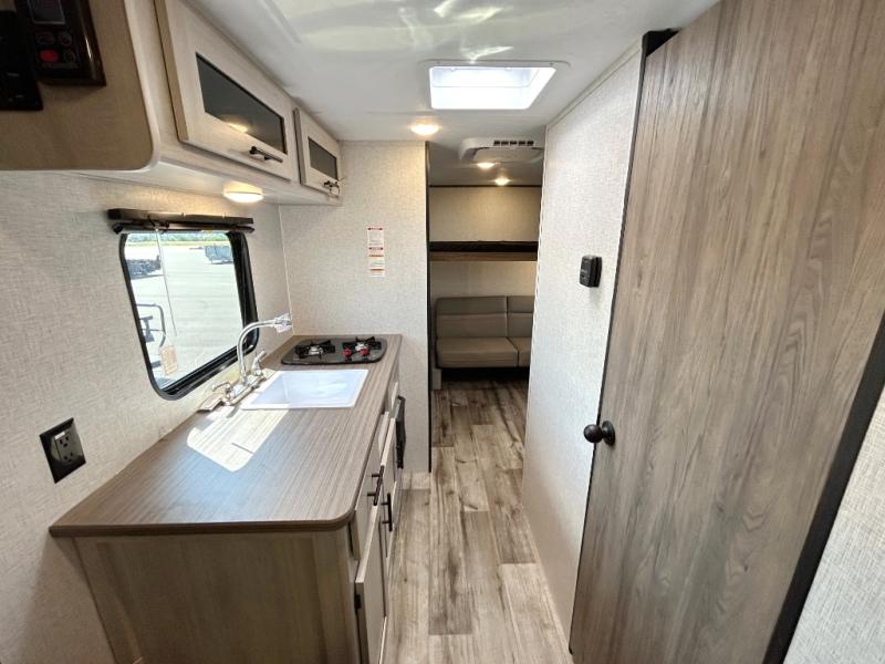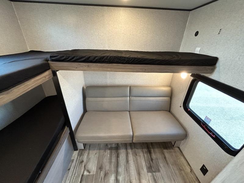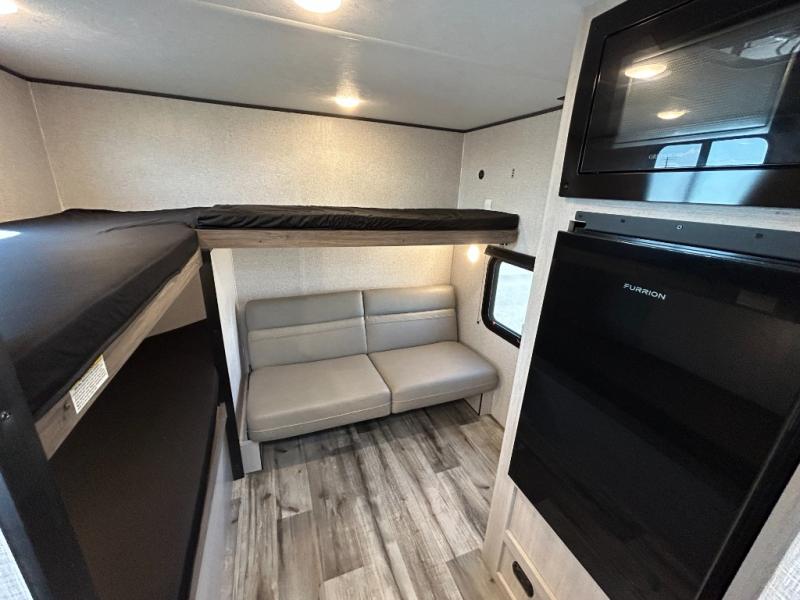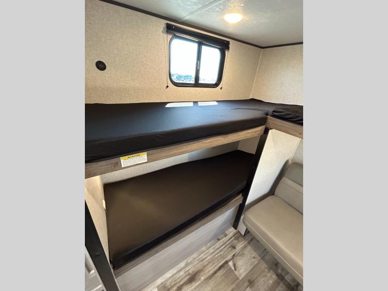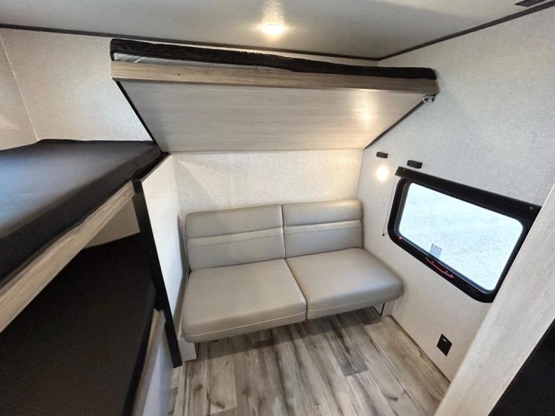 This is the perfect travel trailer to bring along guests or little ones since there are bunk beds in the back, along with a third bunk above a jackknife sofa. There is also a fold-up table by the sofa where you can dine at each day. This Zinger Lite kitchen includes a microwave oven, cooktop, and a 12V refrigerator for perishables. When you're ready for some shut-eye, the RV queen bed up front will provide a great night's rest, and there is bedroom overhead storage for your belongings.
