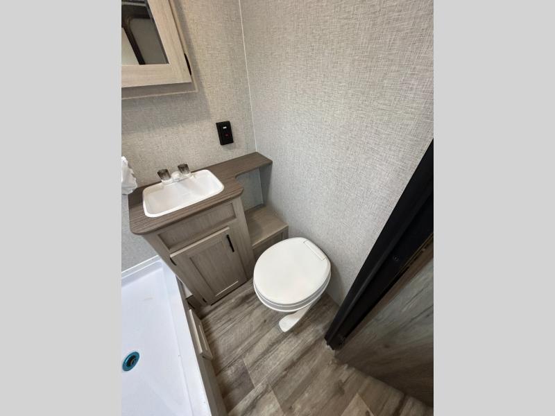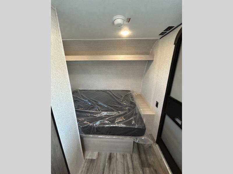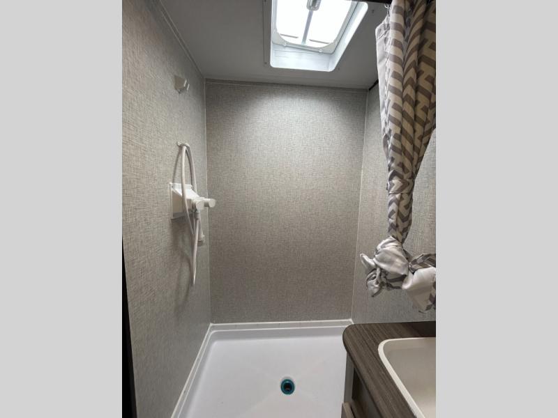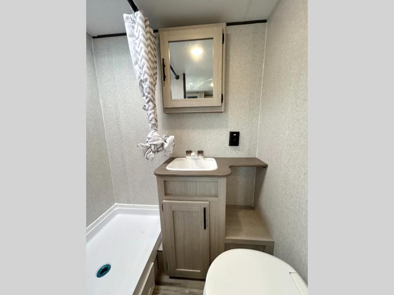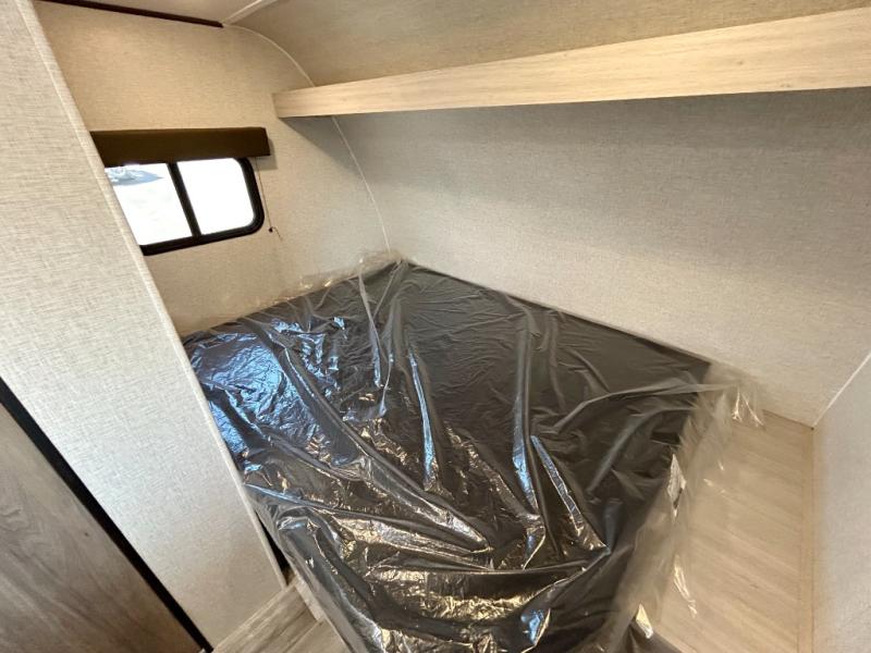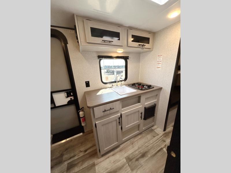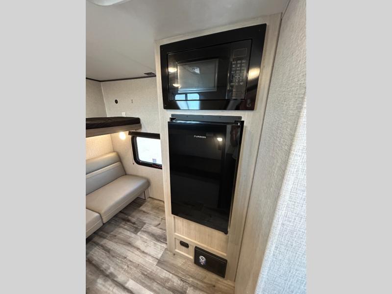 This is the perfect travel trailer to bring along guests or little ones since there are bunk beds in the back, along with a third bunk above a jackknife sofa. There is also a fold-up table by the sofa where you can dine at each day. This Zinger Lite kitchen includes a microwave oven, cooktop, and a 12V refrigerator for perishables. When you're ready for some shut-eye, the RV queen bed up front will provide a great night's rest, and there is bedroom overhead storage for your belongings.