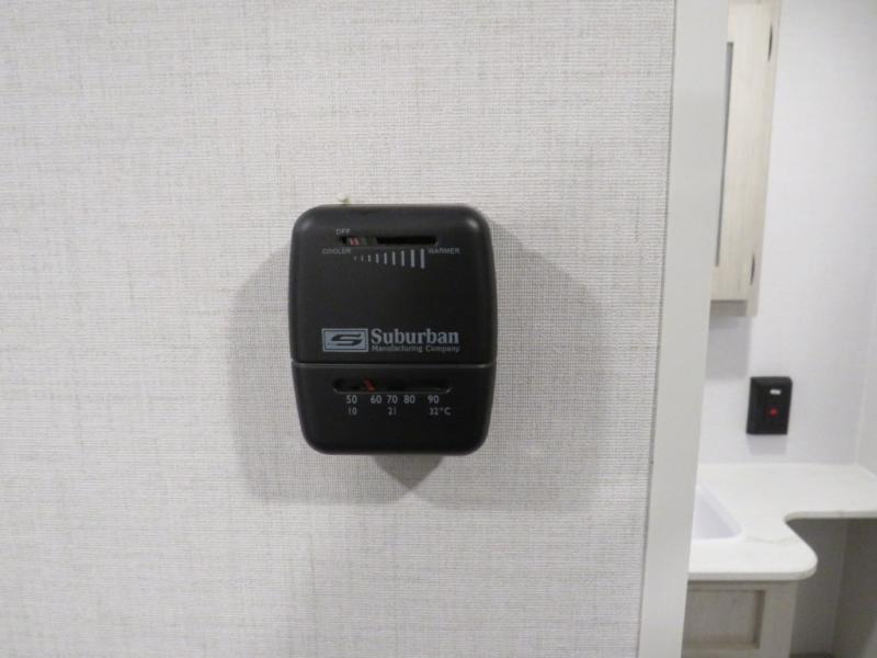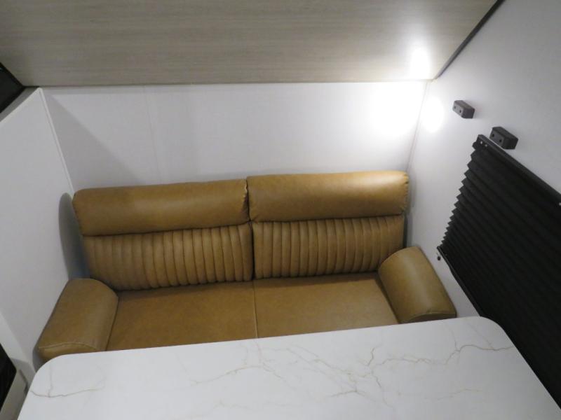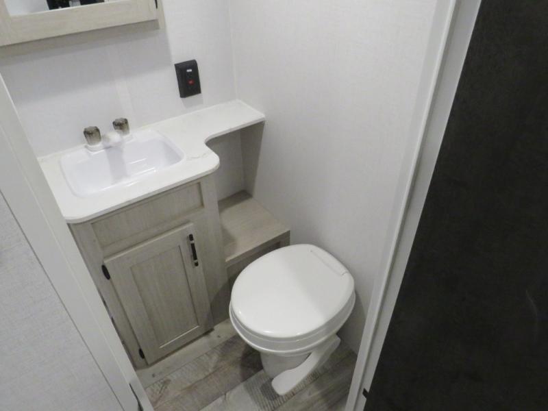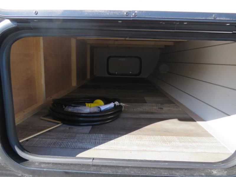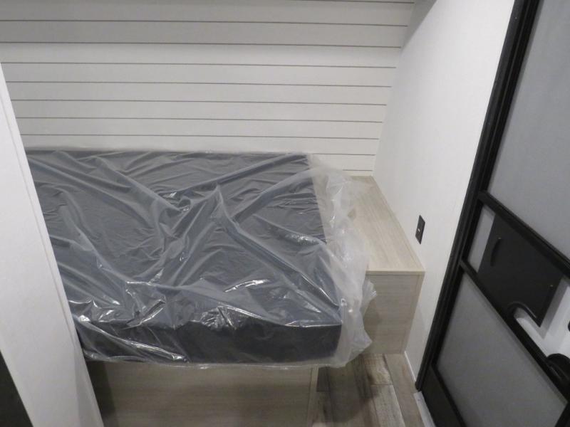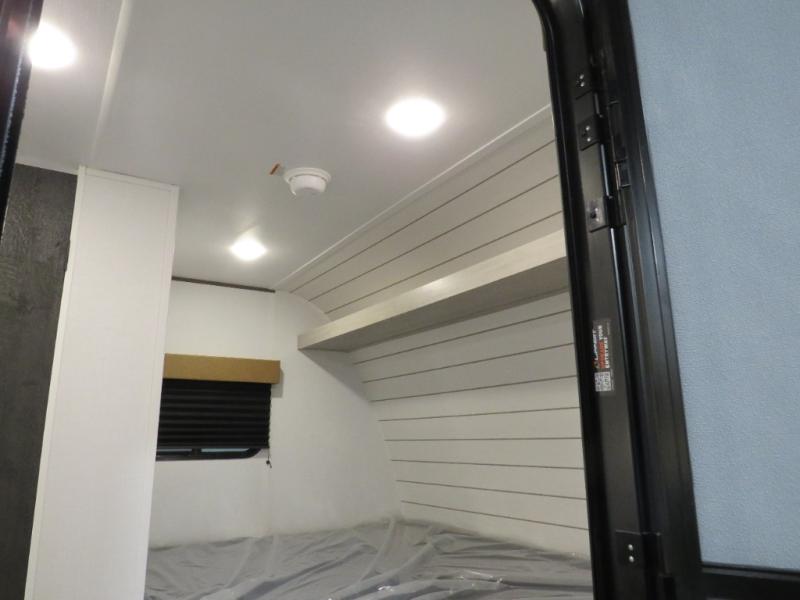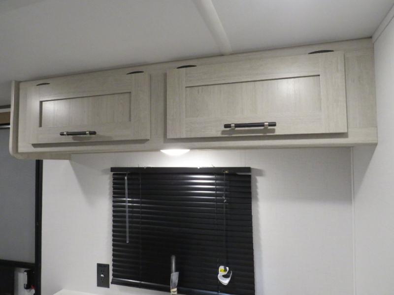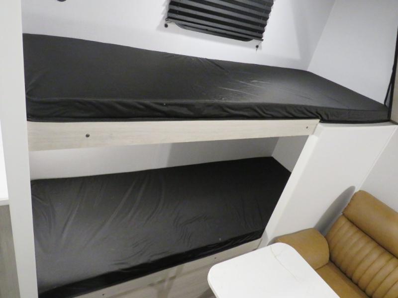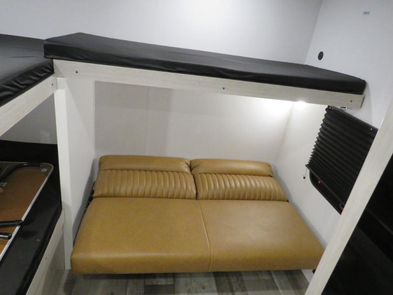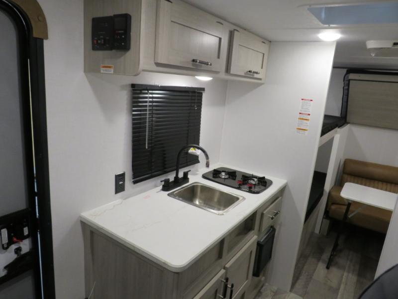 This is the perfect travel trailer to bring along guests or little ones since there are bunk beds in the back, along with a third bunk above a jackknife sofa. There is also a fold-up table by the sofa where you can dine at each day. This Zinger Lite kitchen includes a microwave oven, cooktop, and a 12V refrigerator for perishables. When you're ready for some shut-eye, the RV queen bed up front will provide a great night's rest, and there is bedroom overhead storage for your belongings.