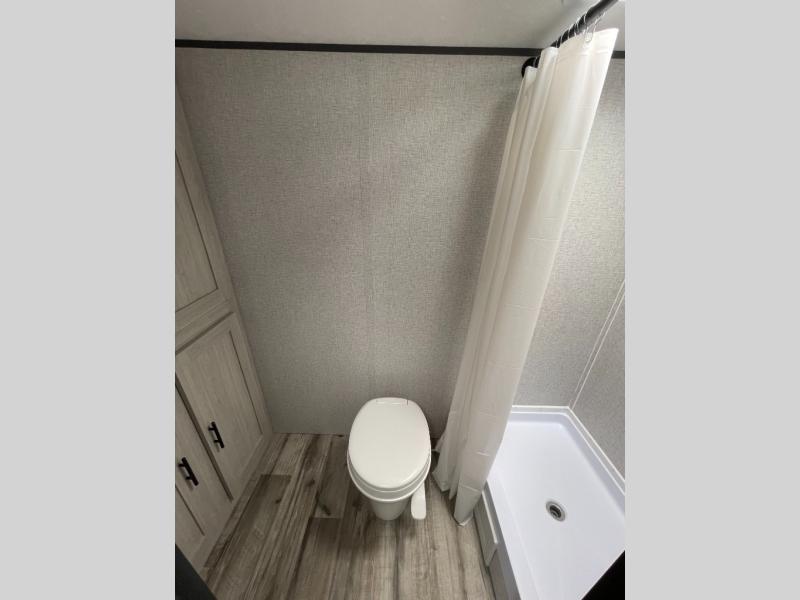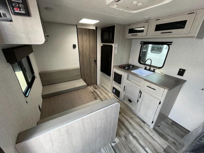 You and your spouse will love camping in this Zinger Lite travel trailer! The full rear bathroom has a 36" shower for you to rinse off the day and a linen closet to store your towels. You can prepare home-cooked meals with the two burner cooktop and enjoy eating them at the booth dinette. You will also start each day feeling ready to go after sleeping on the front RV queen bed with an overhead shelf for your belongings.