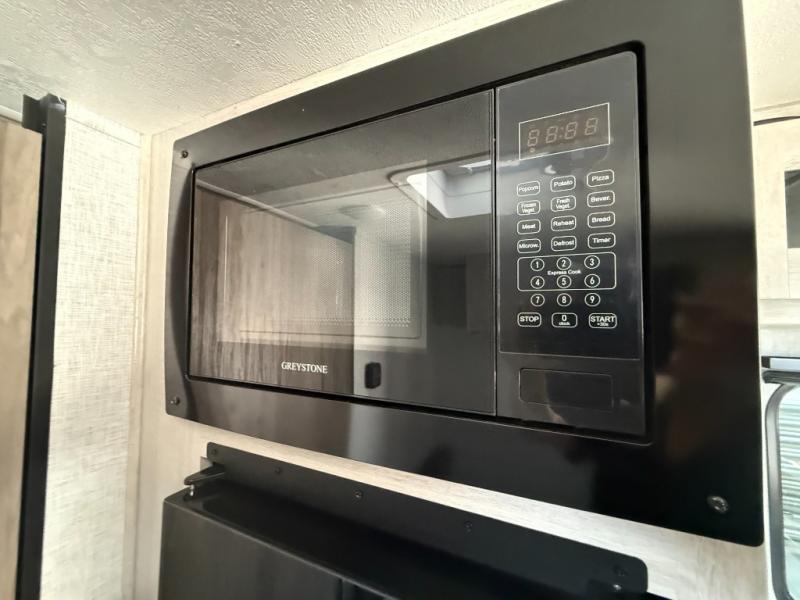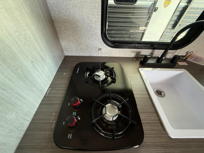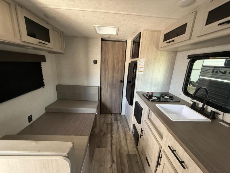 You and your spouse will love camping in this Zinger Lite travel trailer! The full rear bathroom has a 36" shower for you to rinse off the day and a linen closet to store your towels. You can prepare home-cooked meals with the two burner cooktop and enjoy eating them at the booth dinette. You will also start each day feeling ready to go after sleeping on the front RV queen bed with an overhead shelf for your belongings.
