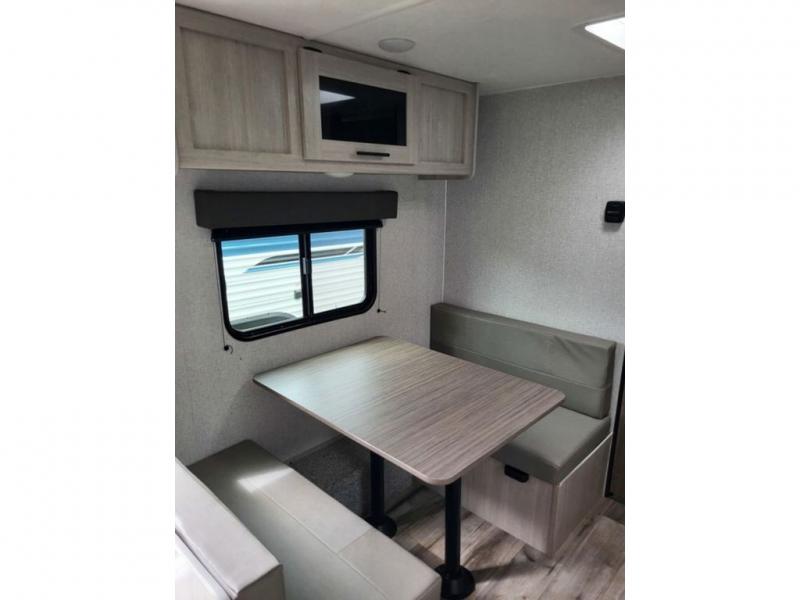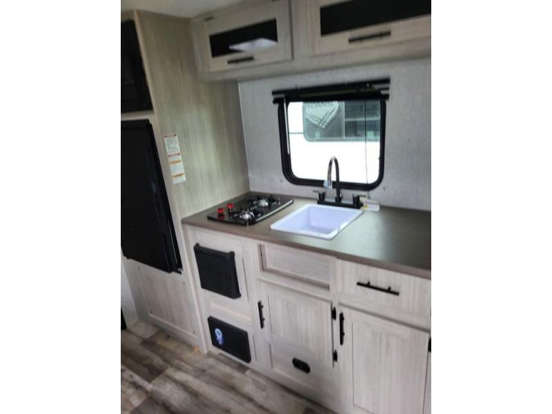 You and your spouse will love camping in this Zinger Lite travel trailer! The full rear bathroom has a 36" shower for you to rinse off the day and a linen closet to store your towels. You can prepare home-cooked meals with the two burner cooktop and enjoy eating them at the booth dinette. You will also start each day feeling ready to go after sleeping on the front RV queen bed with an overhead shelf for your belongings.
