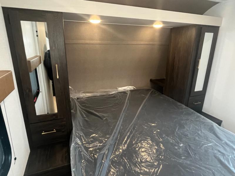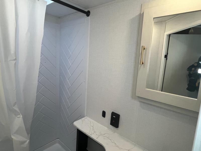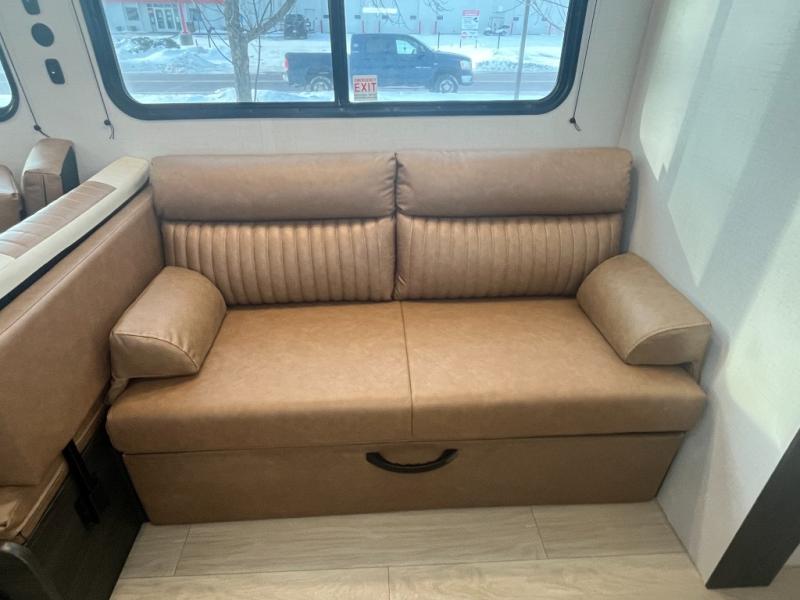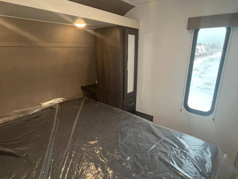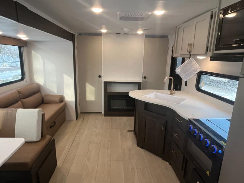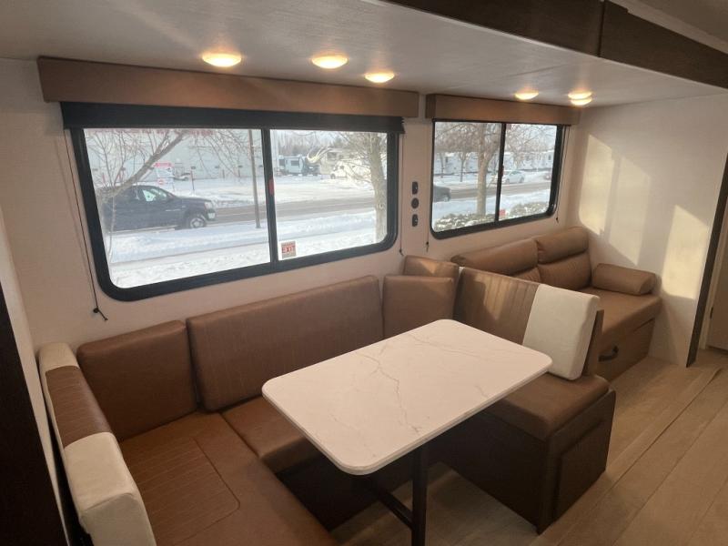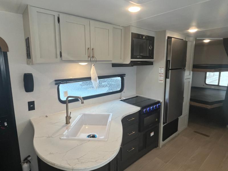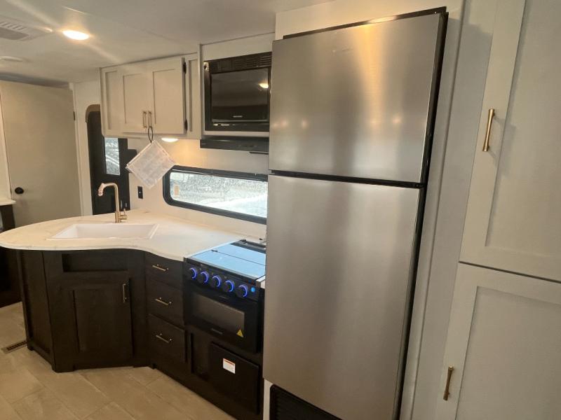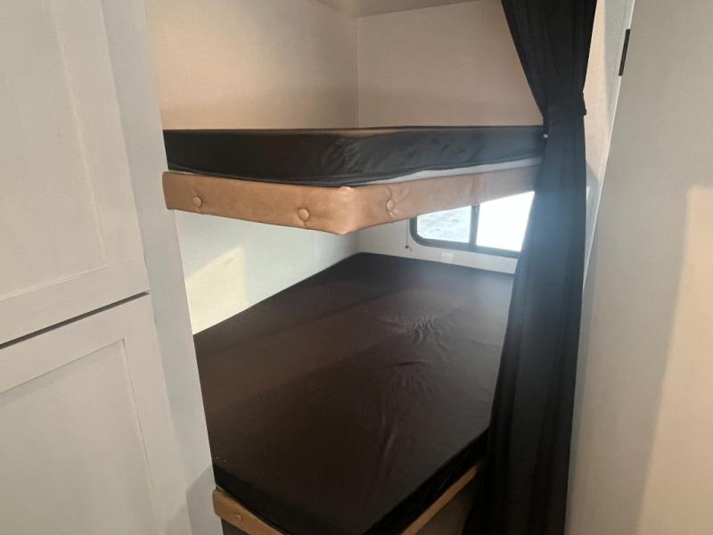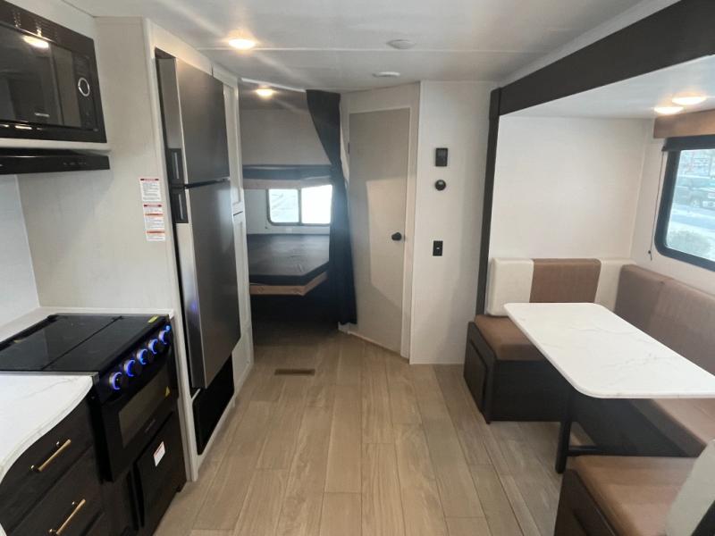 If you've been searching for a travel trailer that can sleep more campers and give you more interior space, this is the one! There are double-size bunks with a ladder for the little ones, an RV queen bed in the front bedroom, plus a jackknife sofa and booth dinette that will double as seating and sleeping space. You will be able to make home cooked meals for your crew since there is a three burner range with a glass top and LED lit knobs, and the 10 cu. ft. 12V refrigerator can keep your food fresh. This model also includes a full bath with a 30" x 36" shower, a foot flush toilet, and a medicine cabinet to keep items organized.
