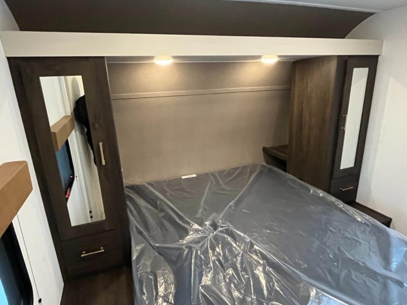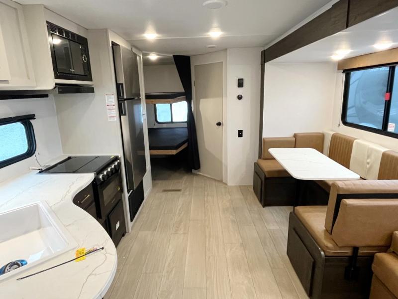 If you've been searching for a travel trailer that can sleep more campers and give you more interior space, this is the one! There are double-size bunks with a ladder for the little ones, an RV queen bed in the front bedroom, plus a jackknife sofa and booth dinette that will double as seating and sleeping space. You will be able to make home cooked meals for your crew since there is a three burner range with a glass top and LED lit knobs, and the 10 cu. ft. 12V refrigerator can keep your food fresh. This model also includes a full bath with a 30" x 36" shower, a foot flush toilet, and a medicine cabinet to keep items organized.